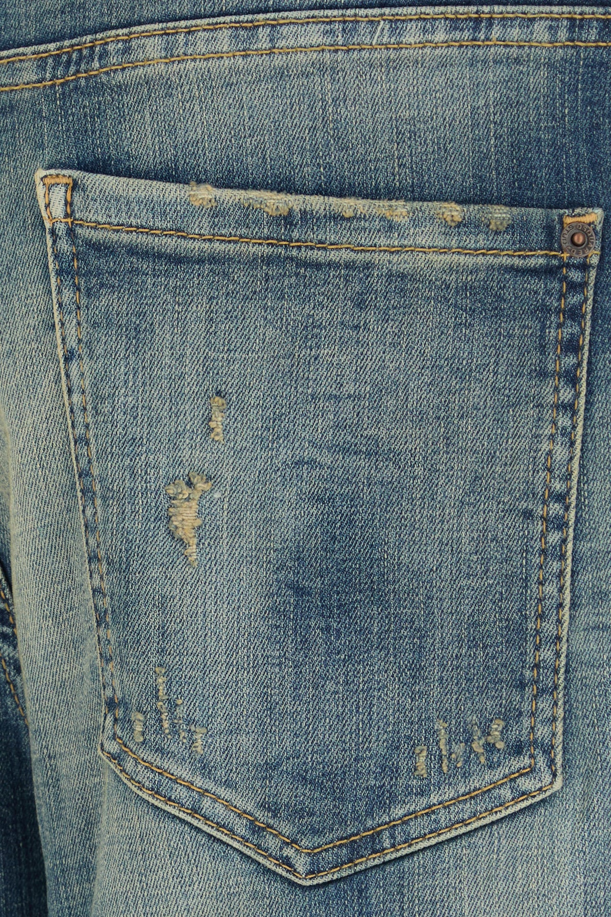 Jeans realized in vintage-effect distressed stretch cotton blend denim enriched by leather logoed label at the back.