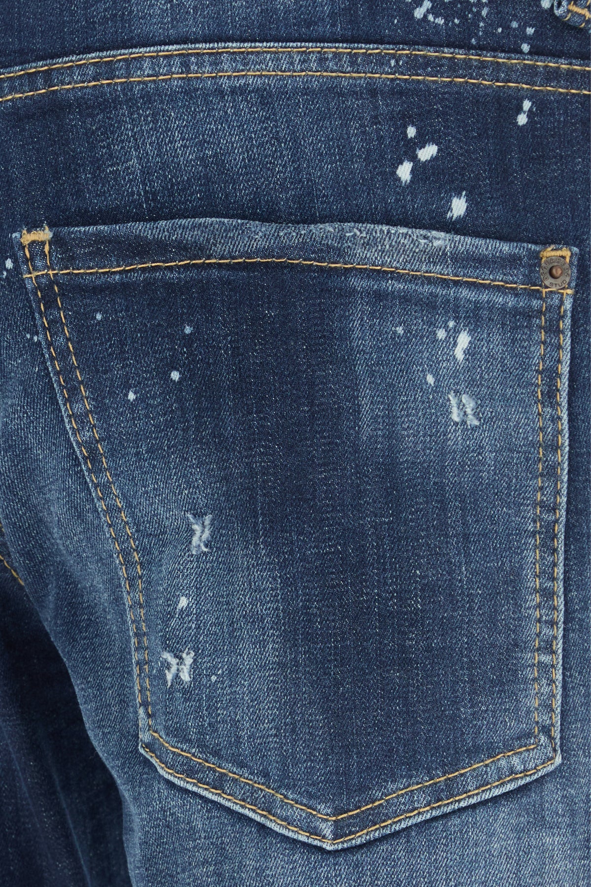 Skinny jeans realized in stonewashed and distressed stretch cotton denim characterized by intentional dirties on the entire surface.