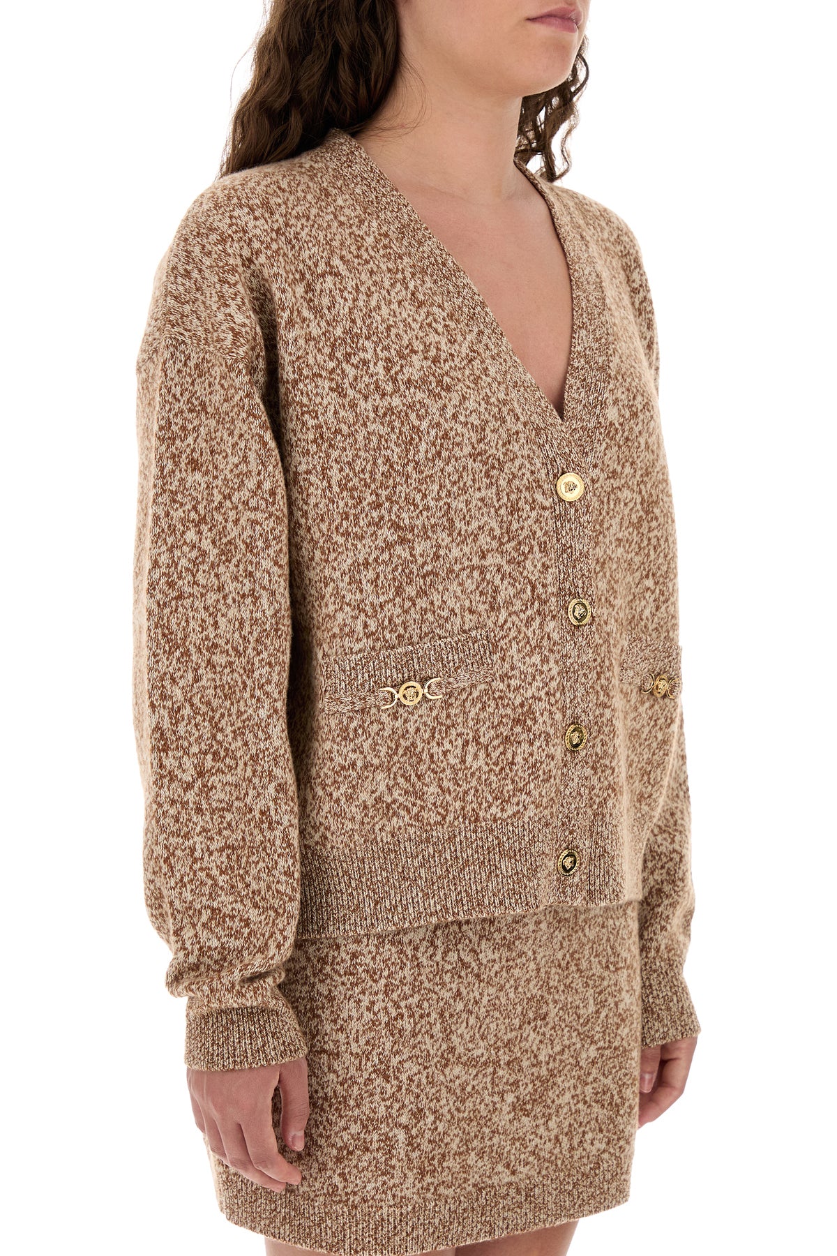Cardigan realized in virgin wool blend characterized by Medusa buttons closure at the front.