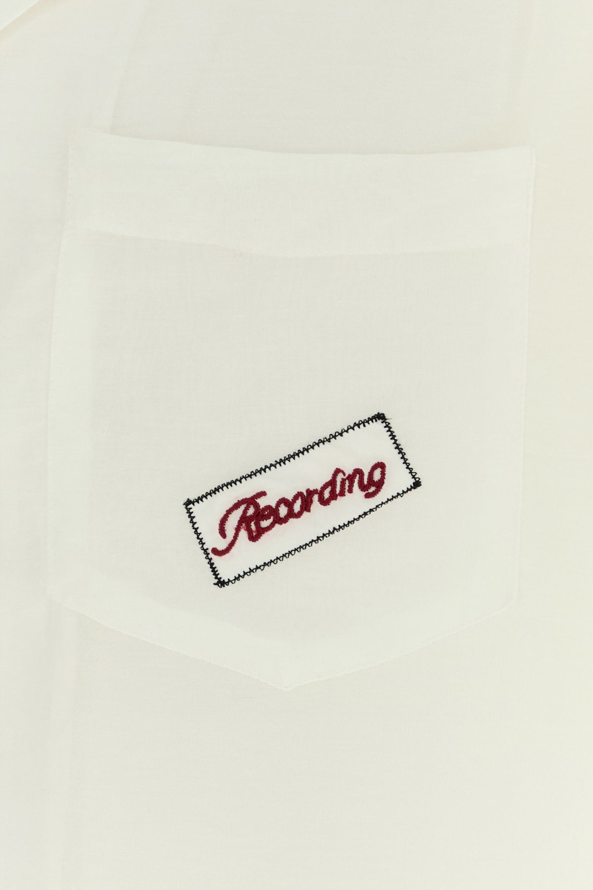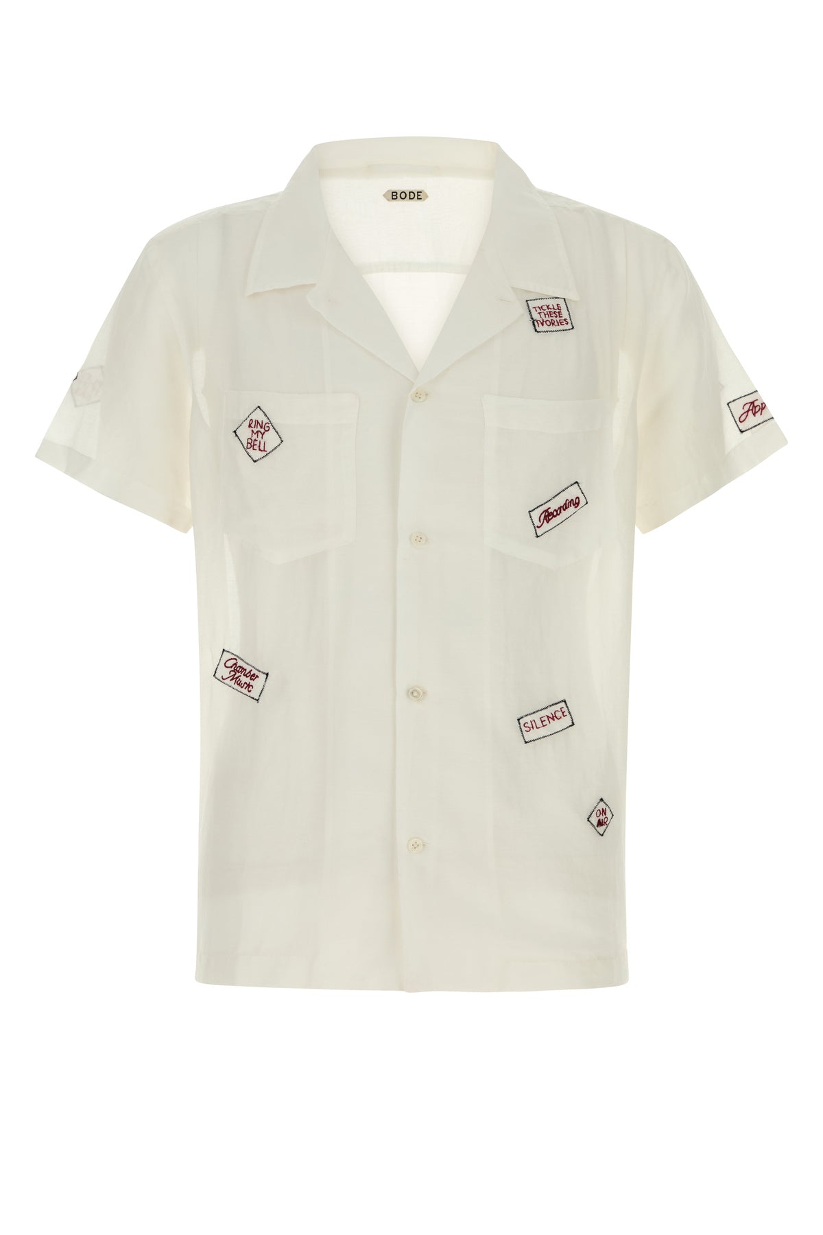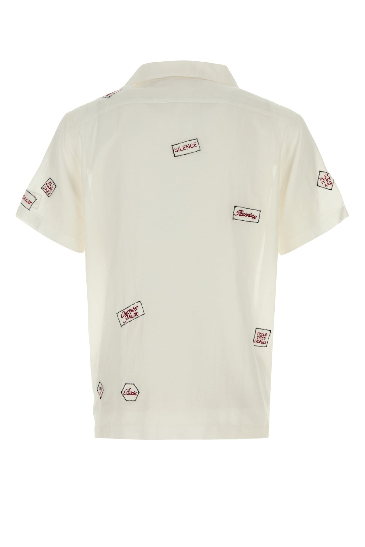 Short-sleeves shirt realized in cotton and silk characterized by “Silence,” “Ring My Bell,” “Tickle These Ivories” embroideries on the entire surface.