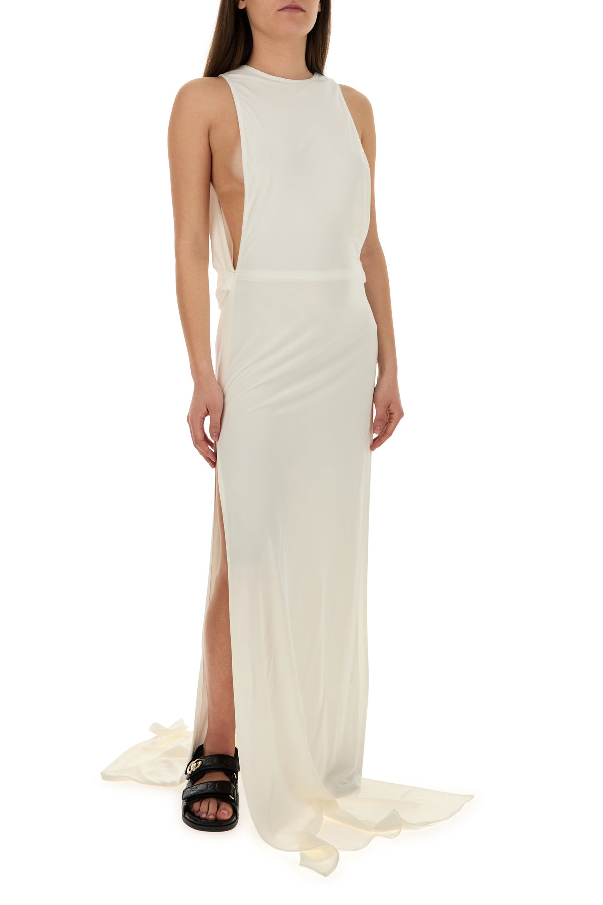 Long dress realized in viscose crepe characterized by deep lateral slits on the hemline.