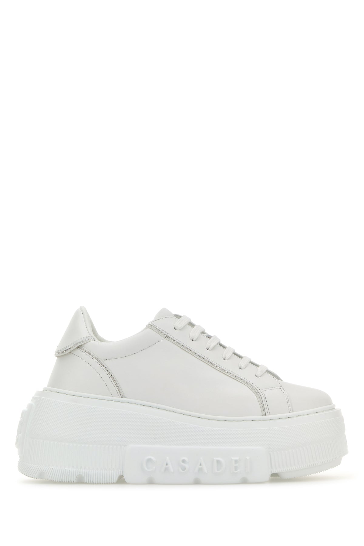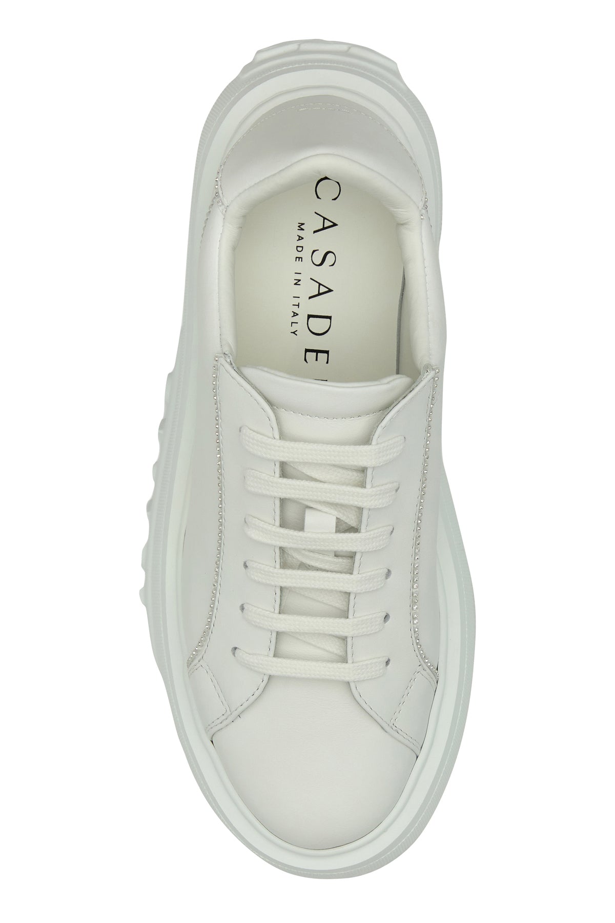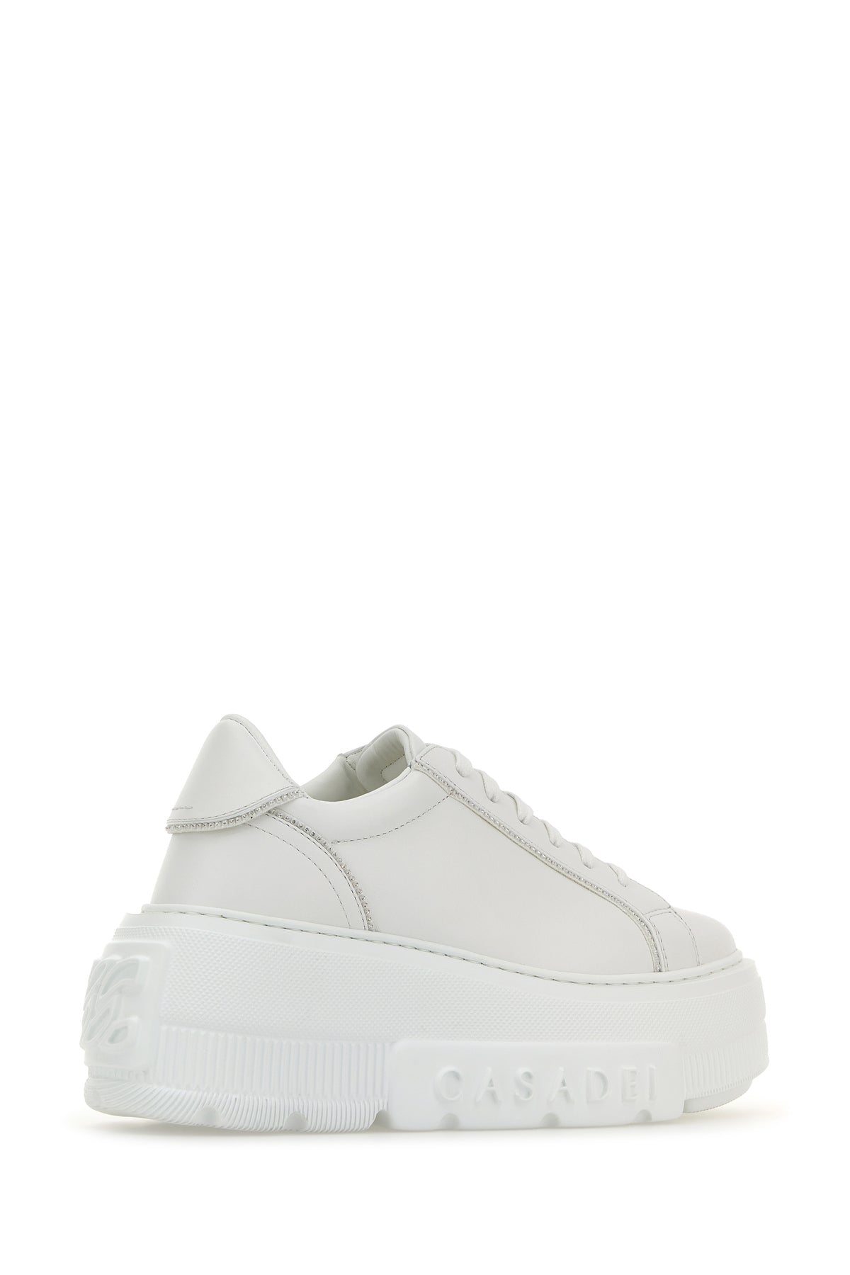 Sneakers realized in smooth calf leather characterized by logo in relief on the sole enriched by rhinestones.