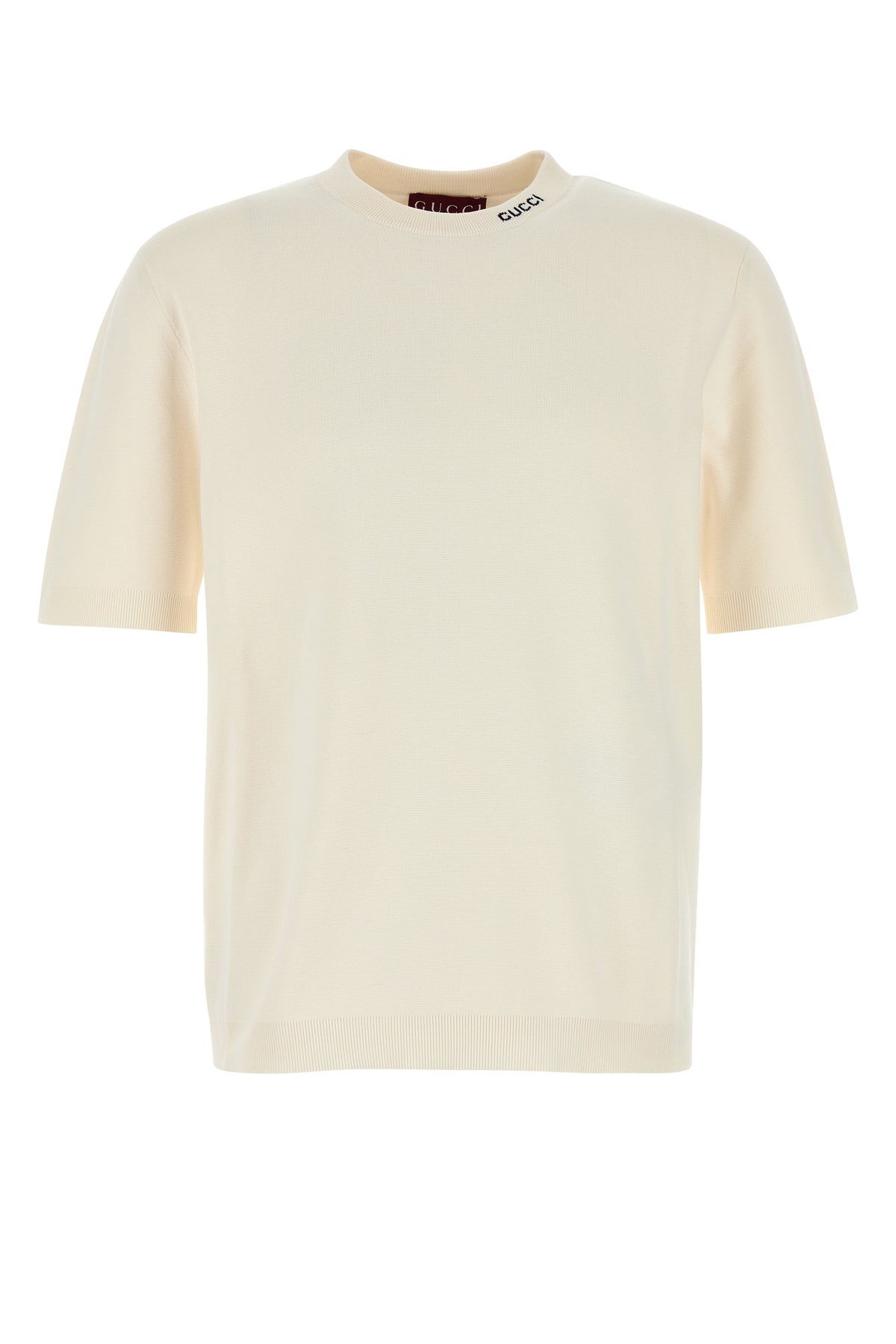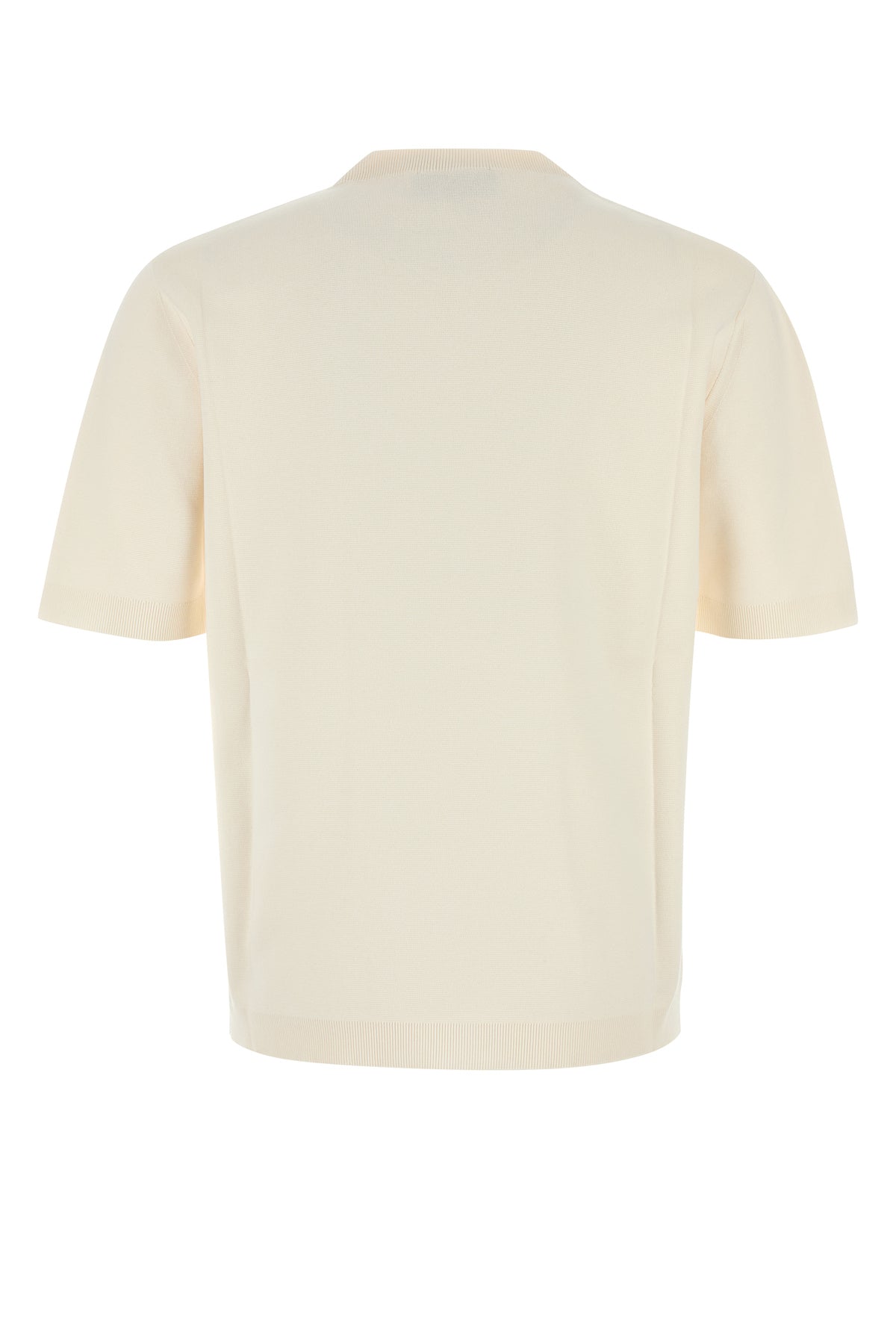 Short-sleeves sweater realized in silk and cotton characterized by contrasting embroidered logo on the ribbed crew-neck.