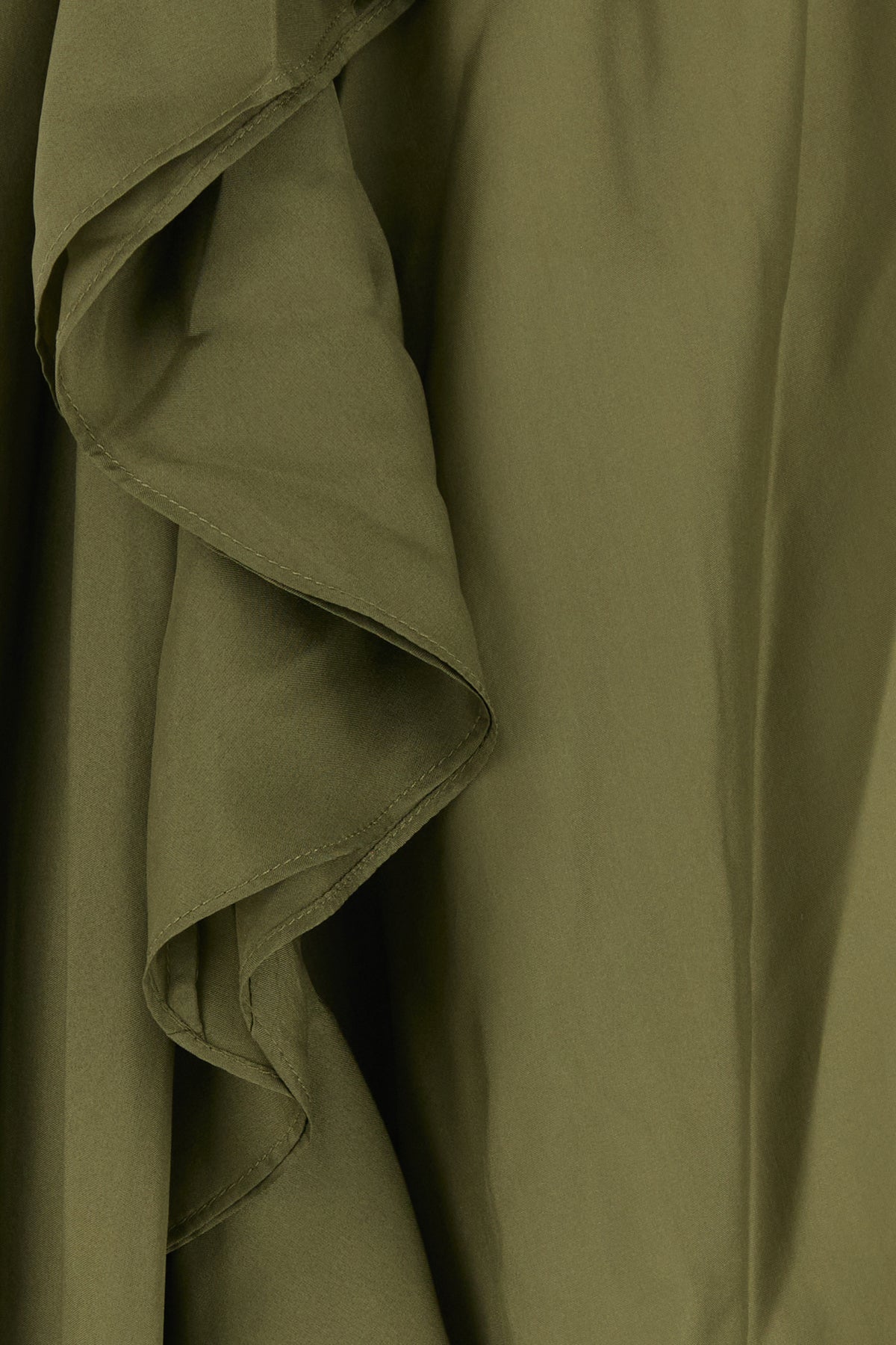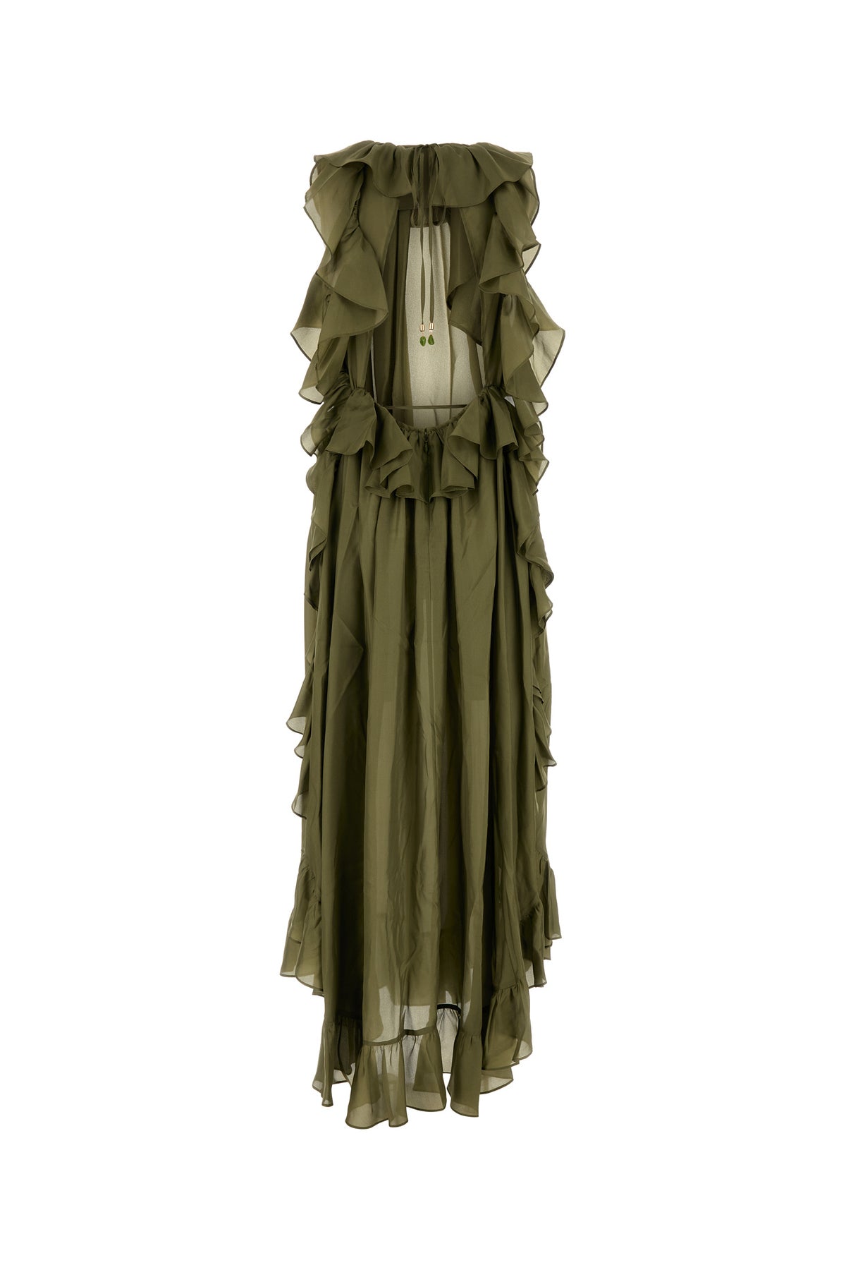 Abito realizzato in pura seta caratterizzato da volant sui lati e sul fondo.