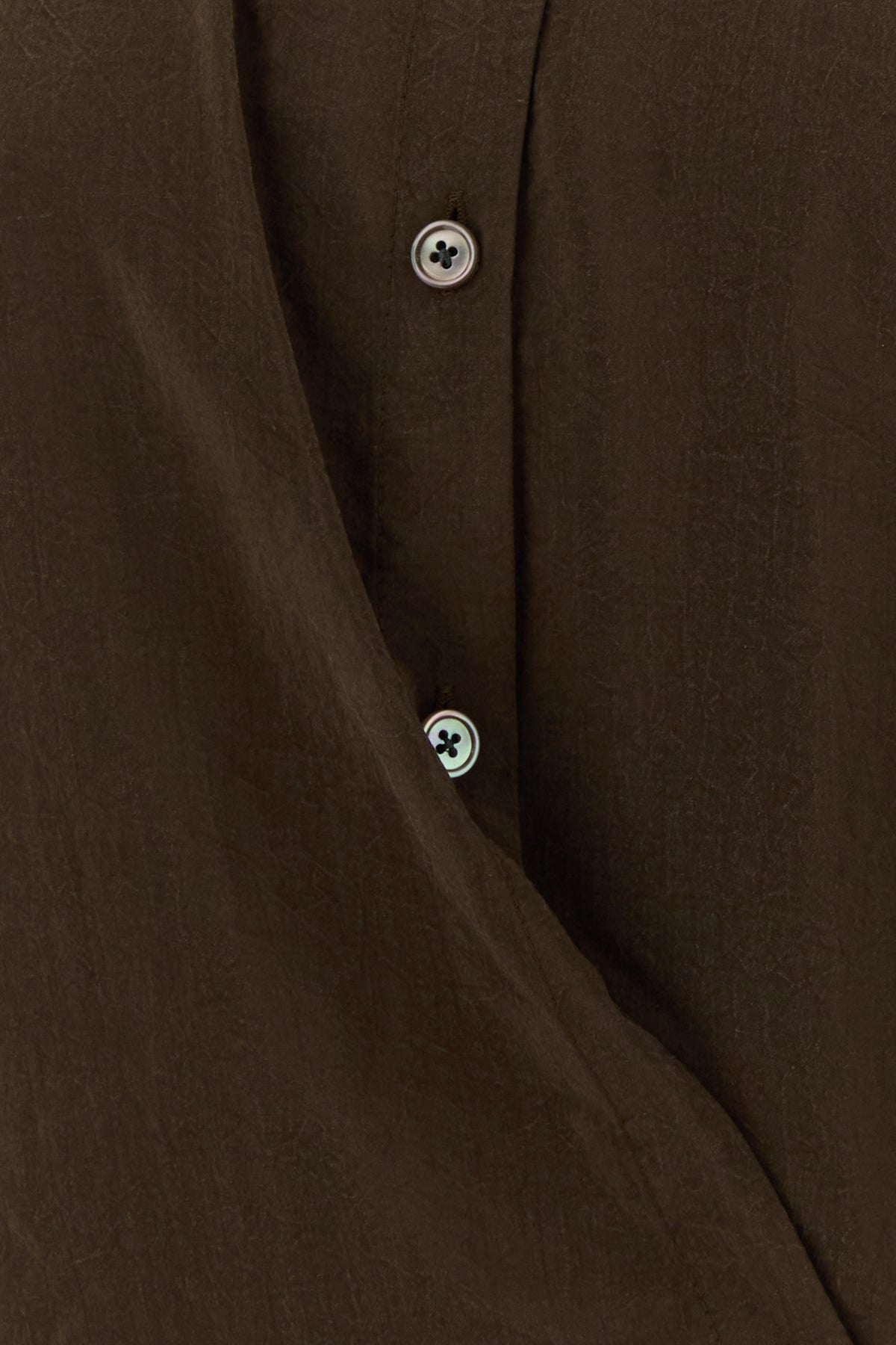 Abito chemisier realizzato in misto seta caratterizzato da chiusura a portafoglio mediante laccetti da annodare a scomparsa e bottoni a vista.