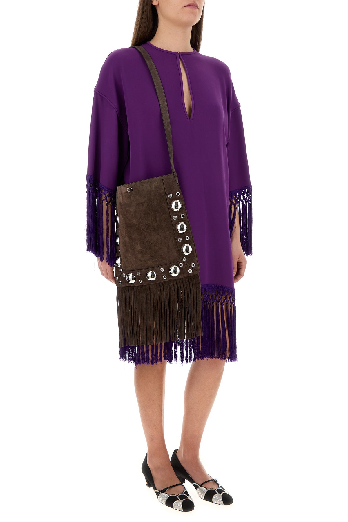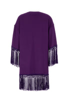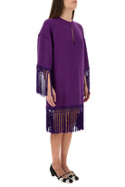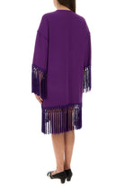 Abito realizzato in cady di pura seta arricchito da nappine decorative sui polsini e sul fondo.