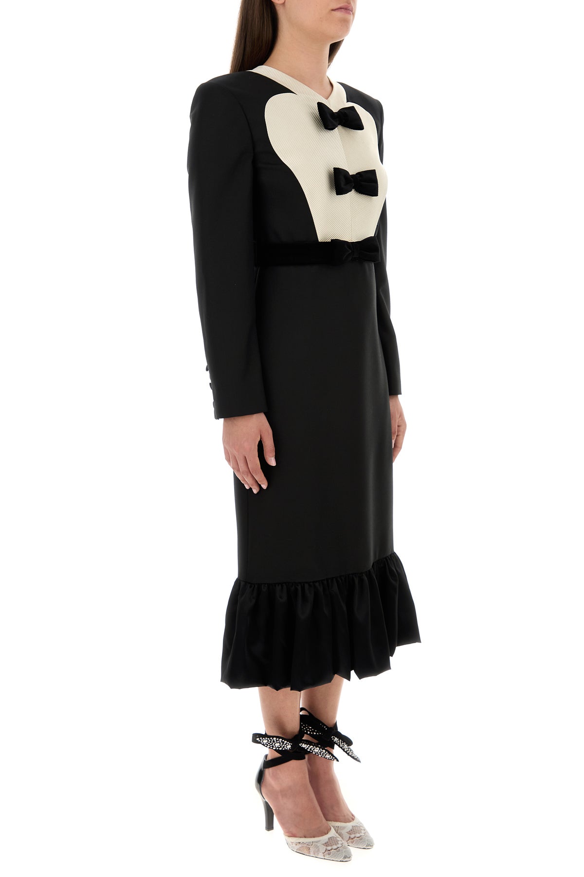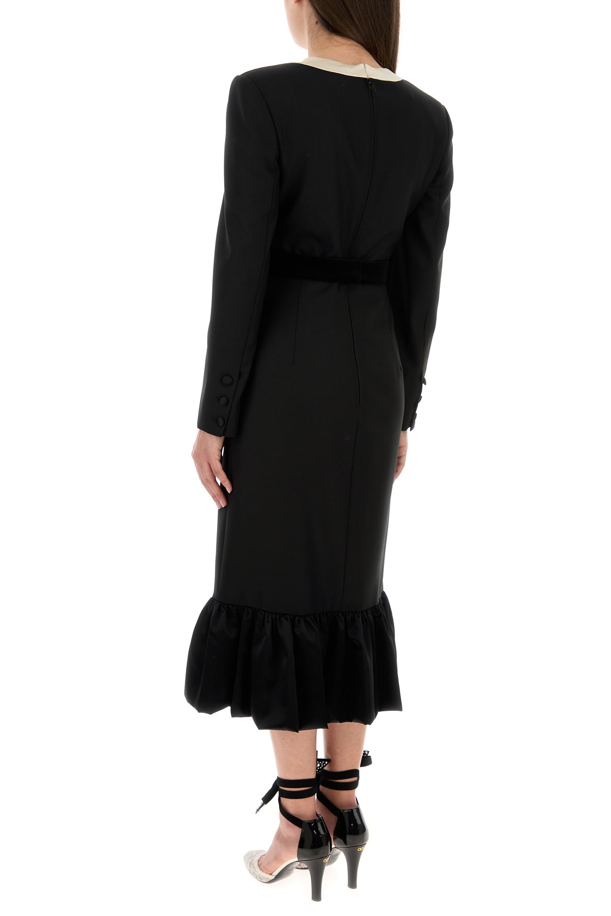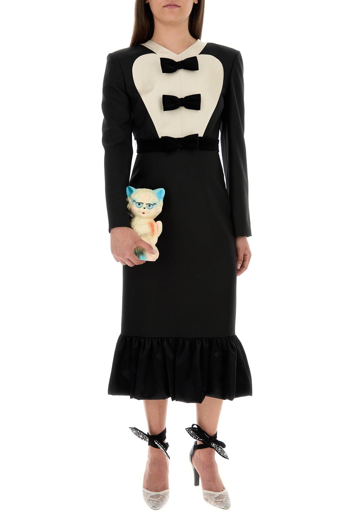Abito midi realizzato in pura lana vergine caratterizzato da plastron a contrasto con fiocchi in velluto sulla parte superiore.