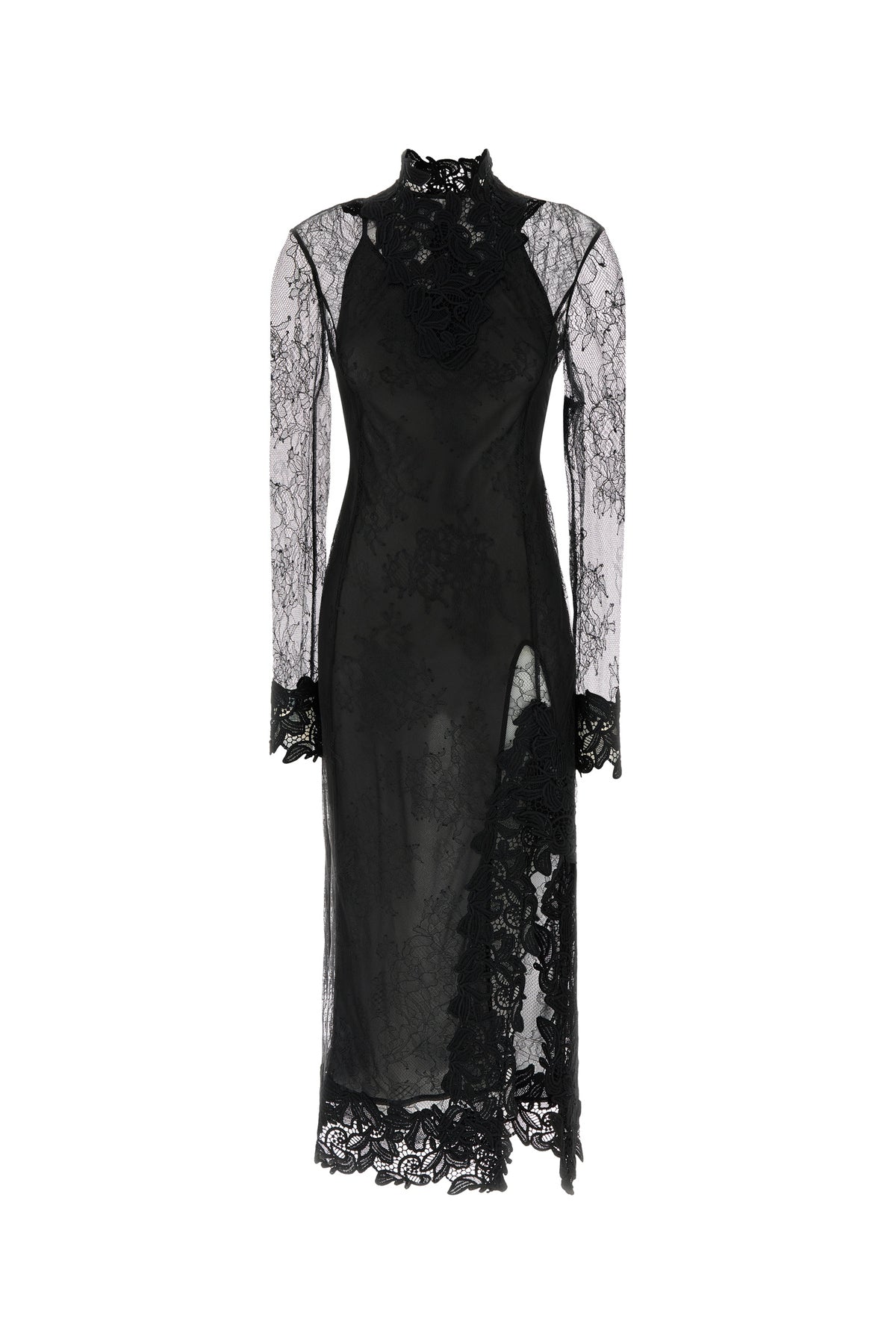 Abito realizzato in pizzo caratterizzato da spacco laterale sul fondo.