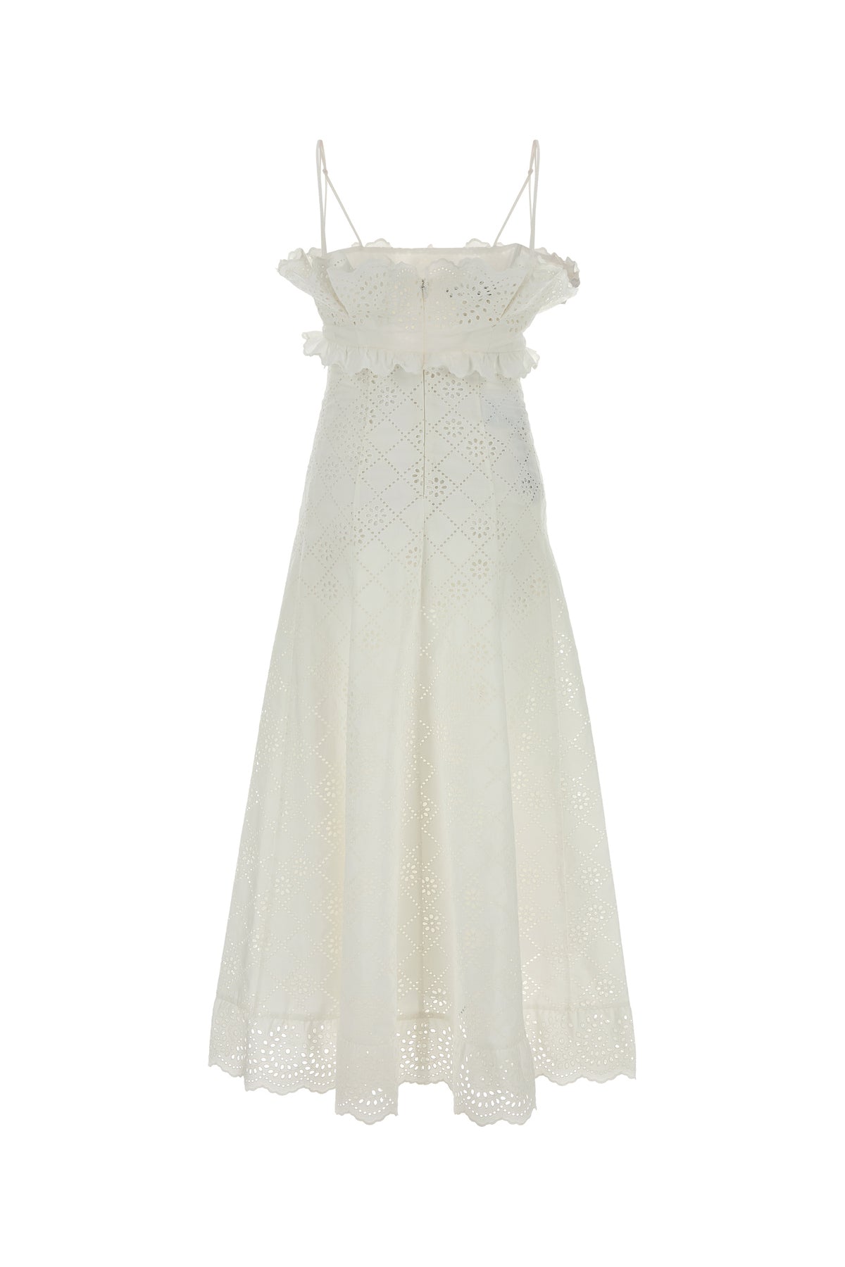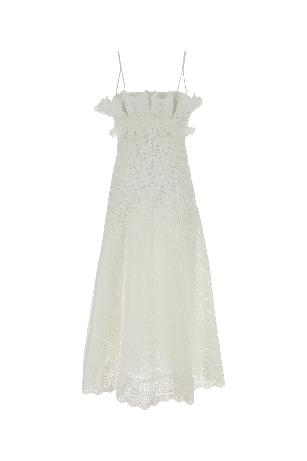 Abito realizzato in pizzo sangallo caratterizzato da fondo svasato.