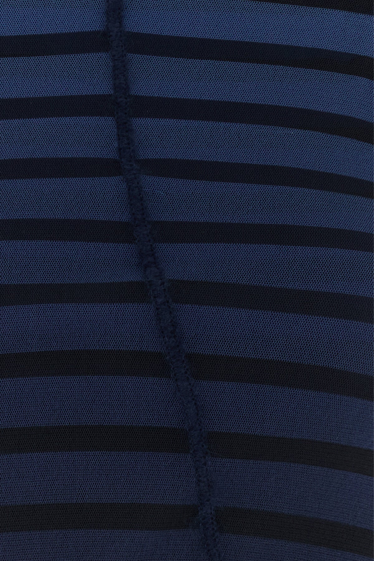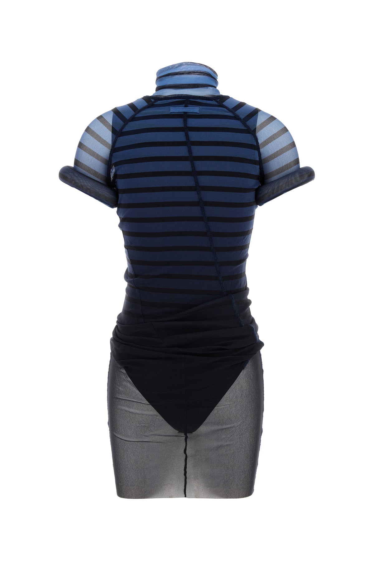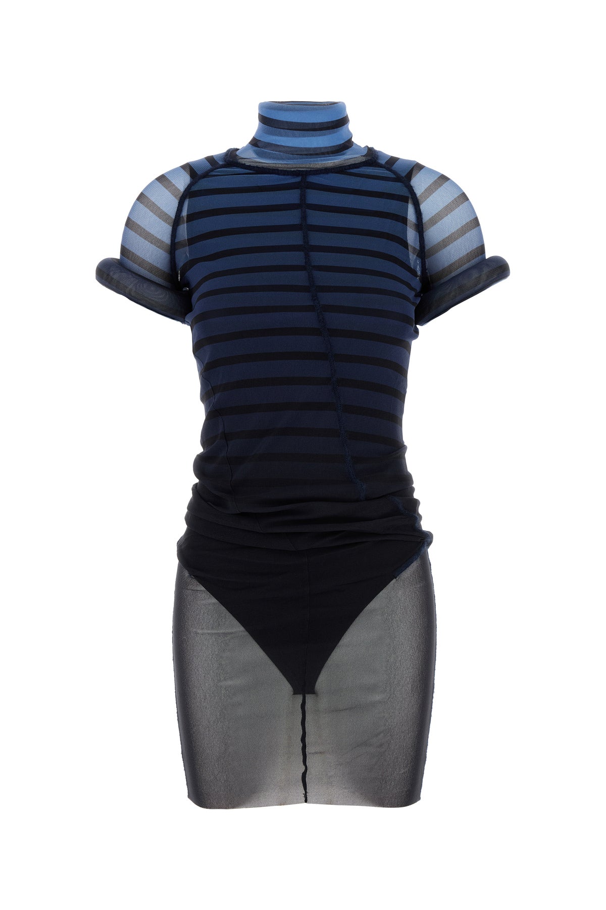Abito aderente realizzato in rete caratterizzato da stampa a righe sulla parte superiore.