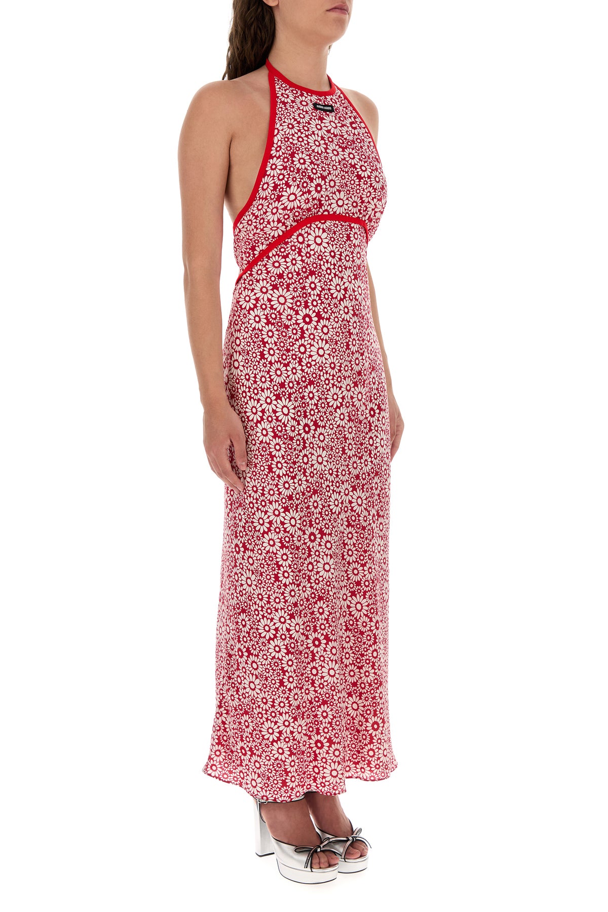 Abito dal taglio lungo realizzato in pura seta caratterizzato da stampa floreale su tutta la superficie arricchita da etichetta logata sul petto.