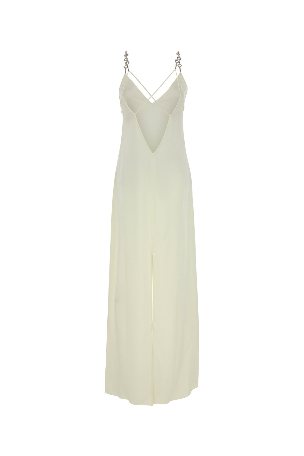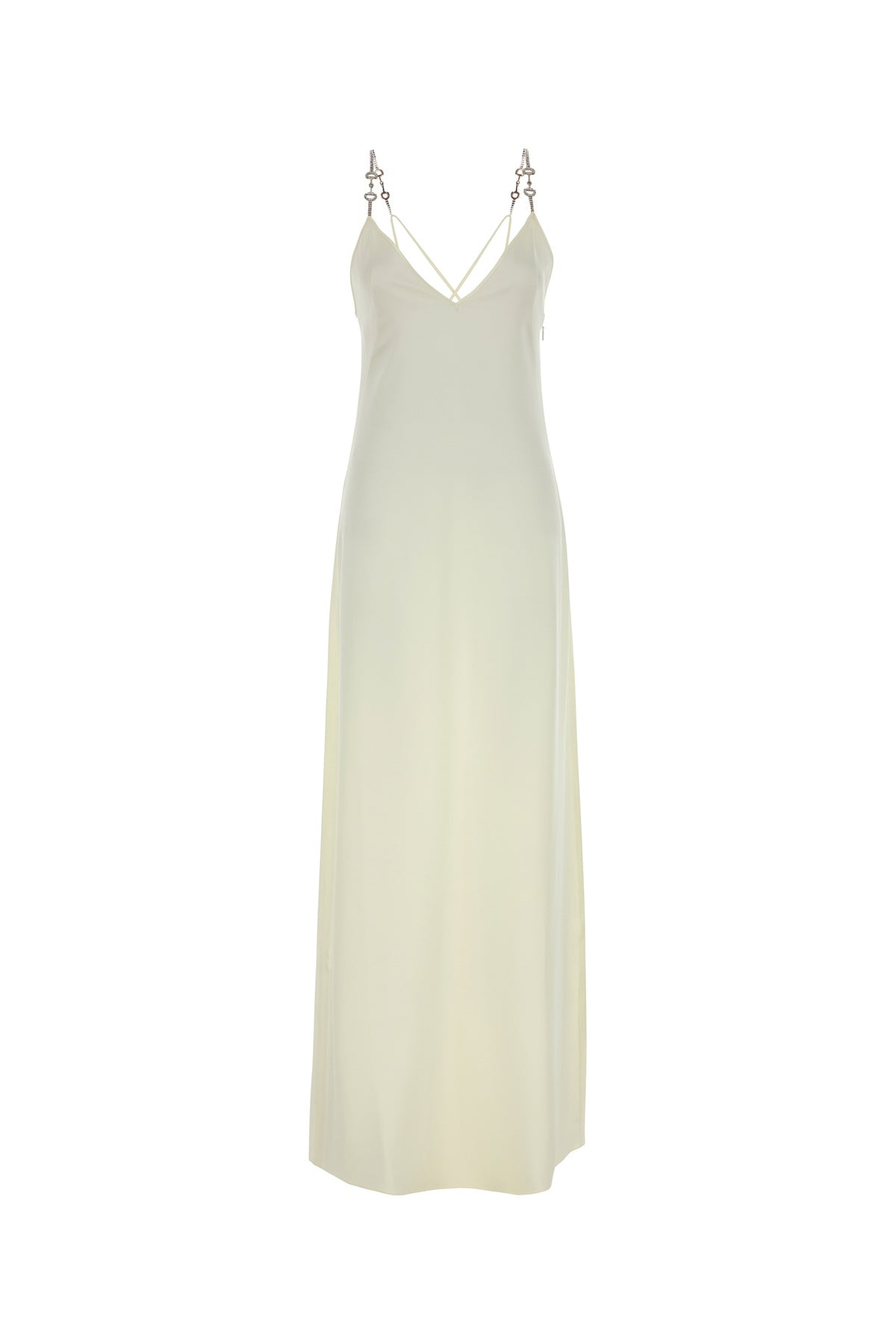 Abito lungo realizzato in raso arricchito da spalline Morsetto con cristalli.