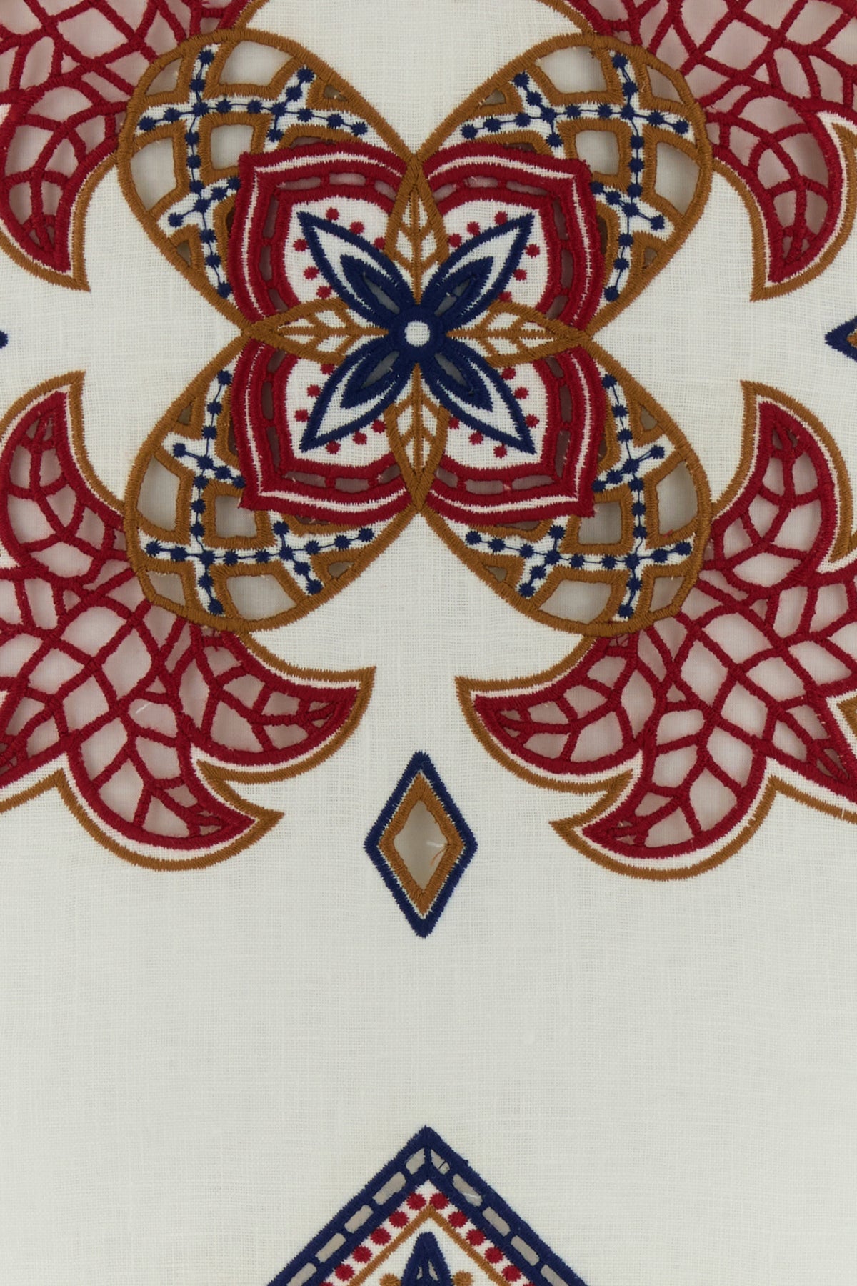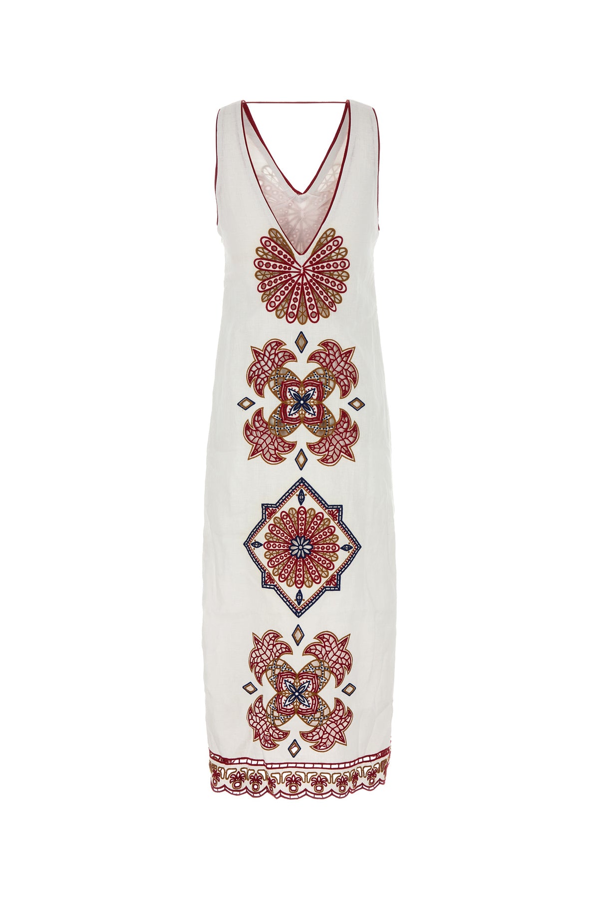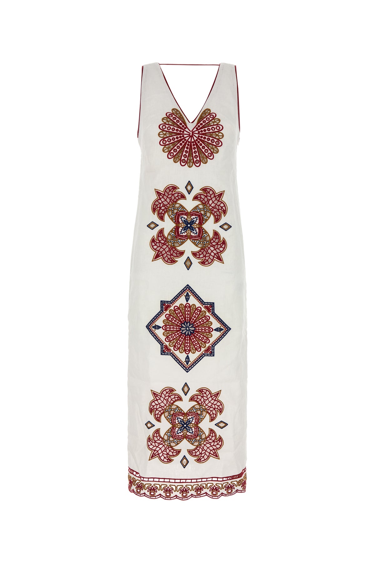 Abito realizzato in puro lino caratterizzato da particolari ricami su tutta la superficie.