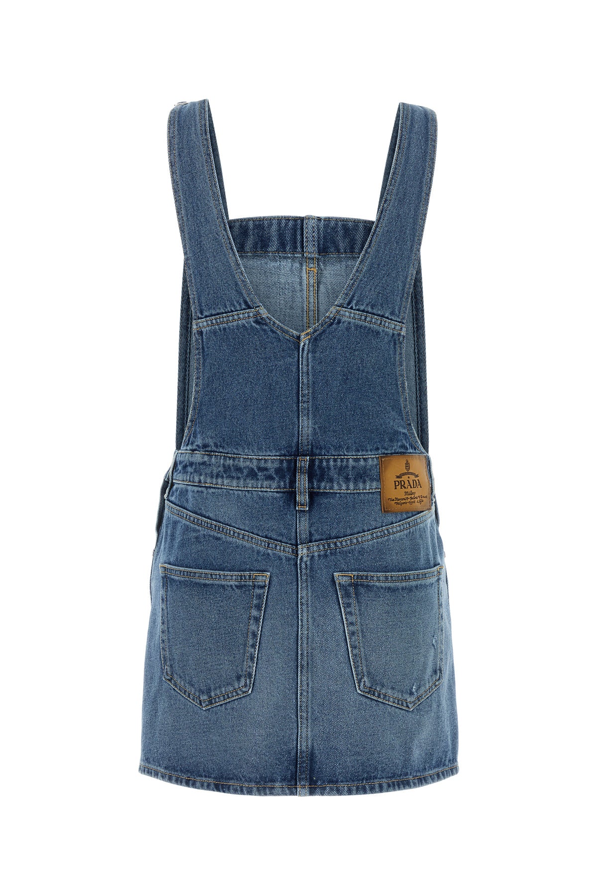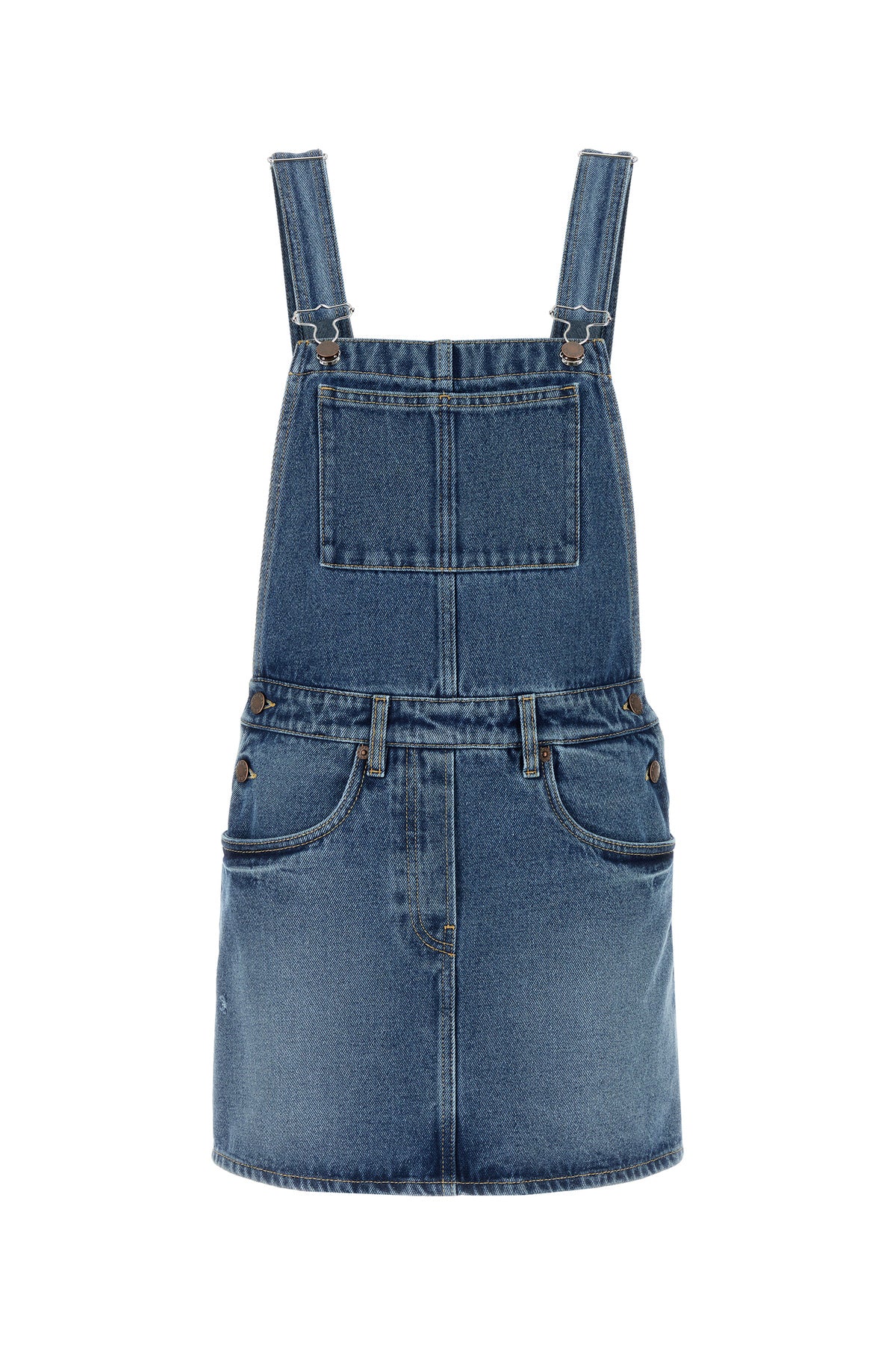 Abito salopette realizzato in denim di puro cotone slavato arricchito da etichetta logata sul retro.