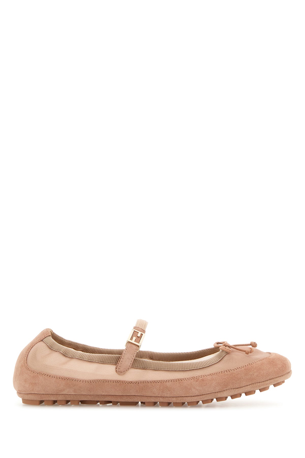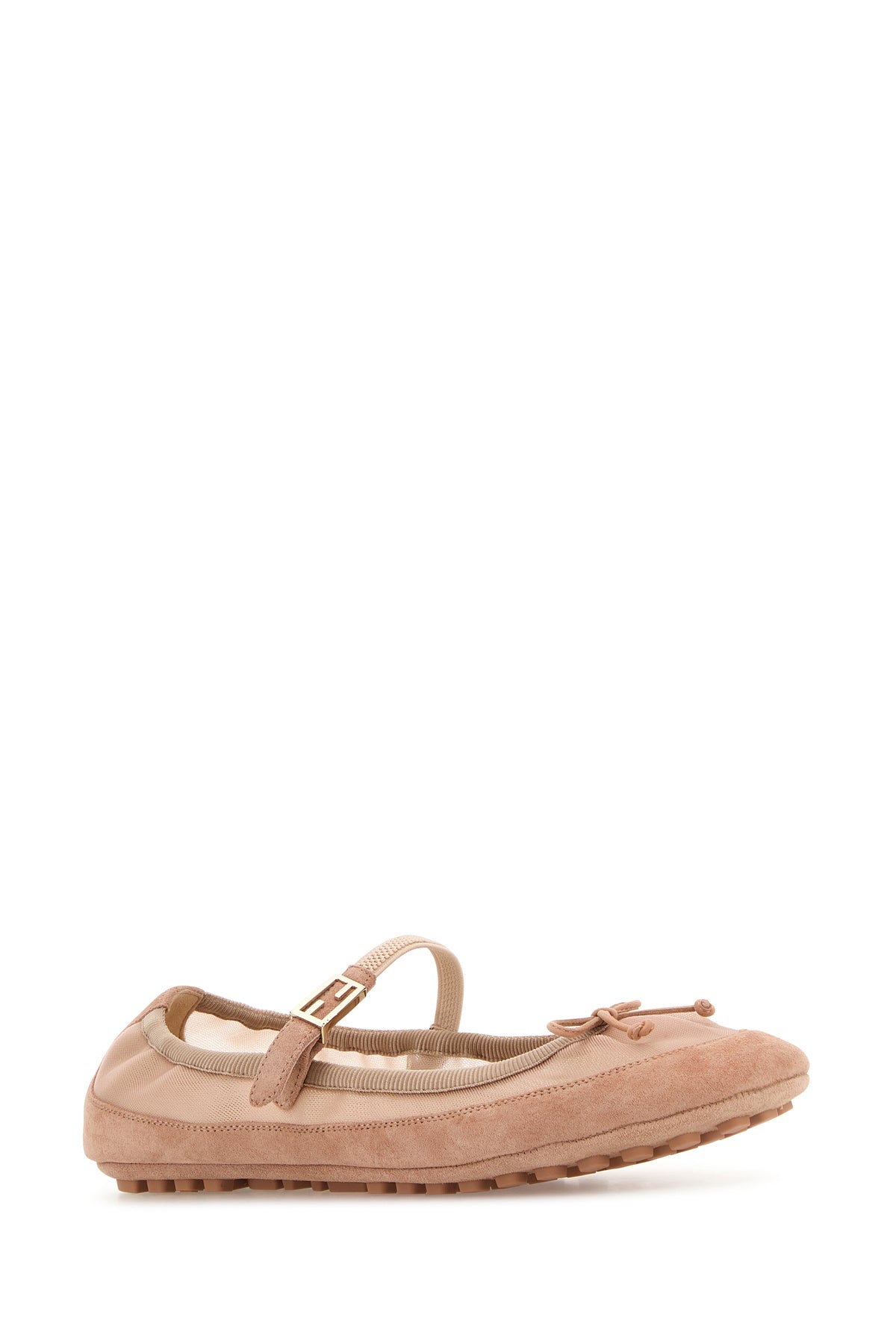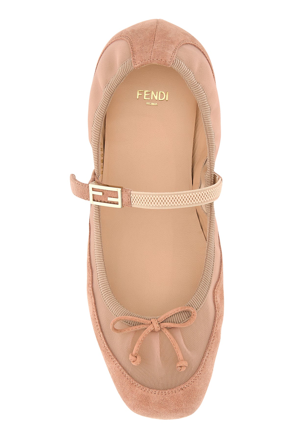 Ballerine realizzate in rete e pelle scamosciata arricchite da cinturino elastico con dettaglio FF Baguette sul collo del piede e fiocco decorativo tonale sulla parte frontale.