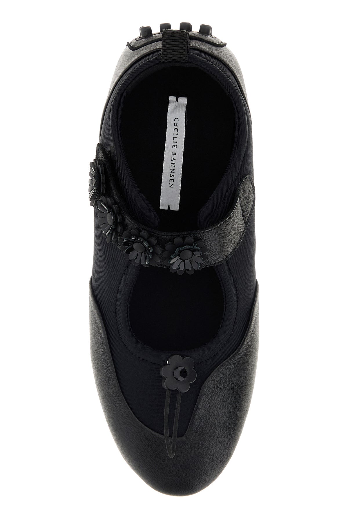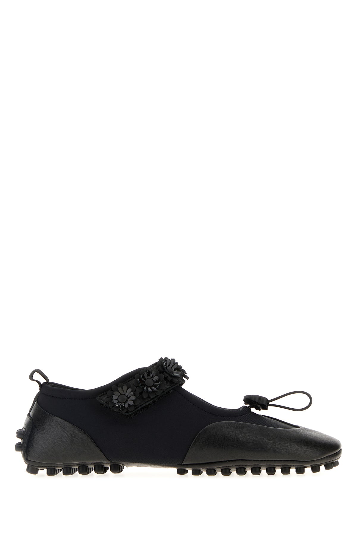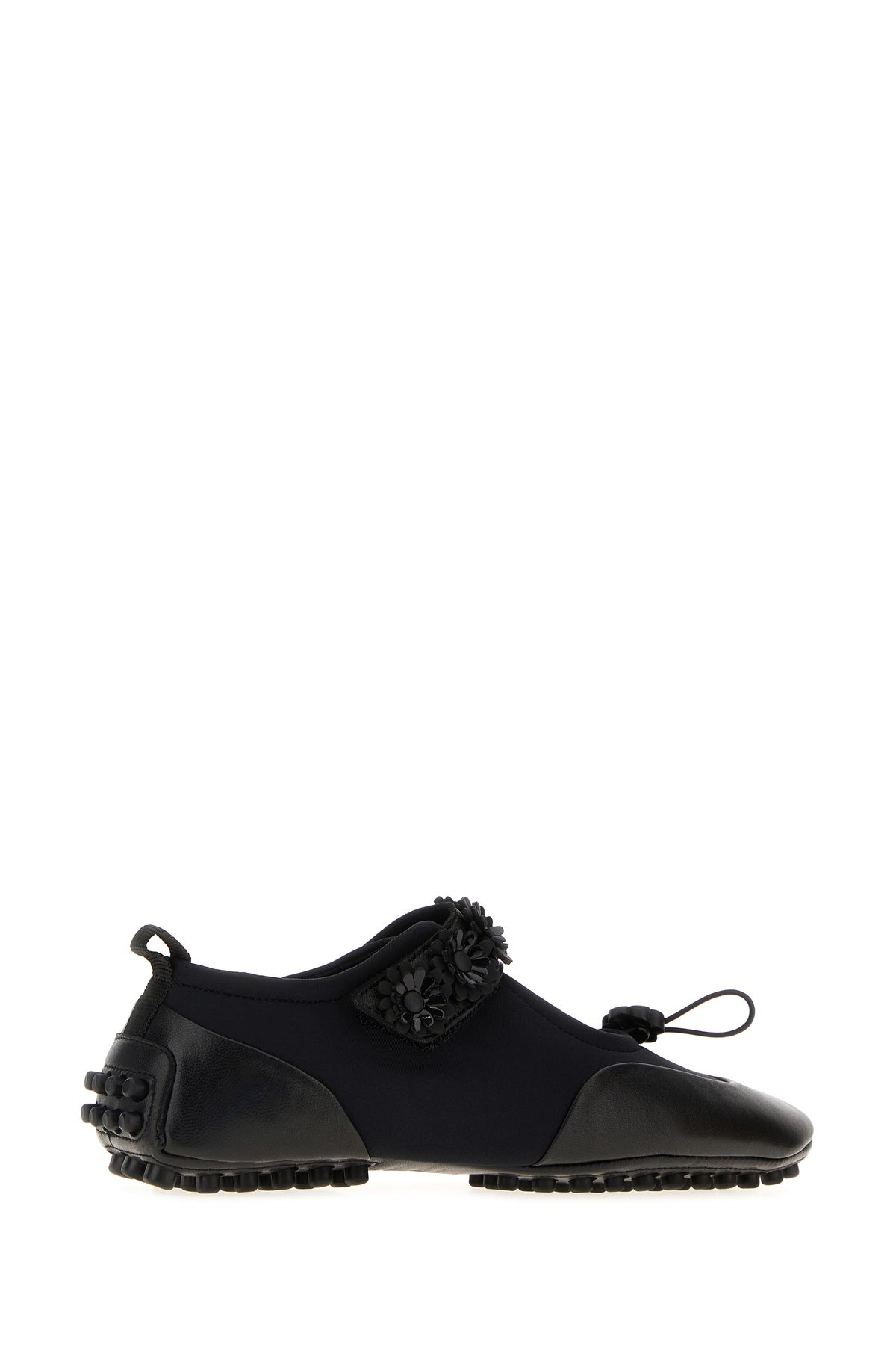 Ballerine realizzate in pelle martellata e tessuto arricchite da applicazioni floreali sul cinturino sul collo del piede.