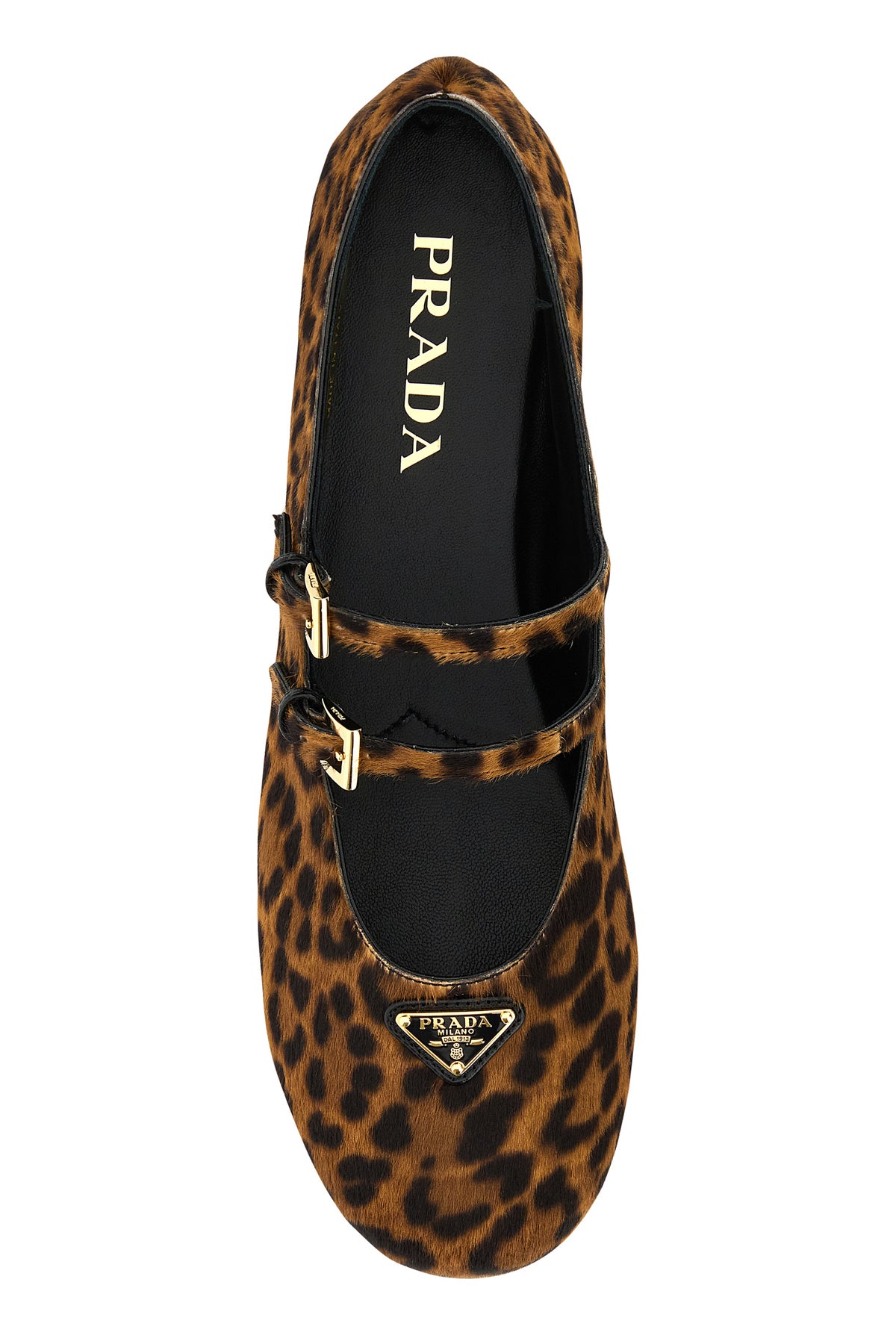 Ballerine realizzate in cavallino caratterizzate da stampa animalier su tutta la superficie arricchite da iconico triangolo metallico logato sulla punta tonda.