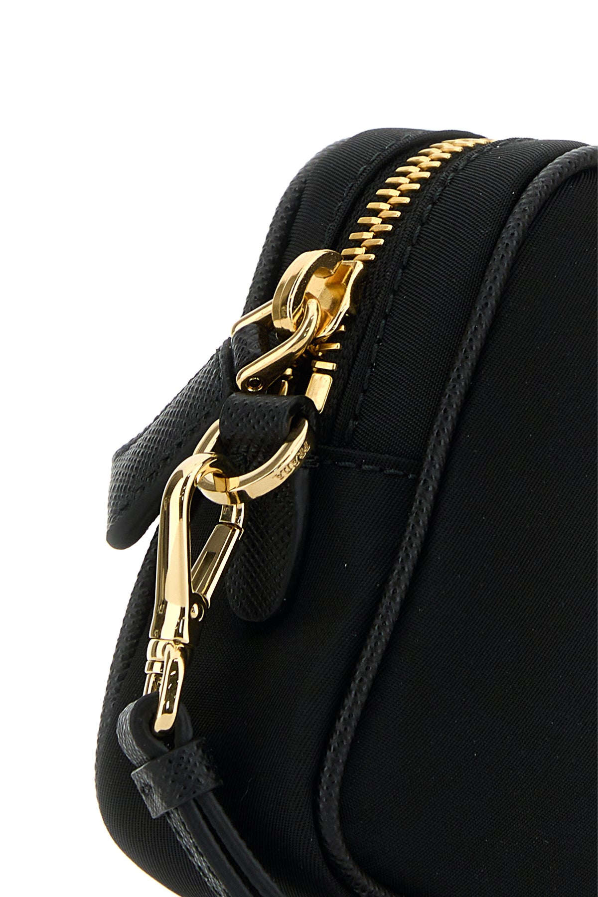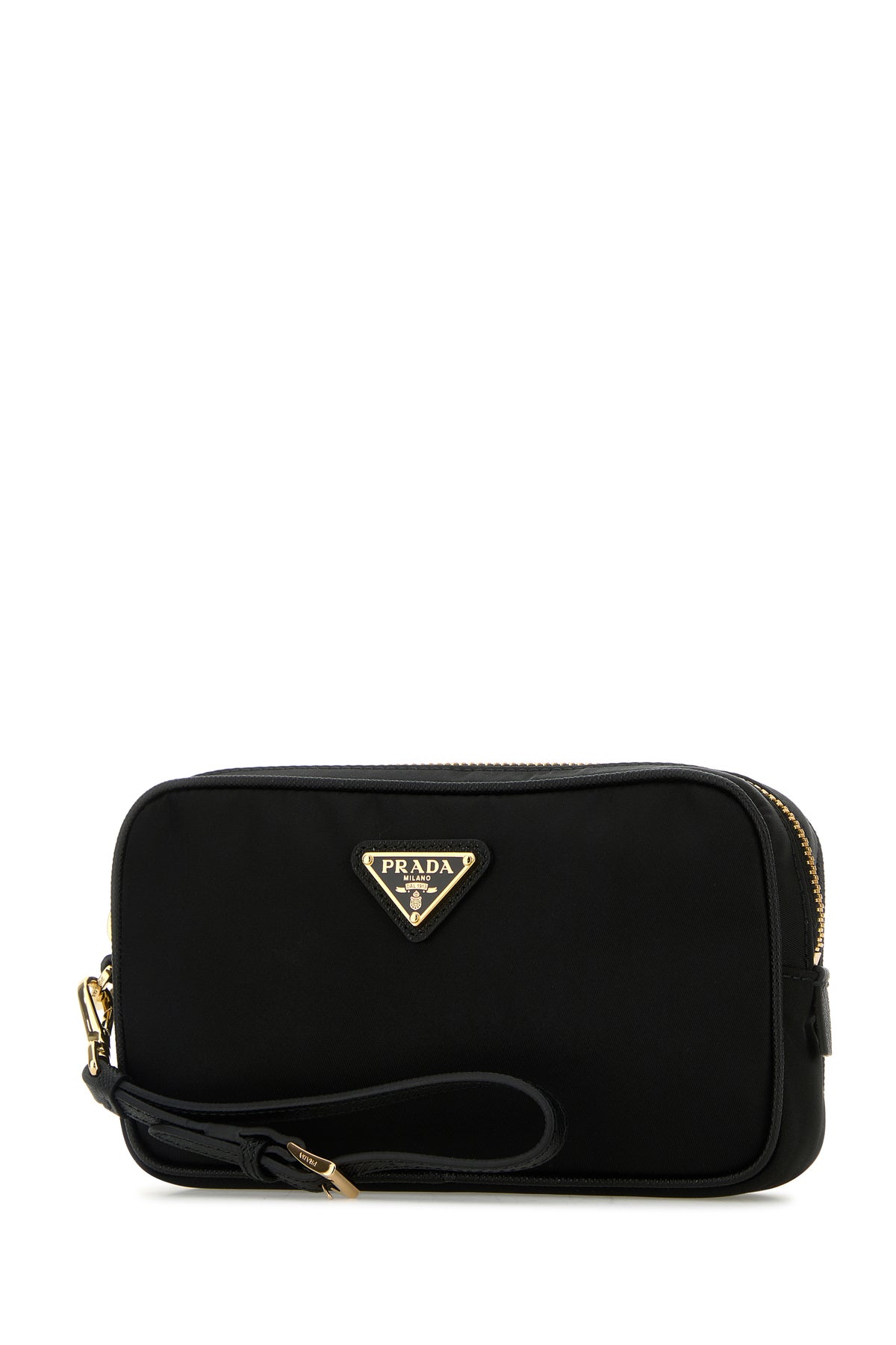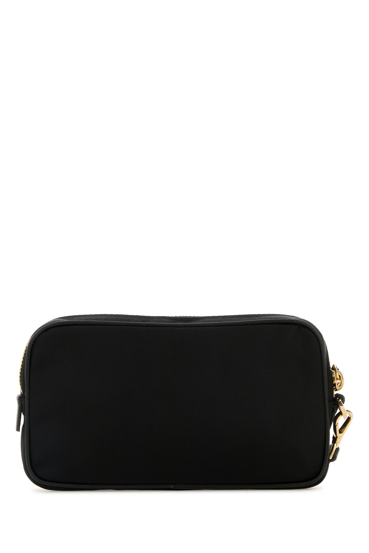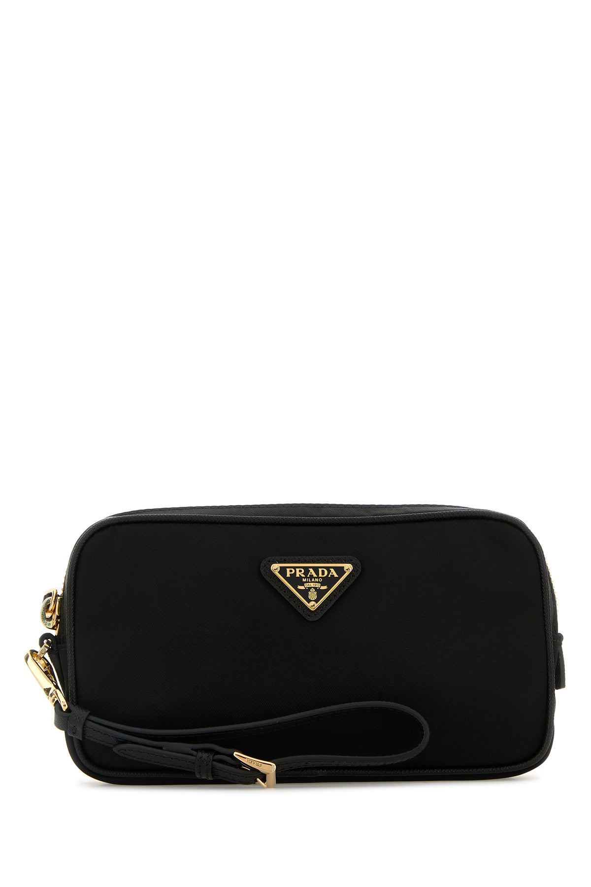 Beauty case realizzato in nylon arricchito da iconico triangolo logato in metallo e pelle sulla parte frontale.