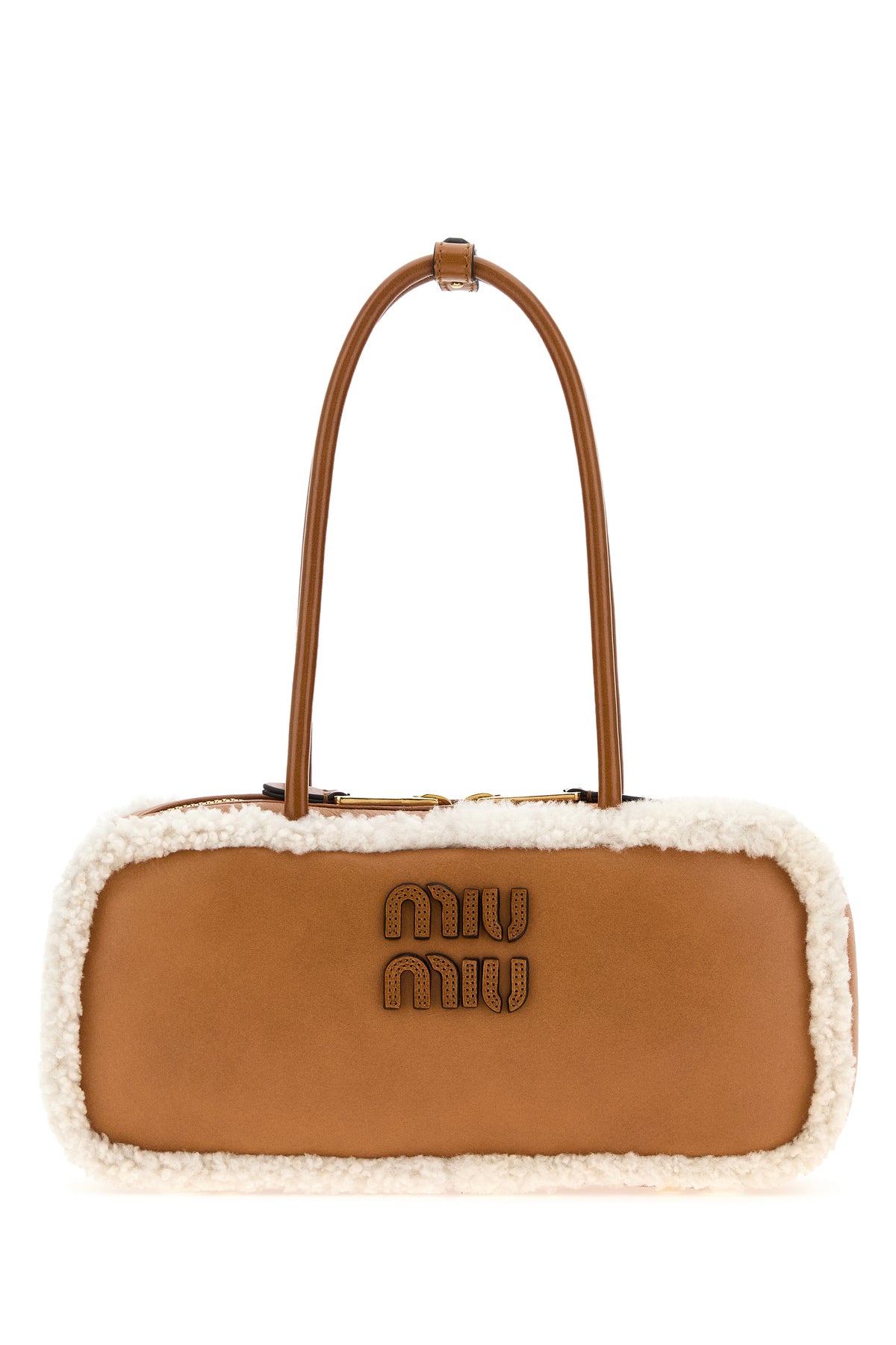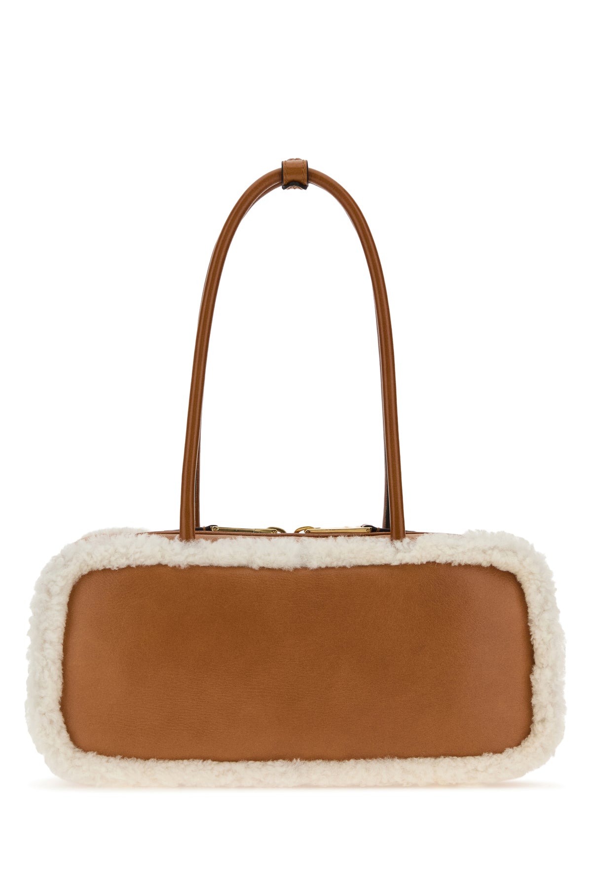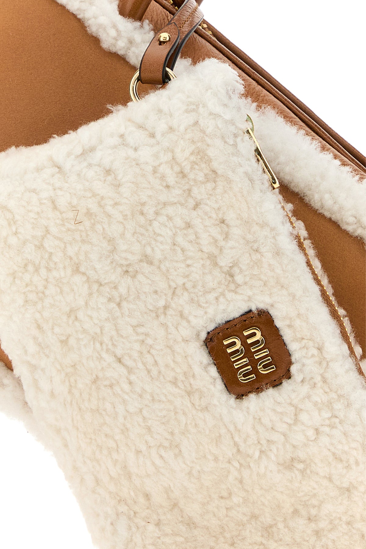 Borsa a mano realizzata in pelle leggermente martellata con profilature in shearling arricchita da applicazione logata tonale sulla parte frontale.