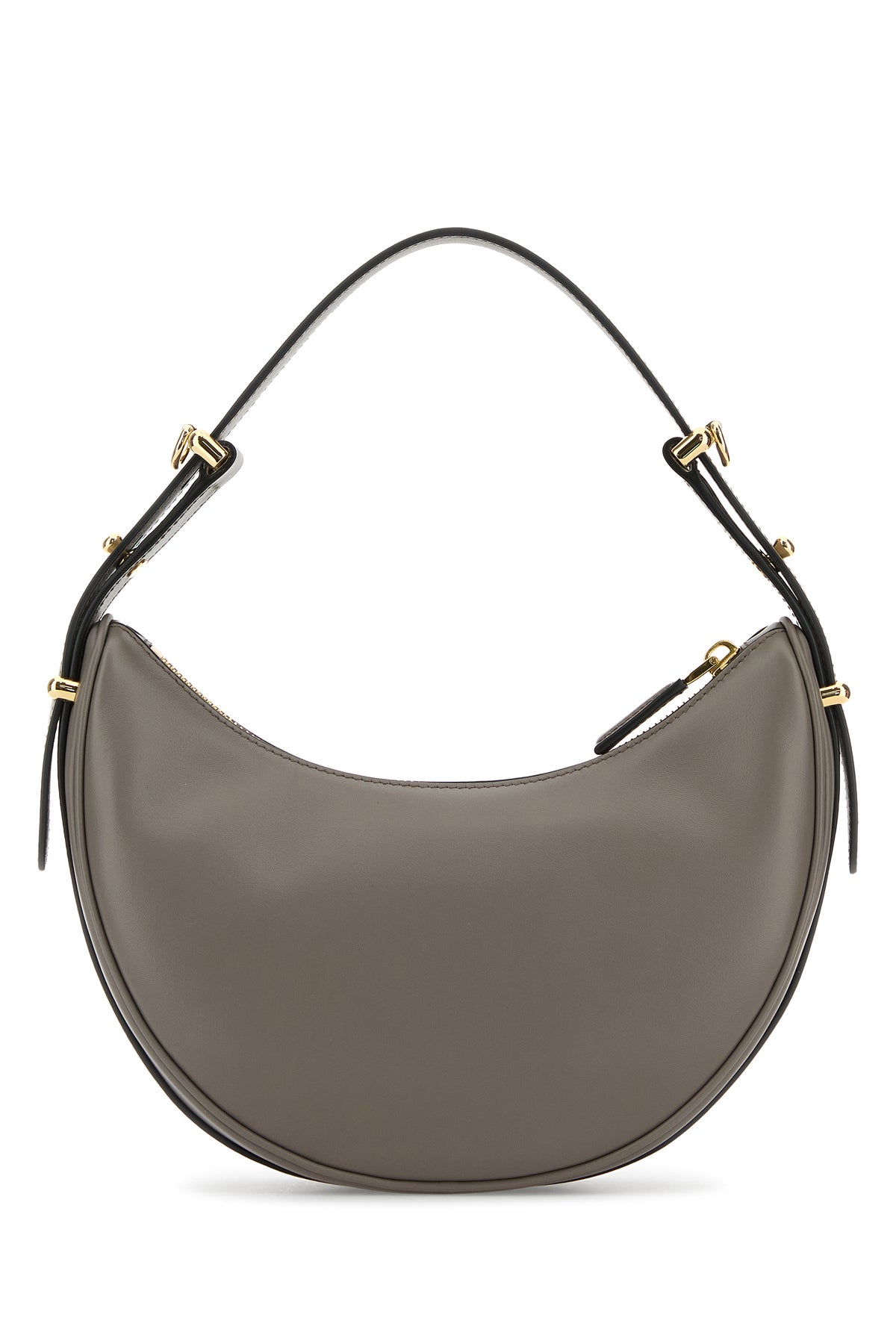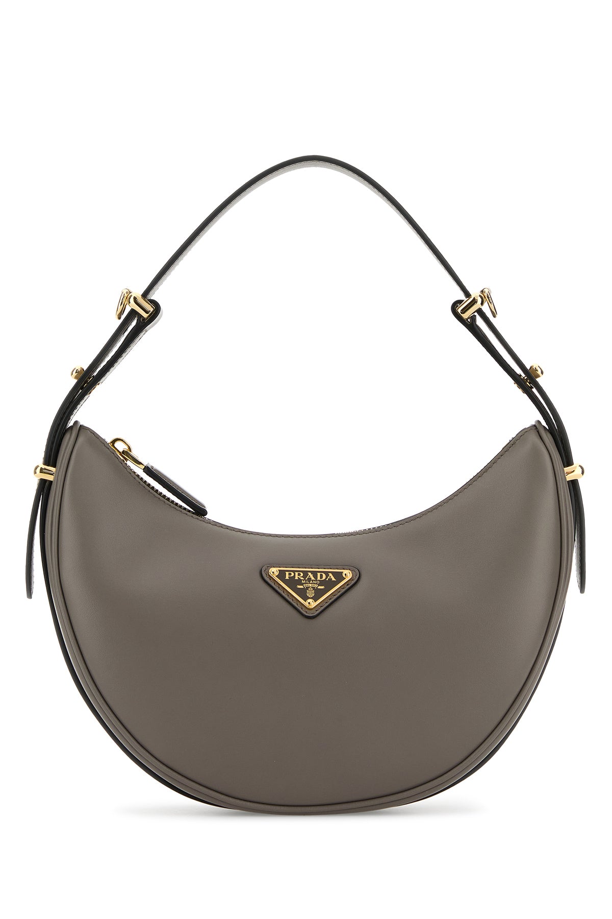 Borsa a mano realizzata in pelle di vitello liscia arricchita da iconico triangolo metallico logato sulla parte frontale.