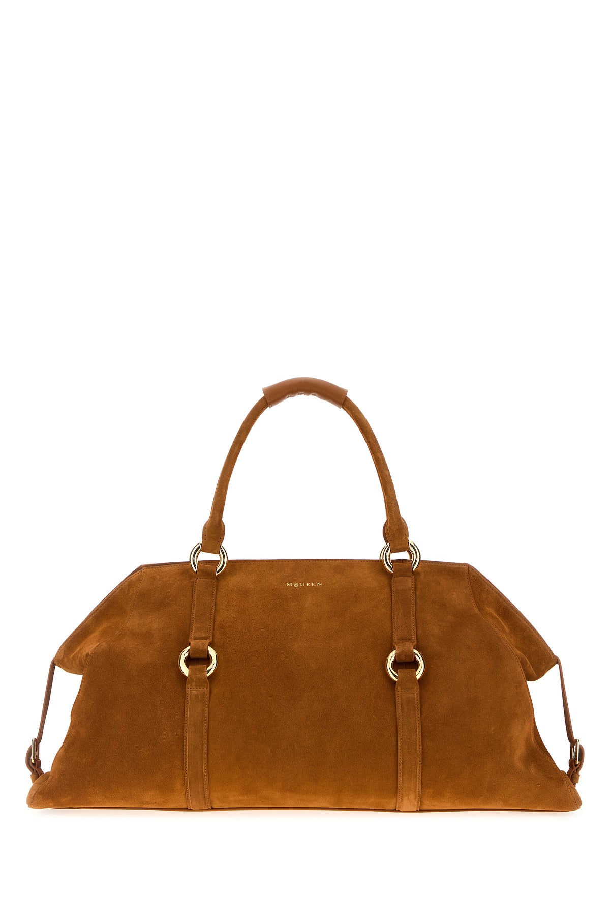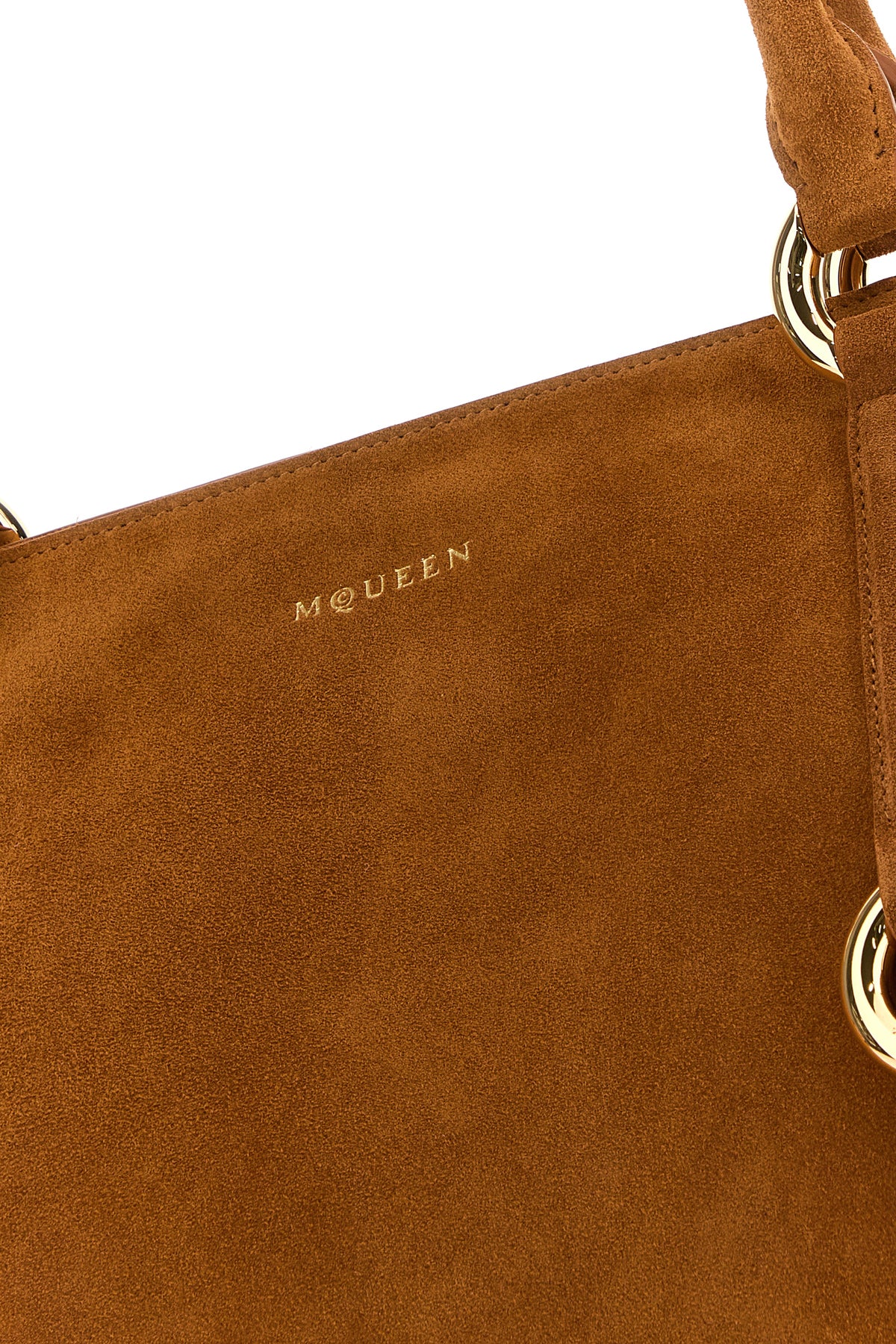 Borsa a mano realizzata in pelle scamosciata di vitello caratterizzata da stampa McQueen laminata sulla parte frontale arricchita da cinturini Harness.