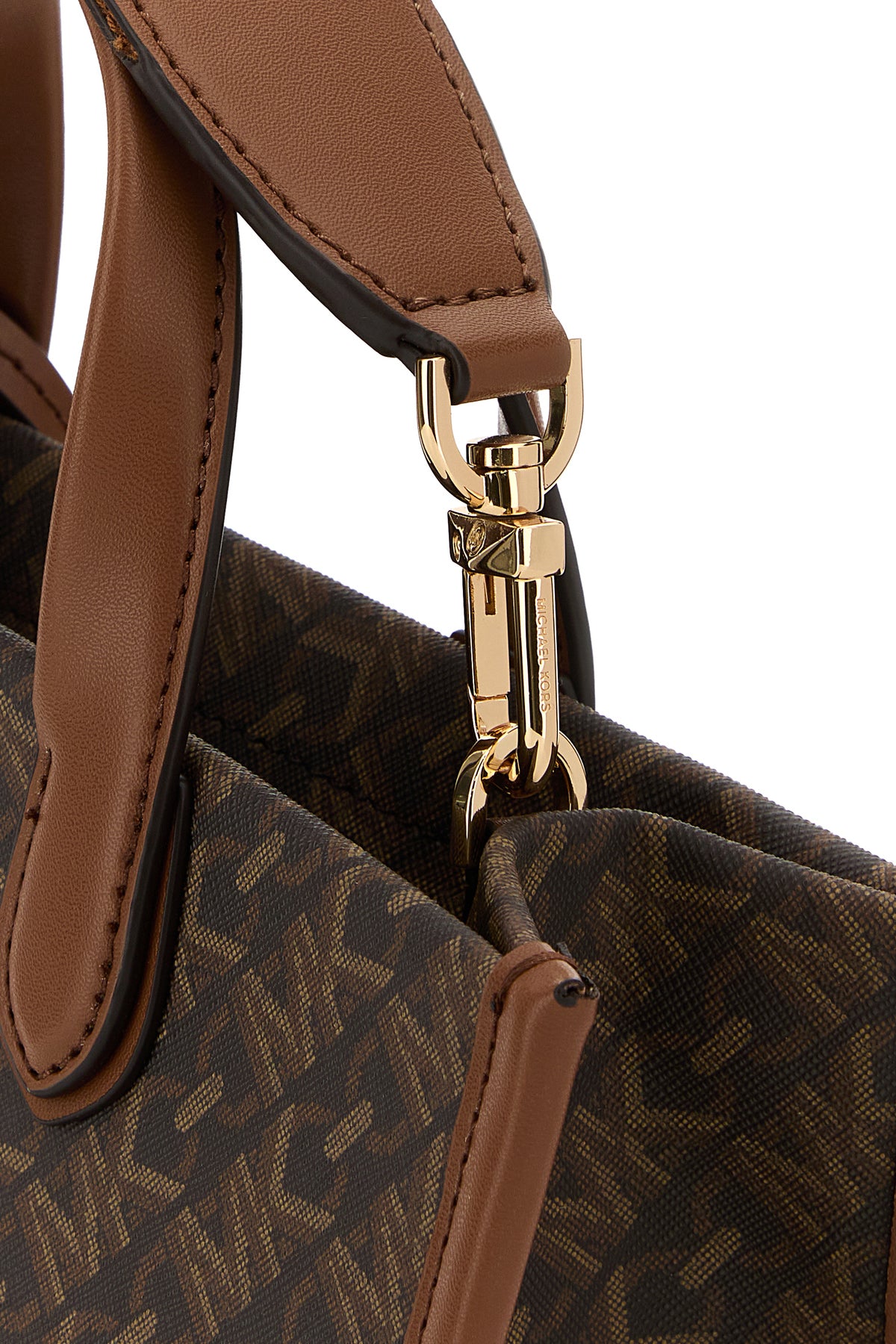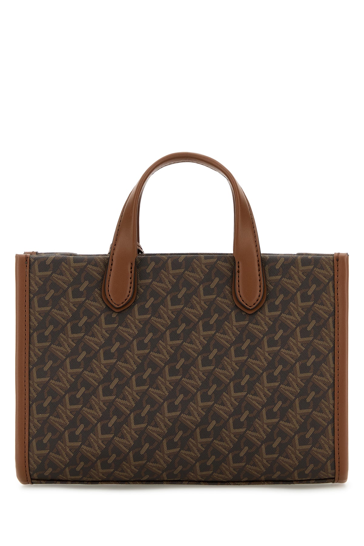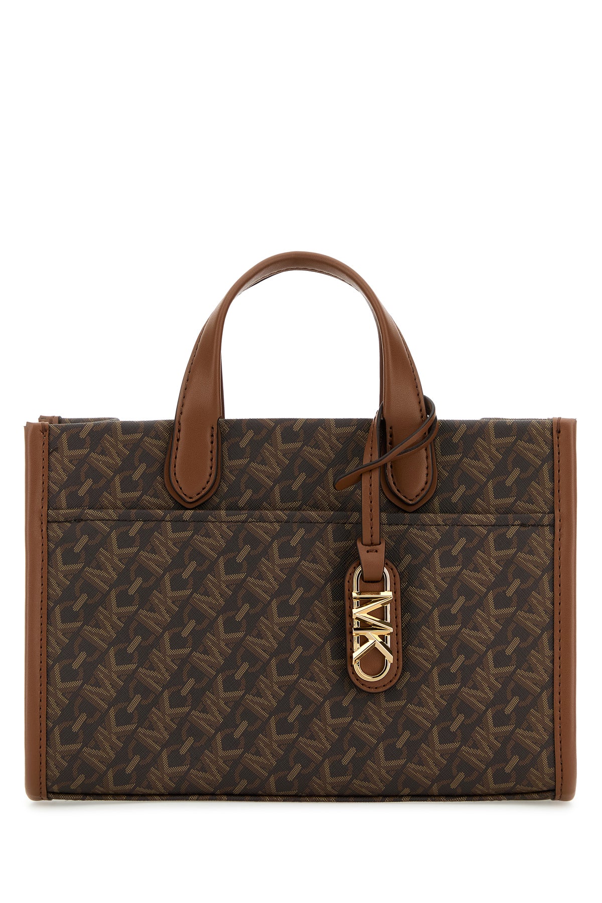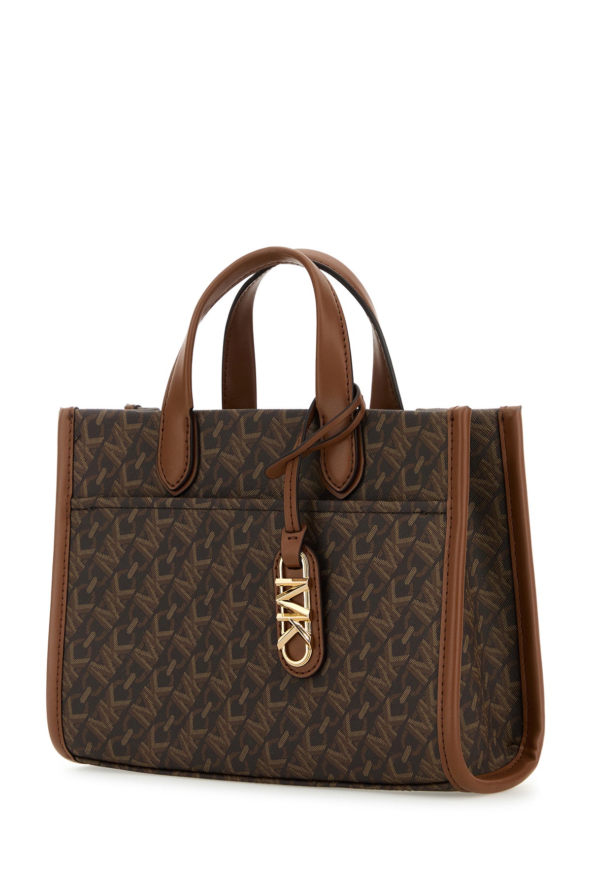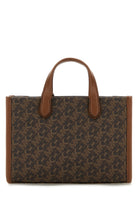 Borsa a mano realizzata in tela caratterizzata da stampa logata su tutta la superficie arricchita da accessorio amovibile in pelle e metallo.