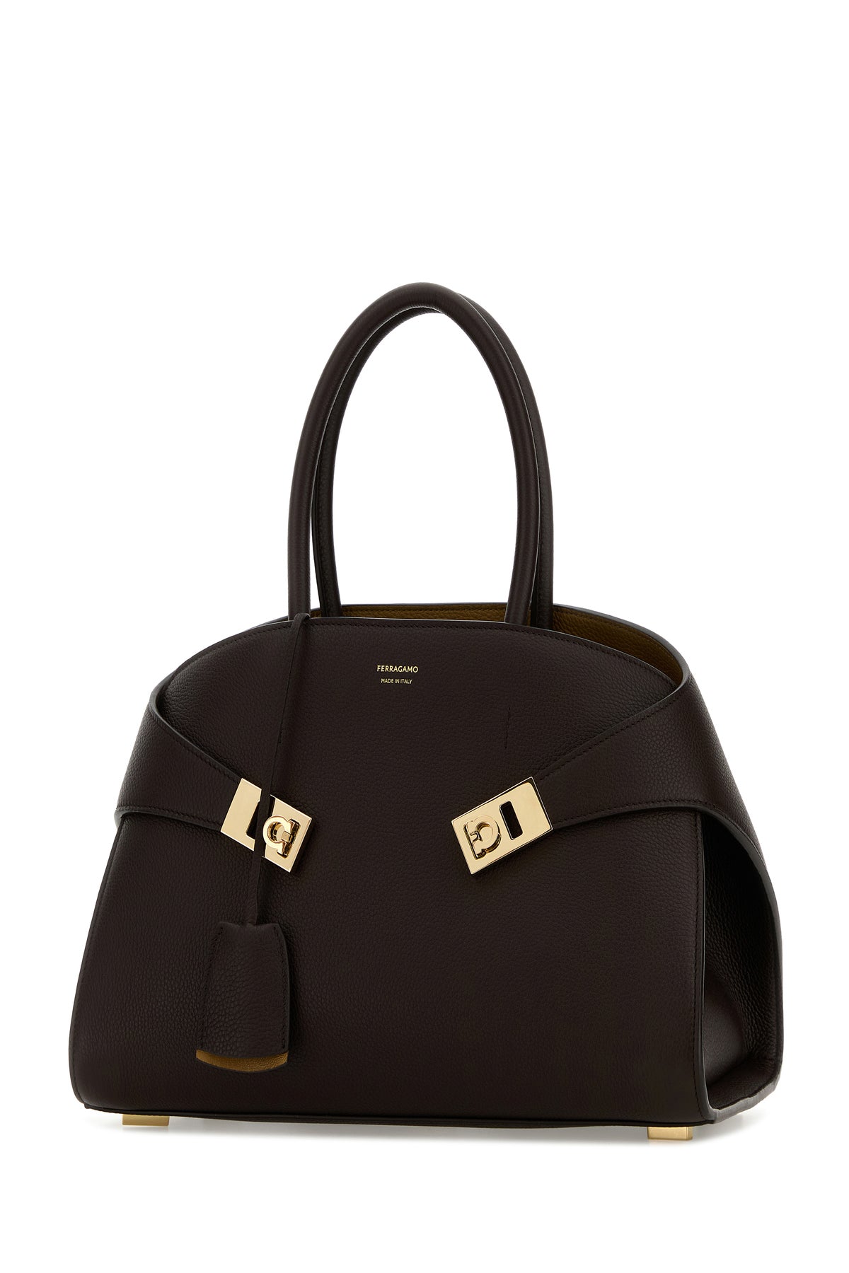 Borsa a mano realizzata in pelle di vitello martellata caratterizzata da logo stampato laminato sulla parte frontale arricchita da cinturini in pelle tonale con dettagli Gancini in metallo sulla parte frontale e accessorio portachiavi amovibile.
