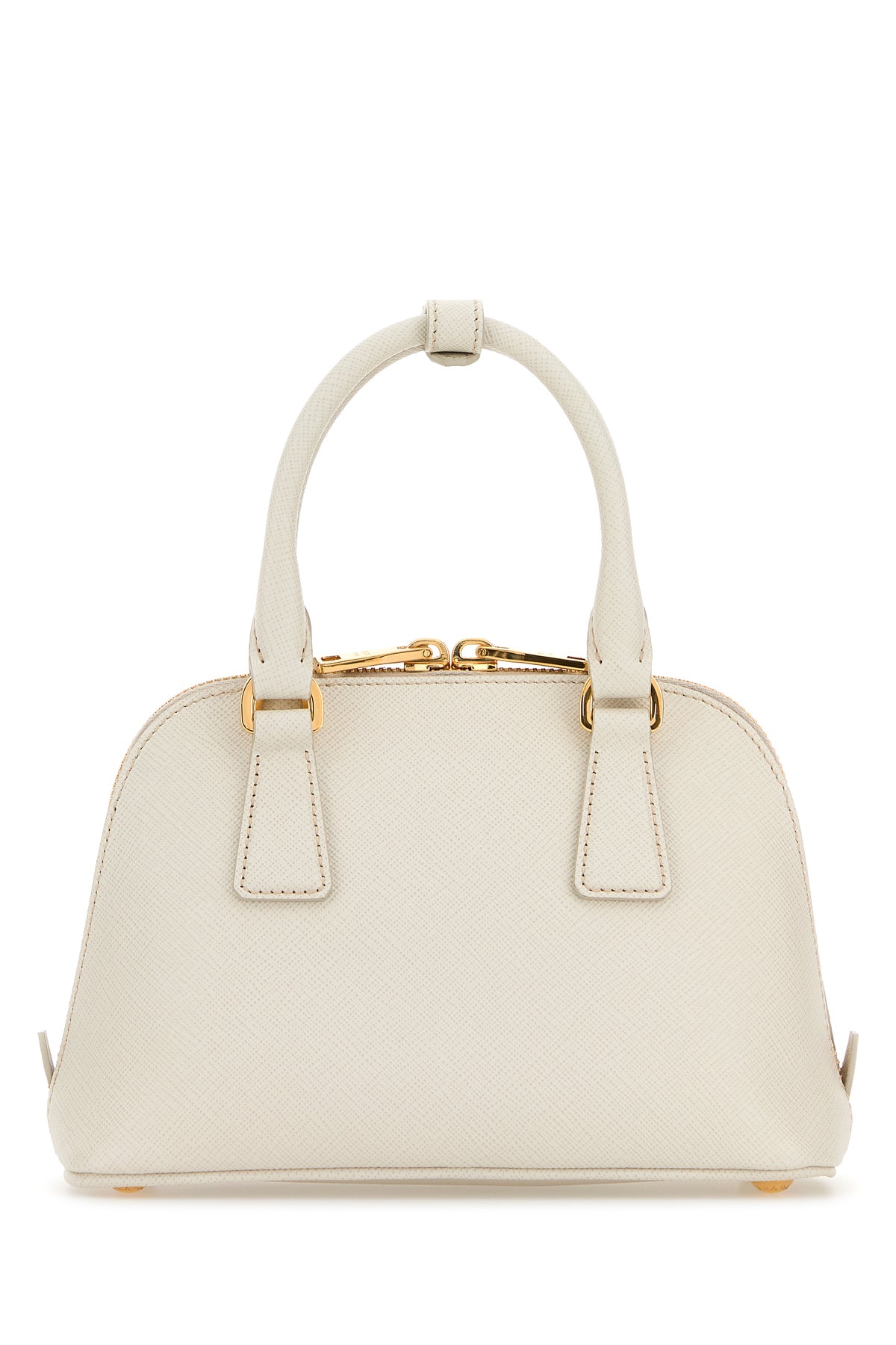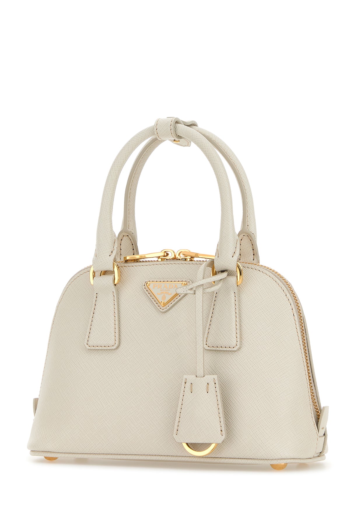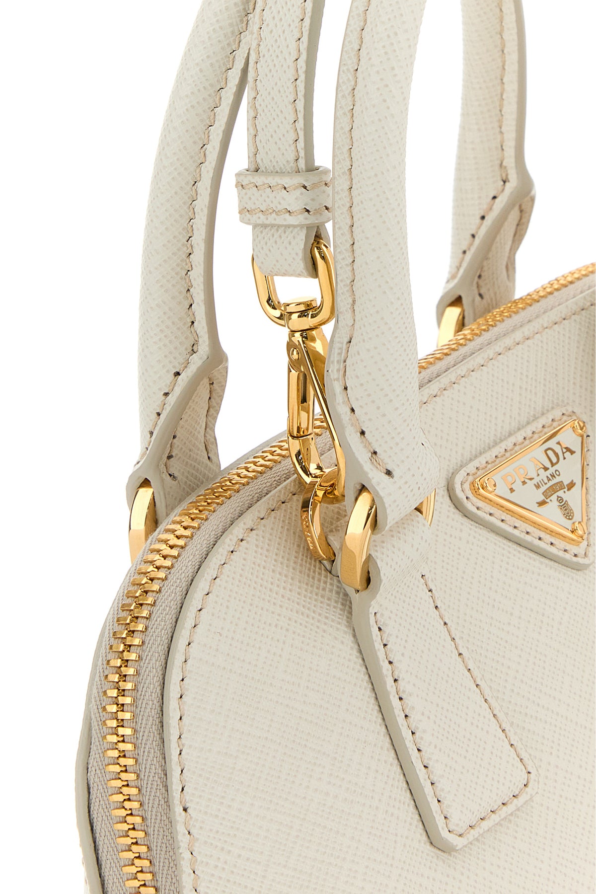 Borsa realizzata in pelle Saffiano arricchita da iconico triangolo metallico logato sulla parte frontale.
