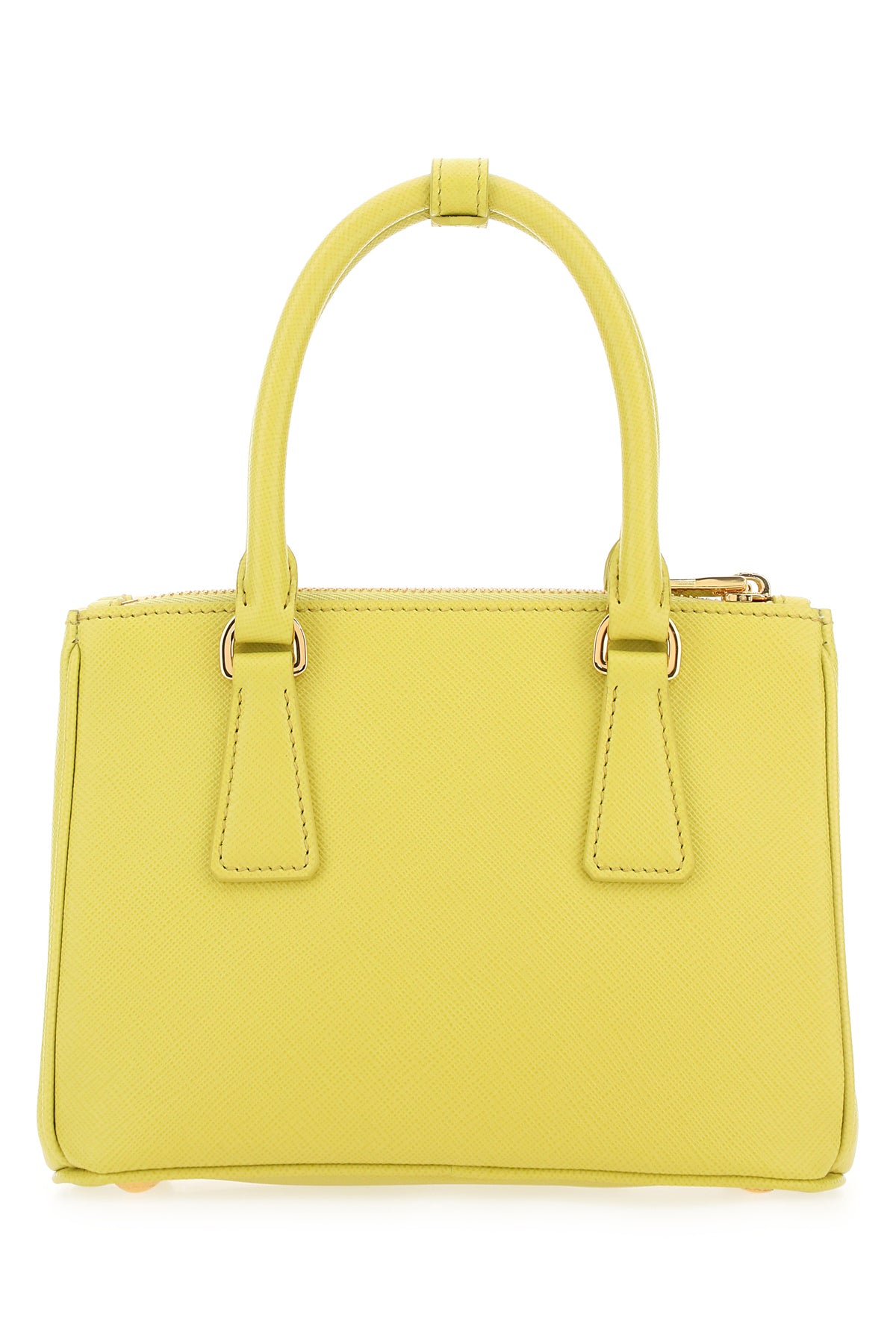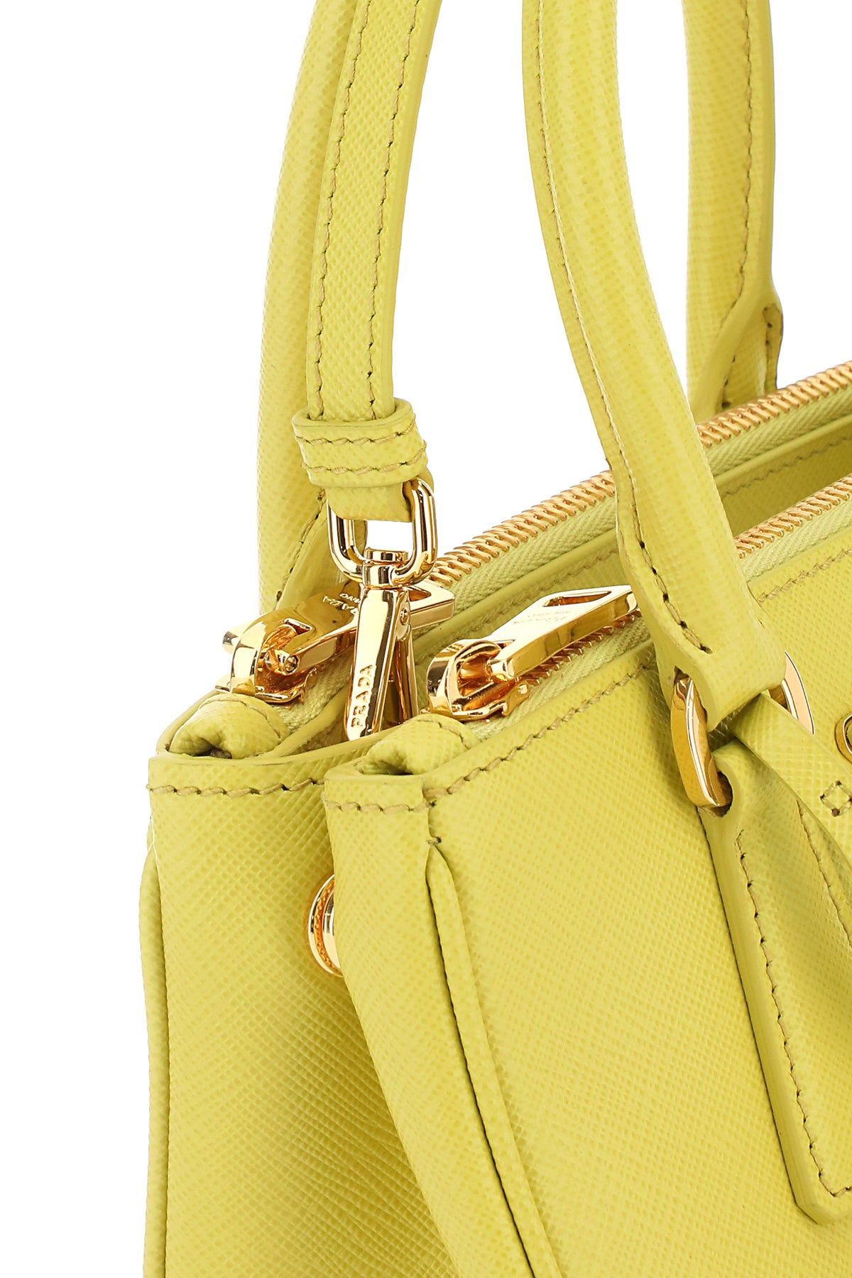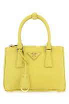 Borsa a mano realizzata in pelle Saffiano arricchita da iconico triangolo logato sulla parte frontale e accessorio amovibile in pelle tonale con anello portachiavi.