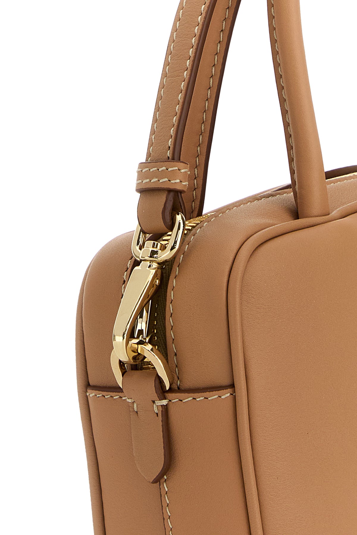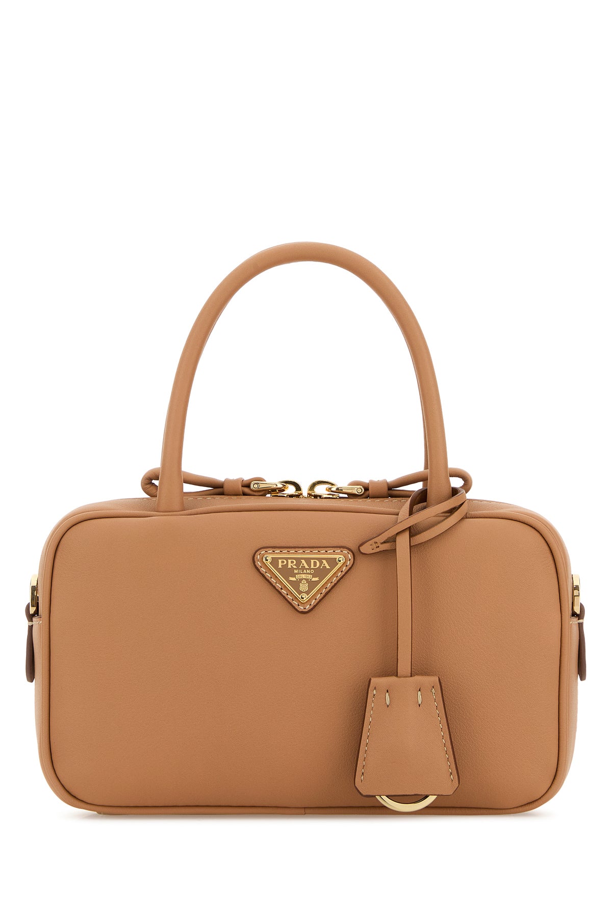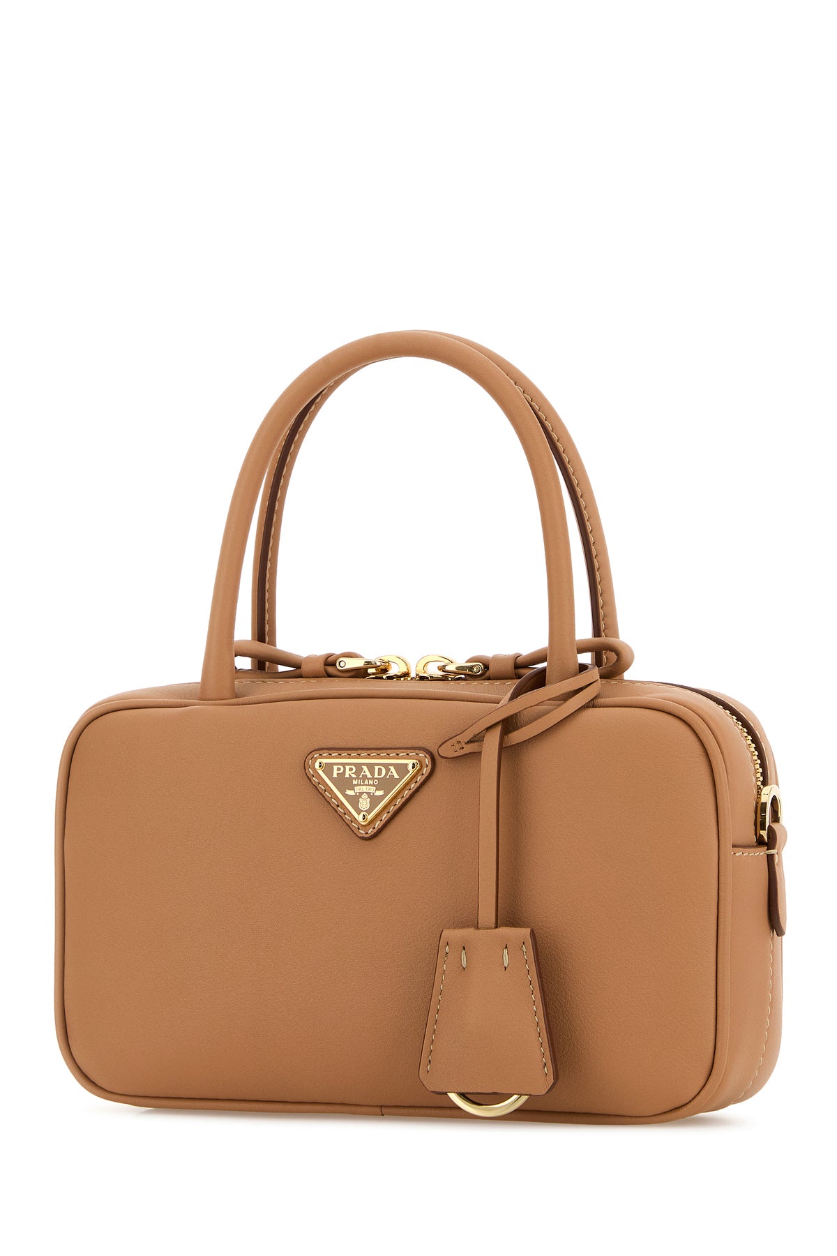 Borsa a mano realizzata in pelle martellata arricchita da iconico triangolo metallico logato sulla parte frontale.