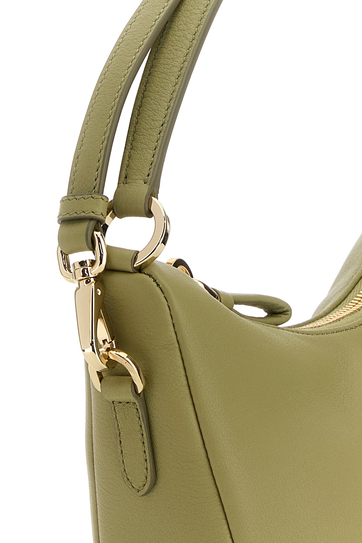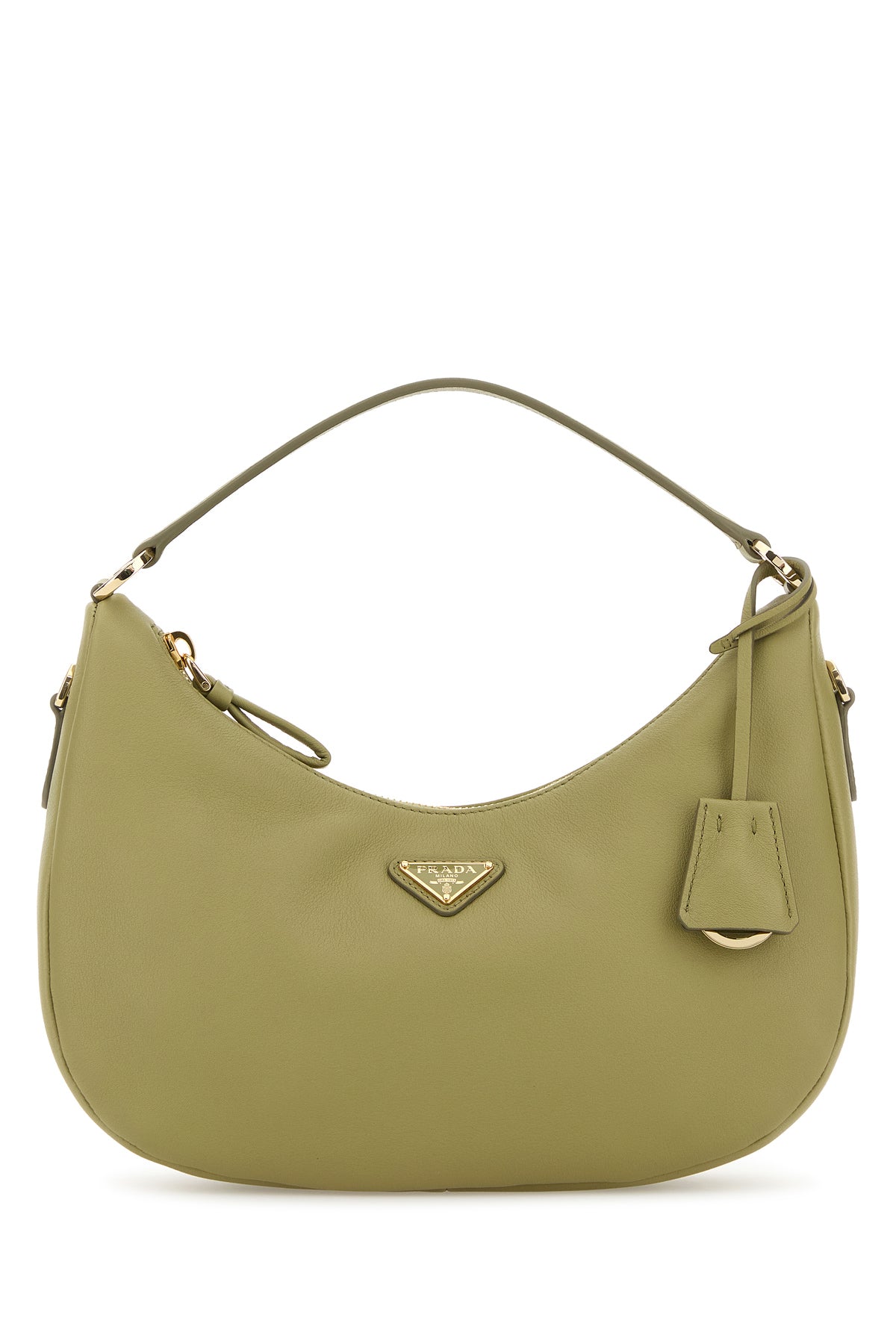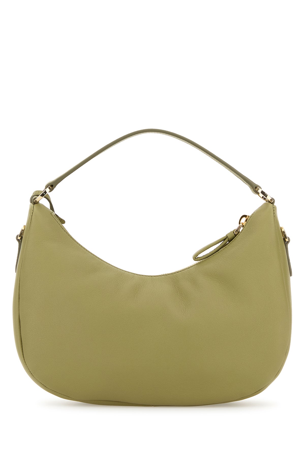Borsa a mano realizzata in pelle martellata arricchita da iconico triangolo metallico logato sulla parte frontale.