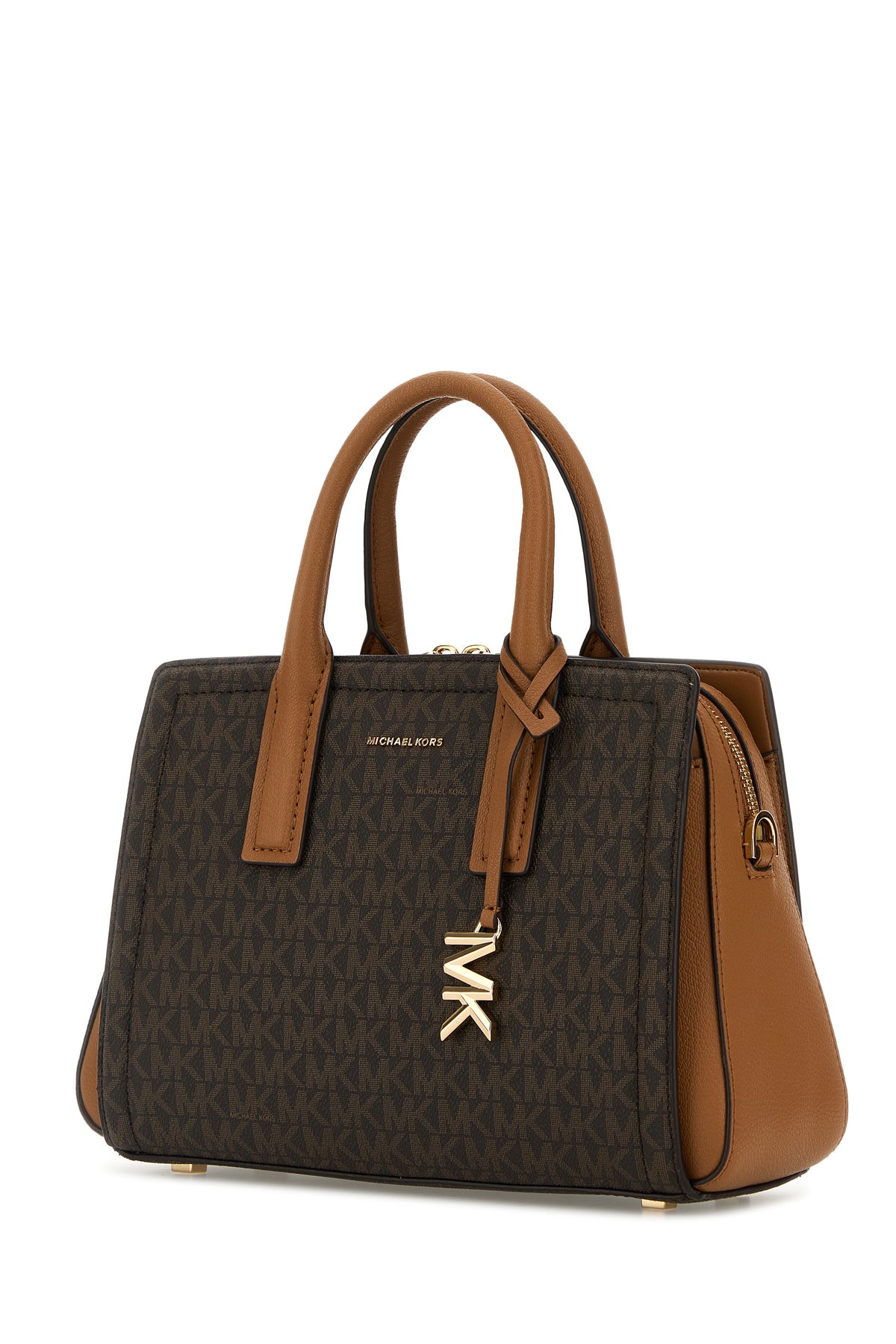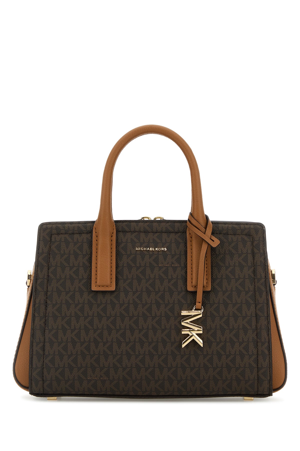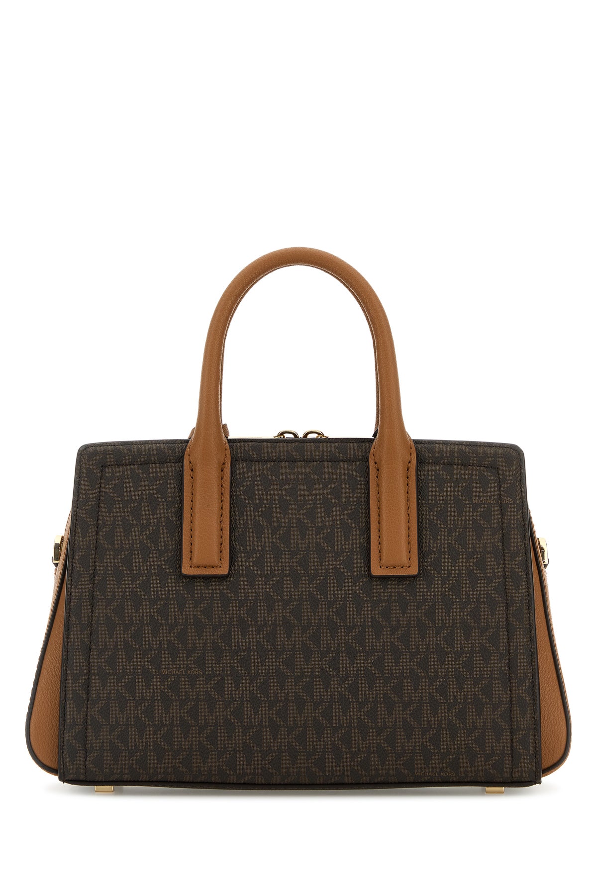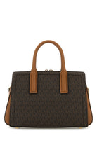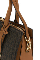 Borsa a mano realizzata in tela rivestita caratterizzata da logo stampato su tutta la superficie arricchita da logo in lettere metalliche sulla parte frontale.