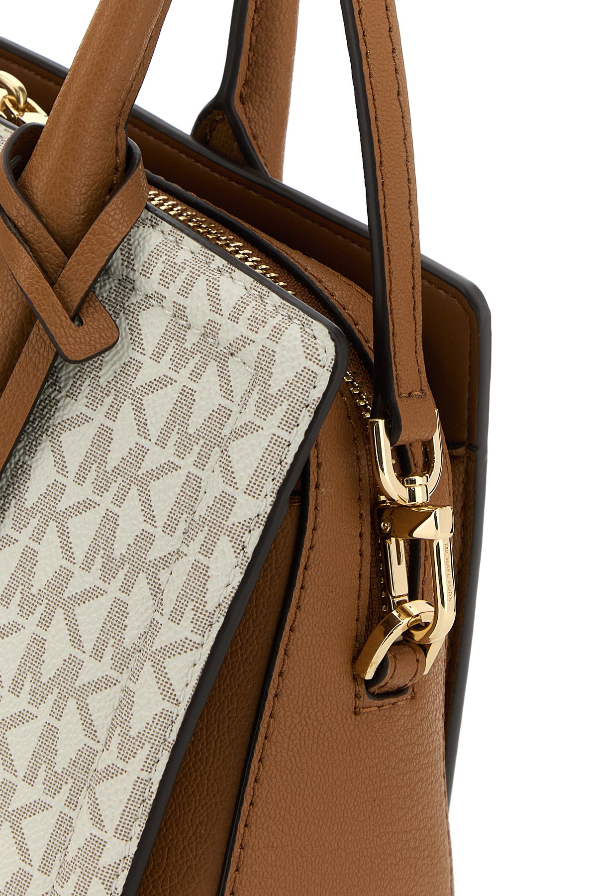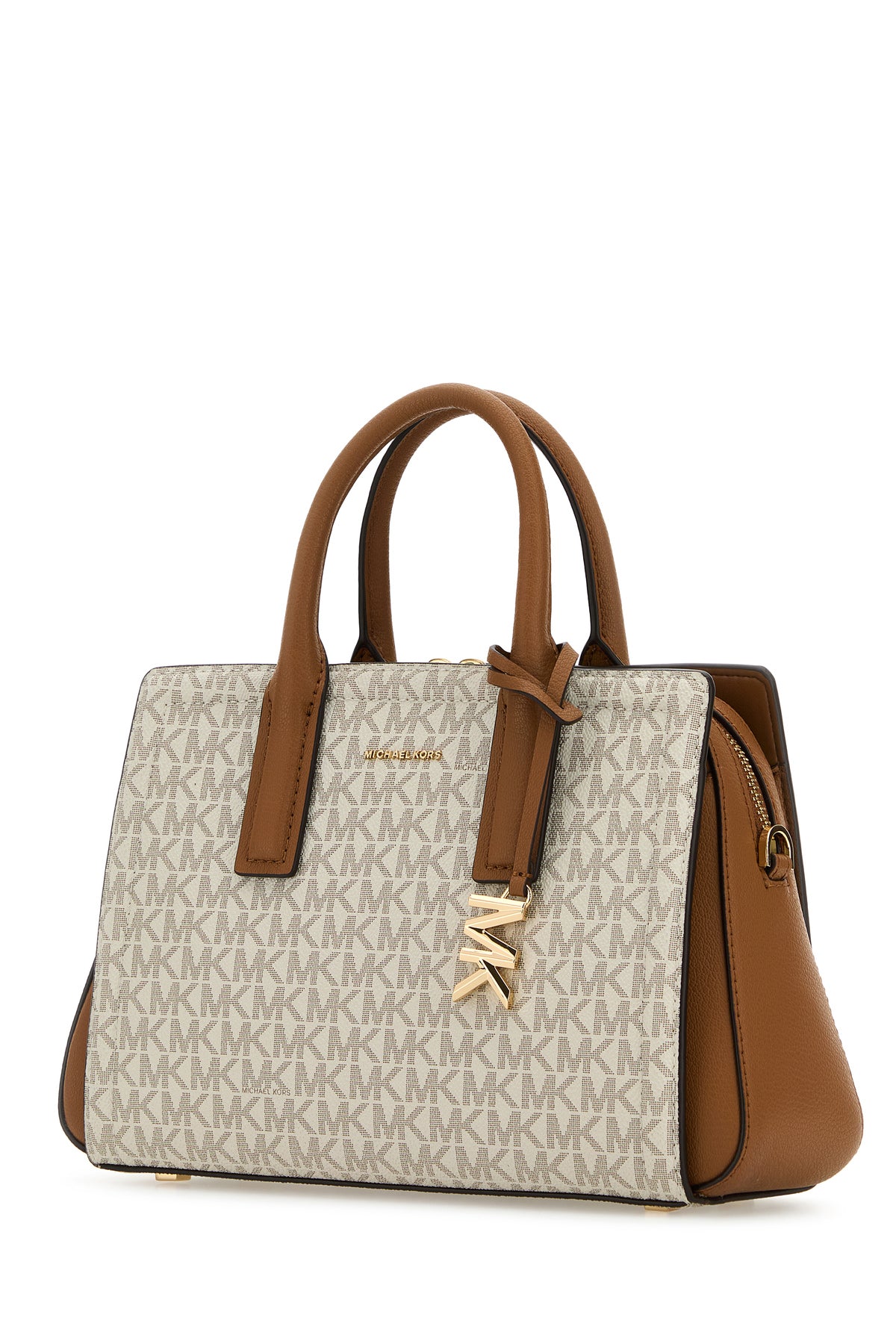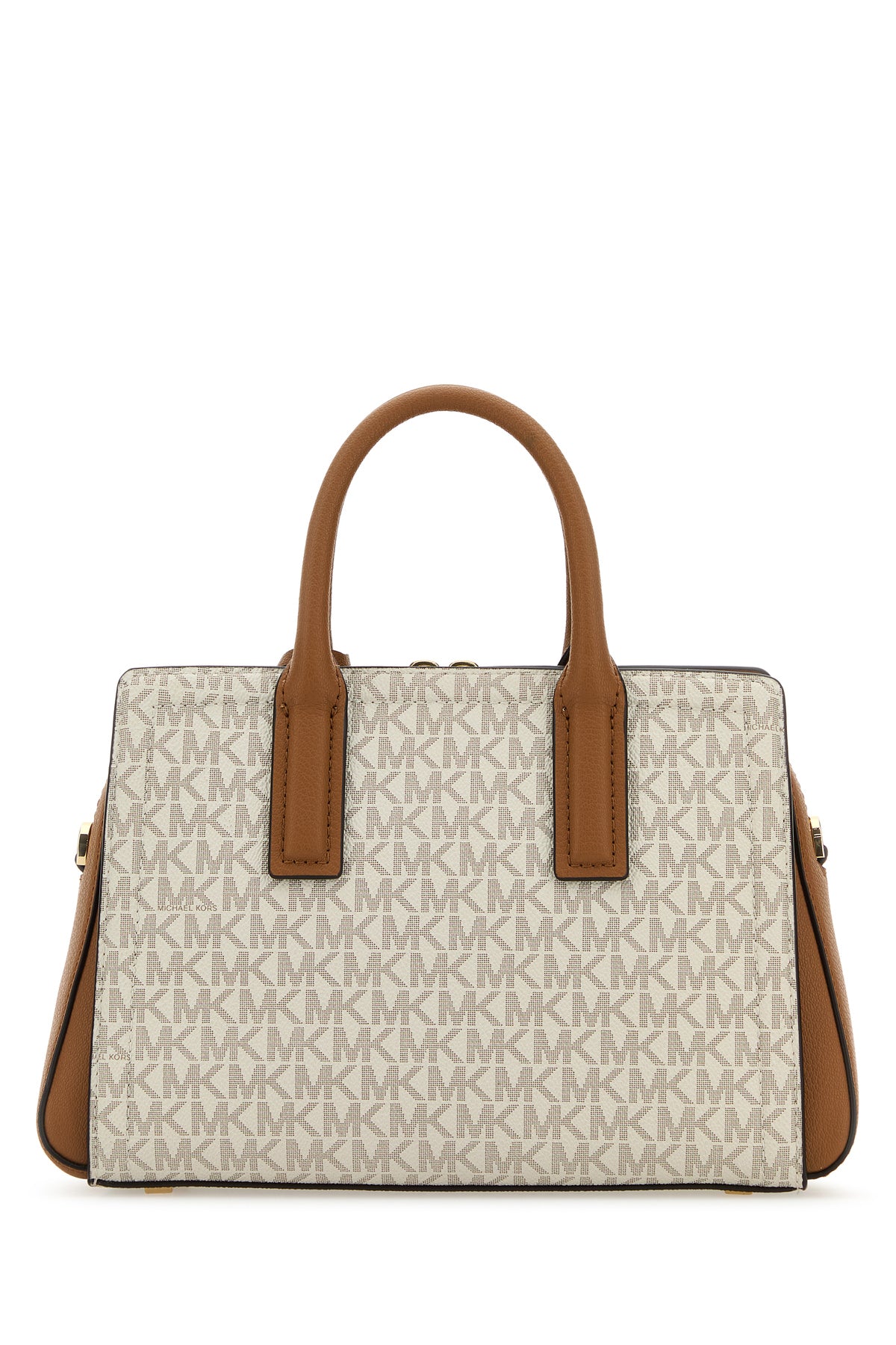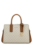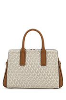 Borsa a mano realizzata in tela rivestita caratterizzata da logo stampato su tutta la superficie arricchita da logo in lettere metalliche sulla parte frontale.