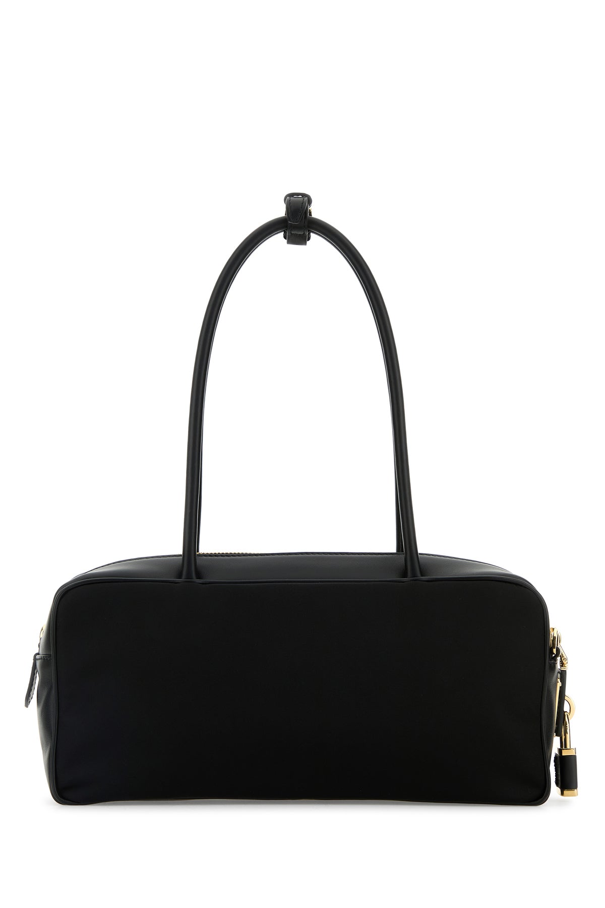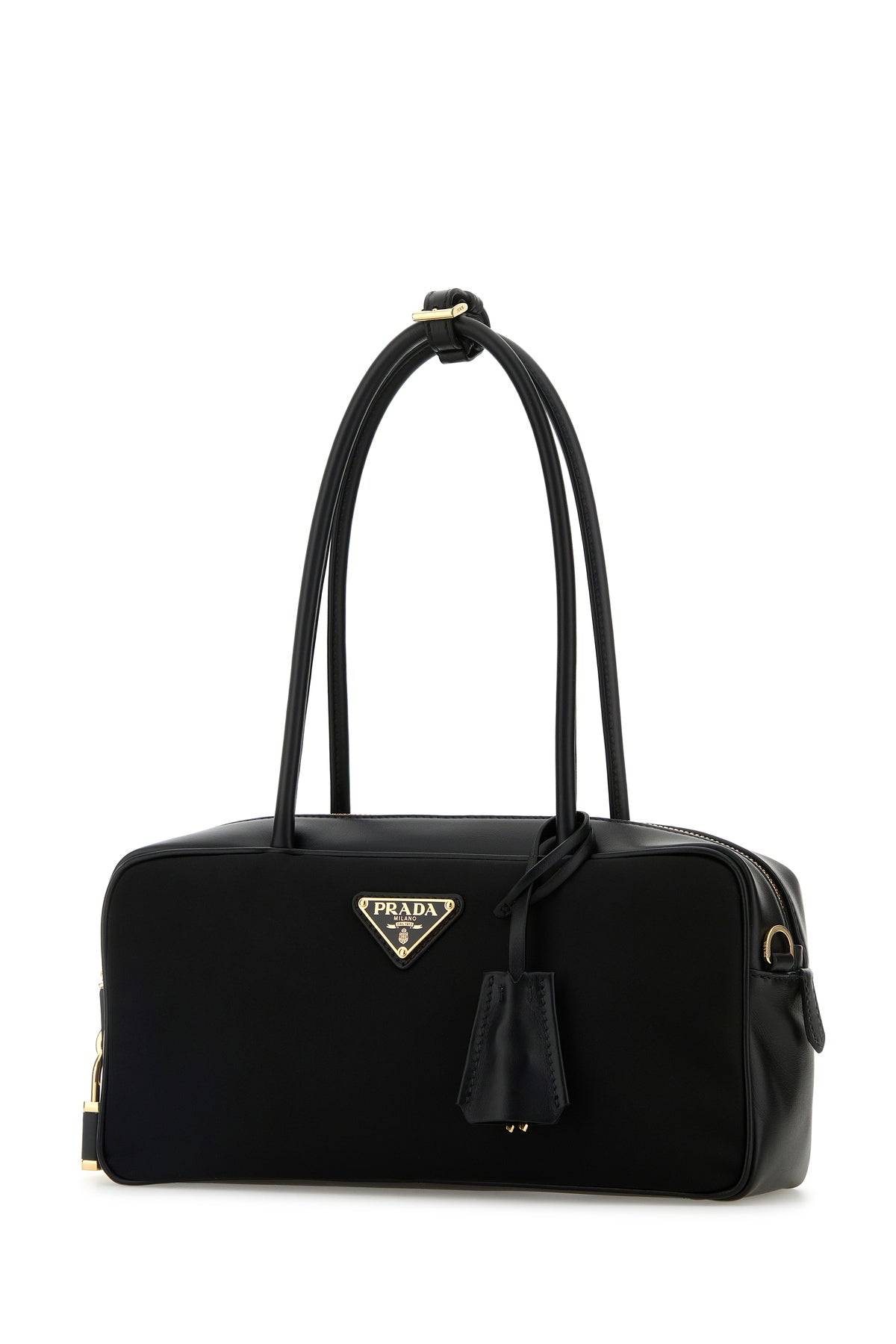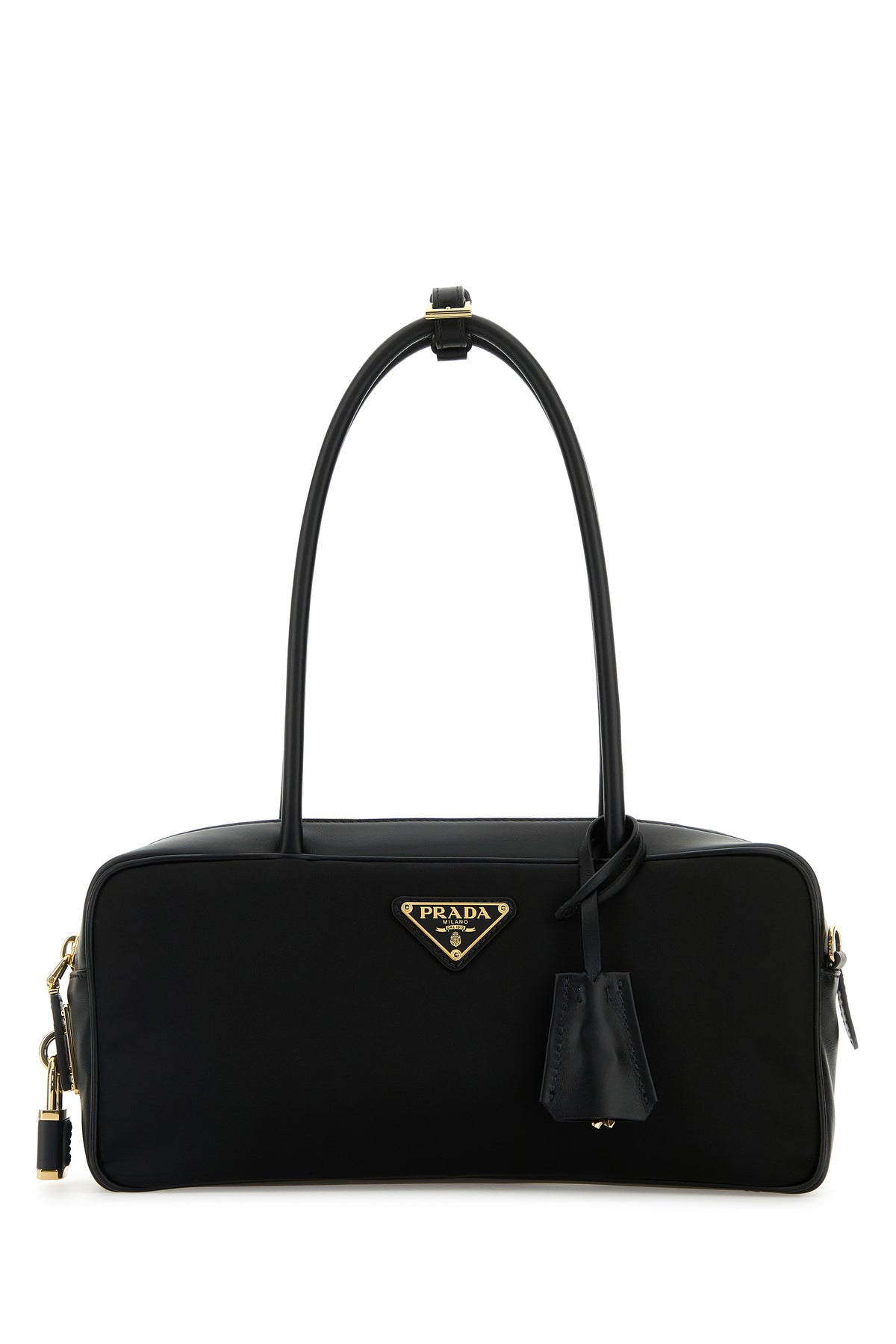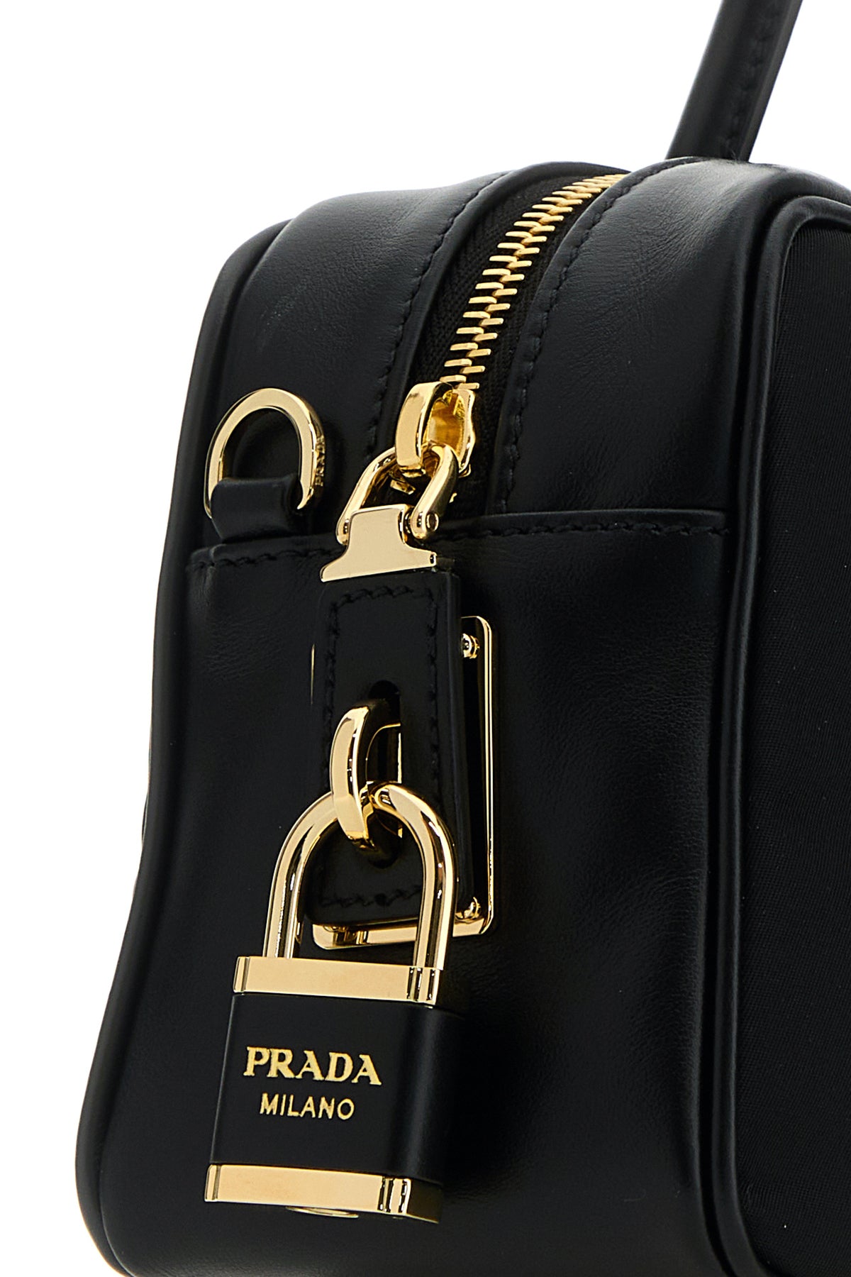 Bauletto realizzato in pelle di vitello liscia e Re-Nylon arricchita da iconico triangolo logato in metallo sulla parte frontale, lucchetto logato sul lato e accessorio in pelle amovibile.
