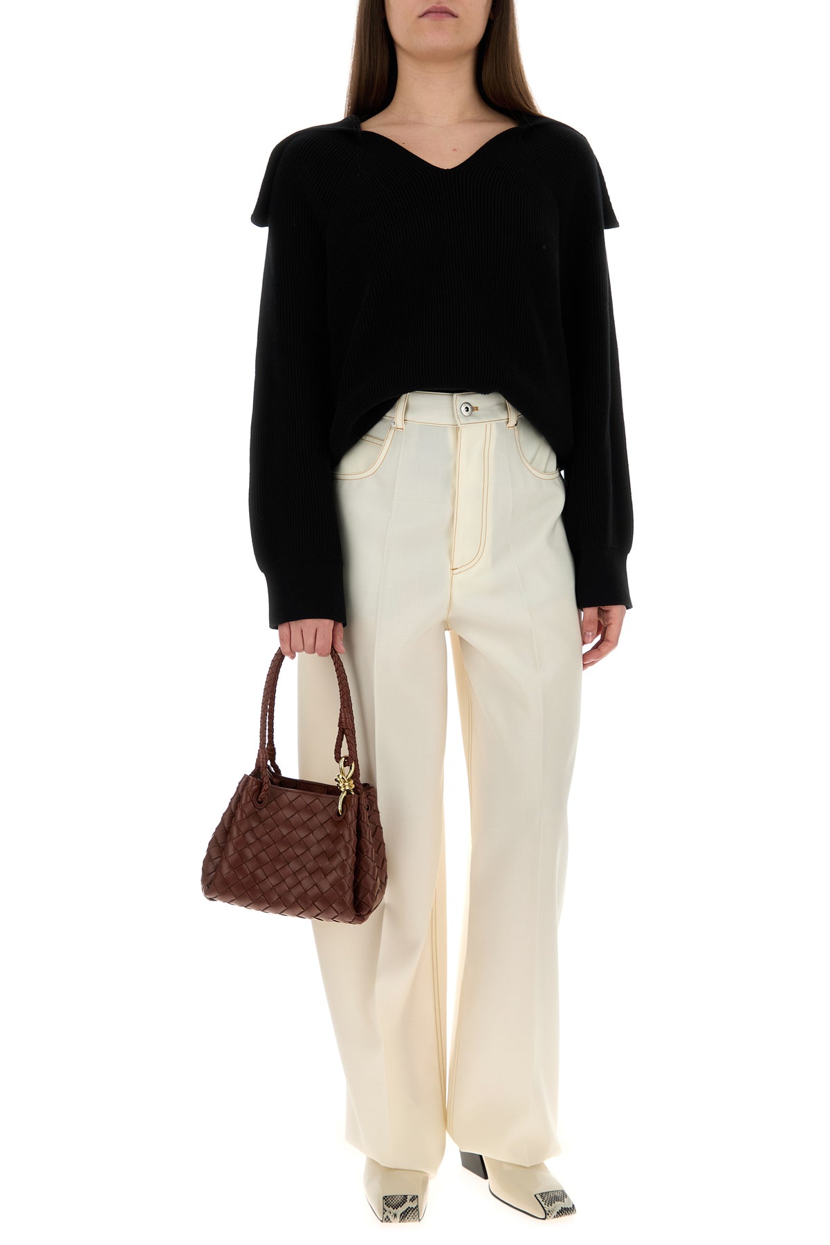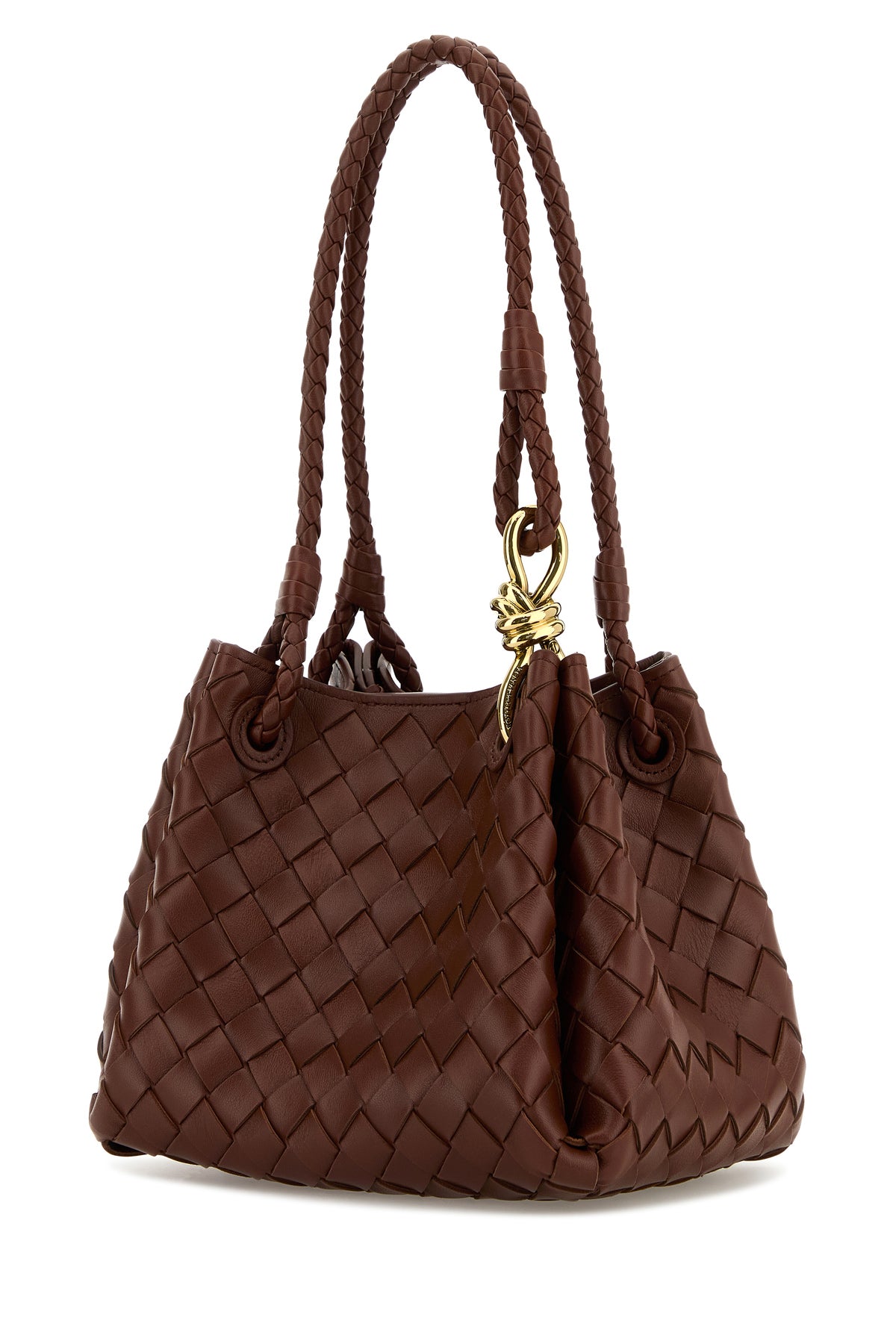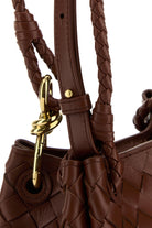 Borsa a mano realizzata in pelle di agnello caratterizzata da iconico motivo Intrecciato su tutta la superficie arricchita da dettaglio metallico Knot sulla parte frontale.