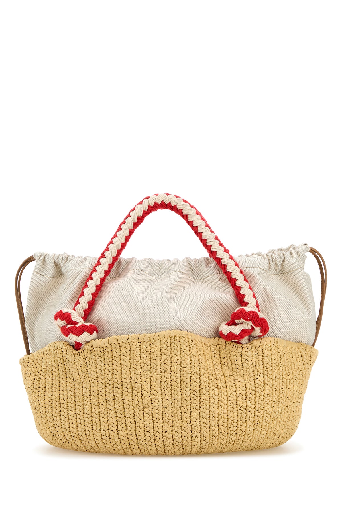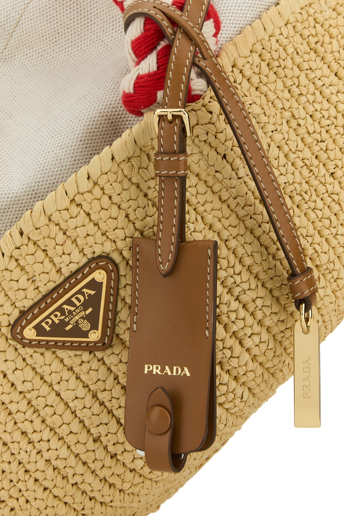 Borsa a mano realizzata in rafia arricchita da iconico triangolo metallico logato sulla parte frontale.