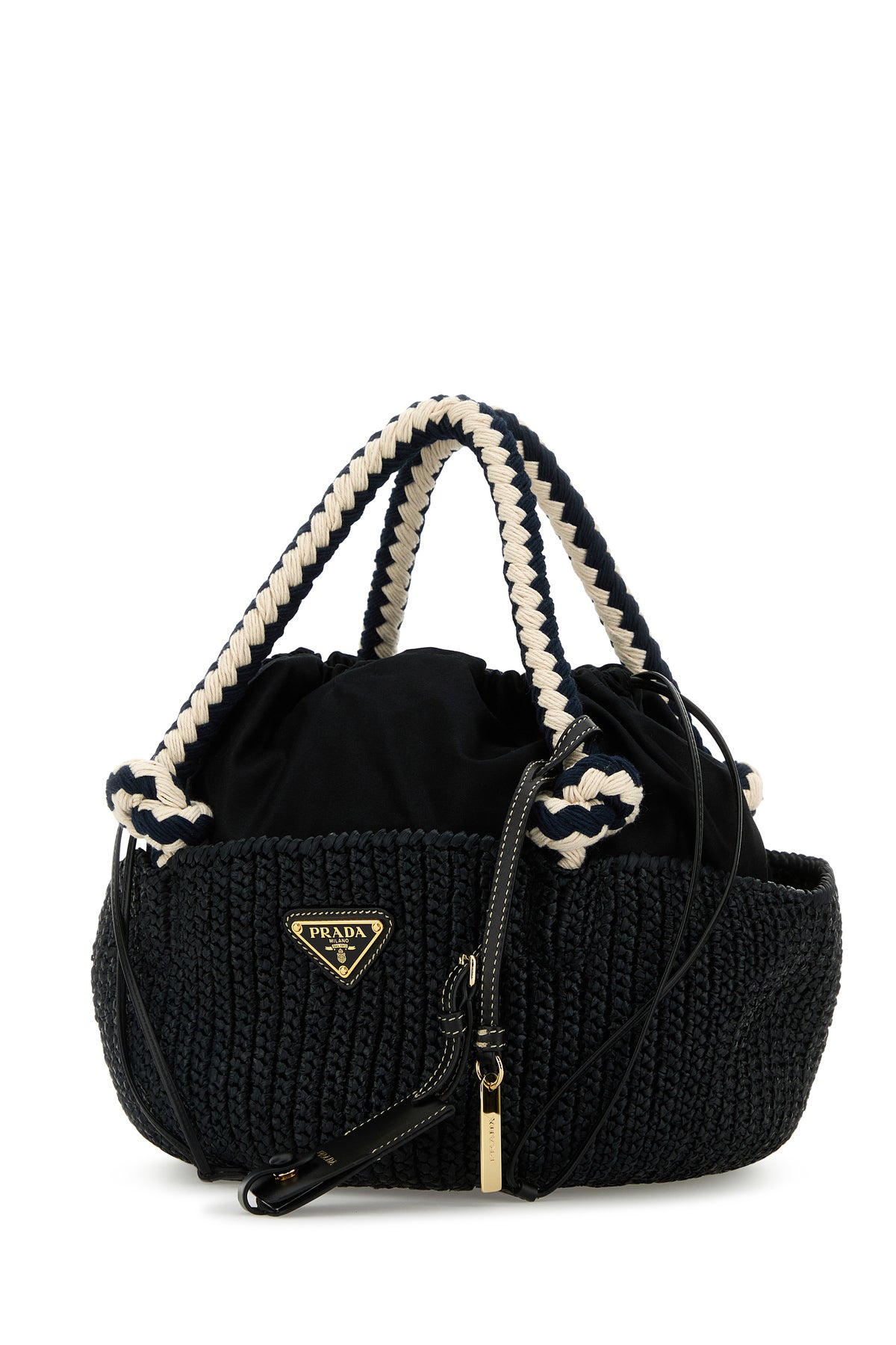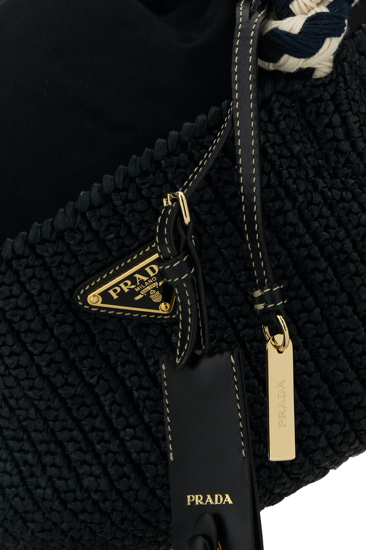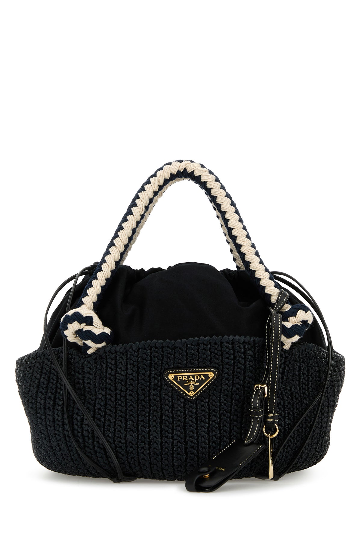 Borsa a mano realizzata in rafia arricchita da iconico triangolo metallico logato sulla parte frontale.