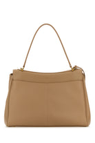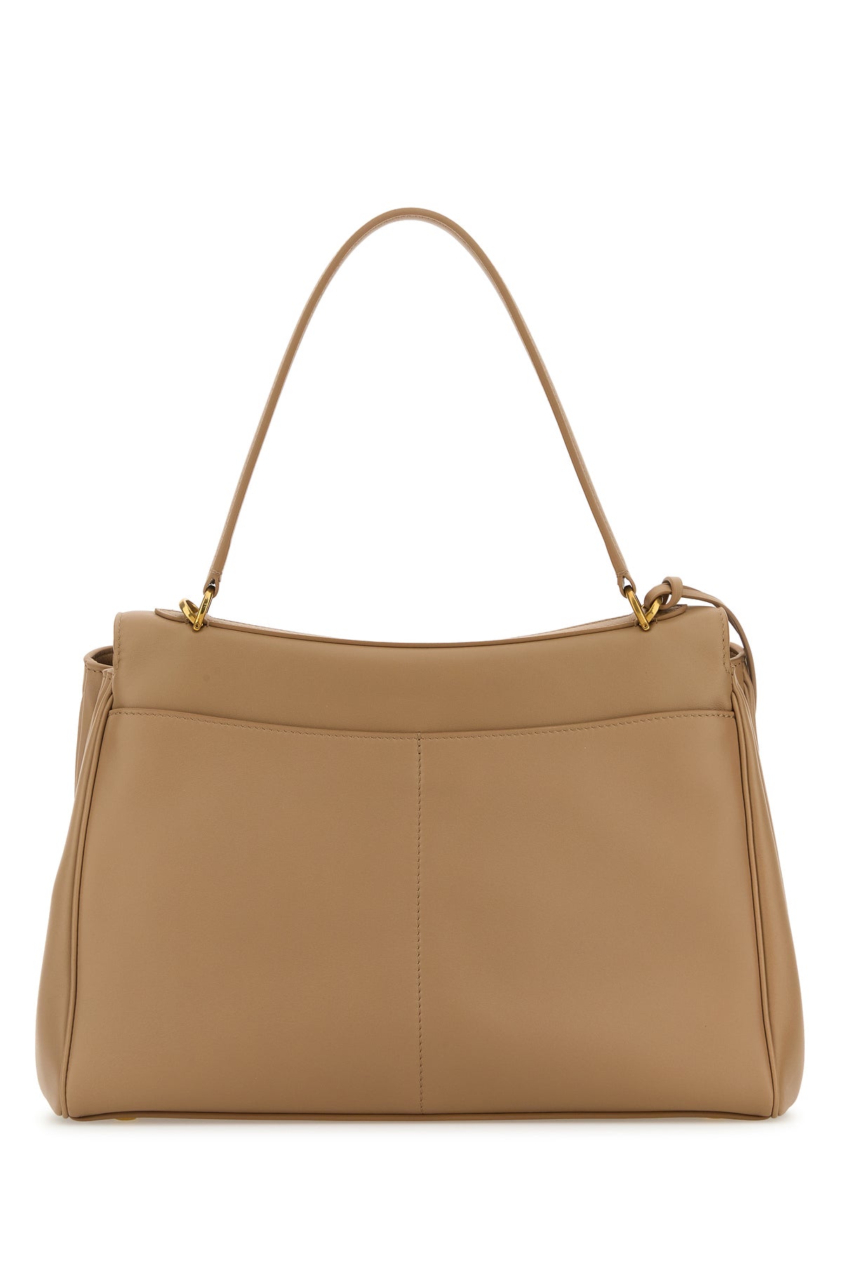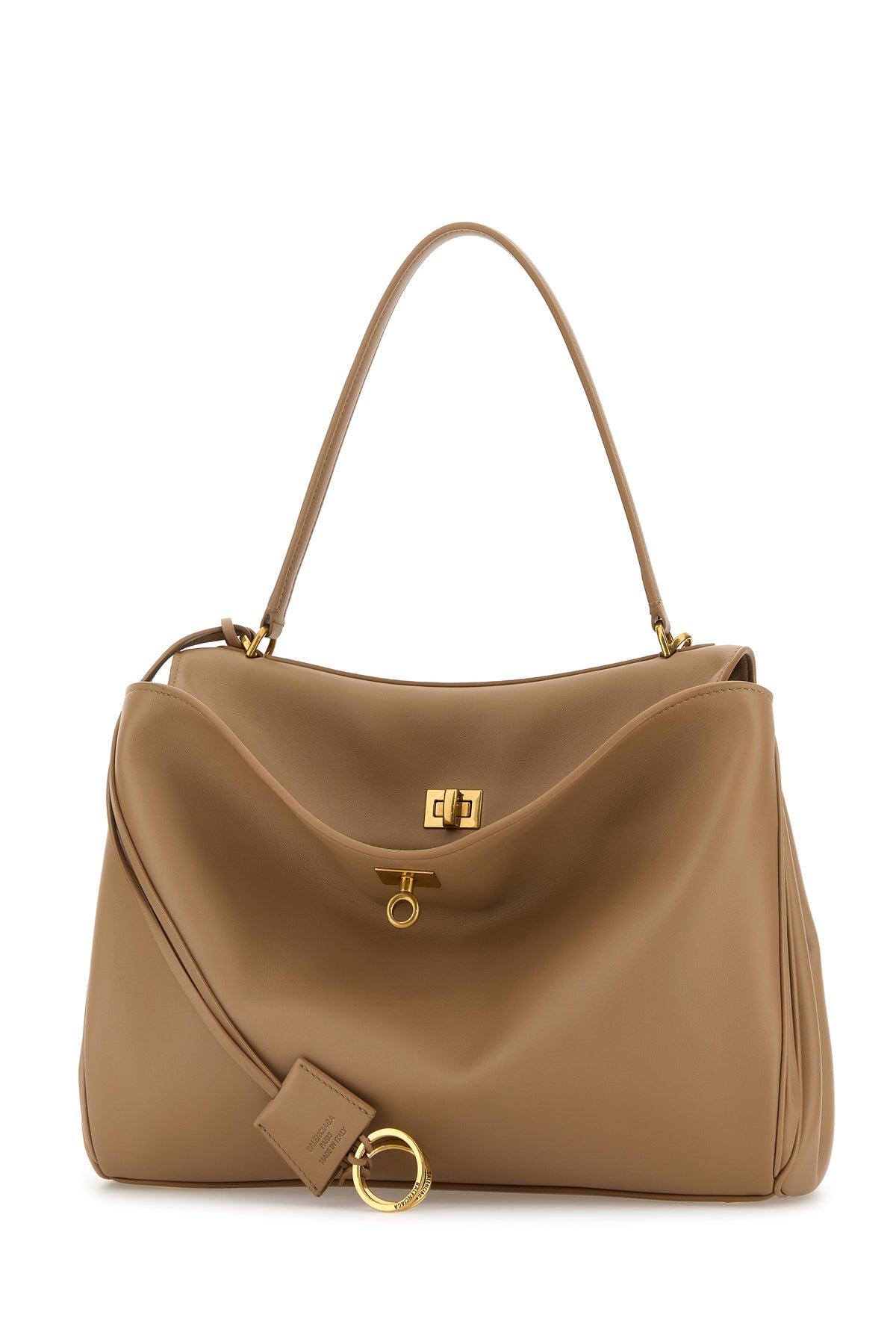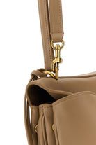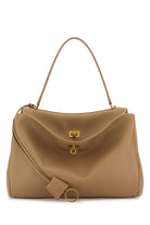 Borsa a mano realizzata in pelle di vitello liscia arricchita da accessorio amovibile in pelle tonale con anelli metallici.