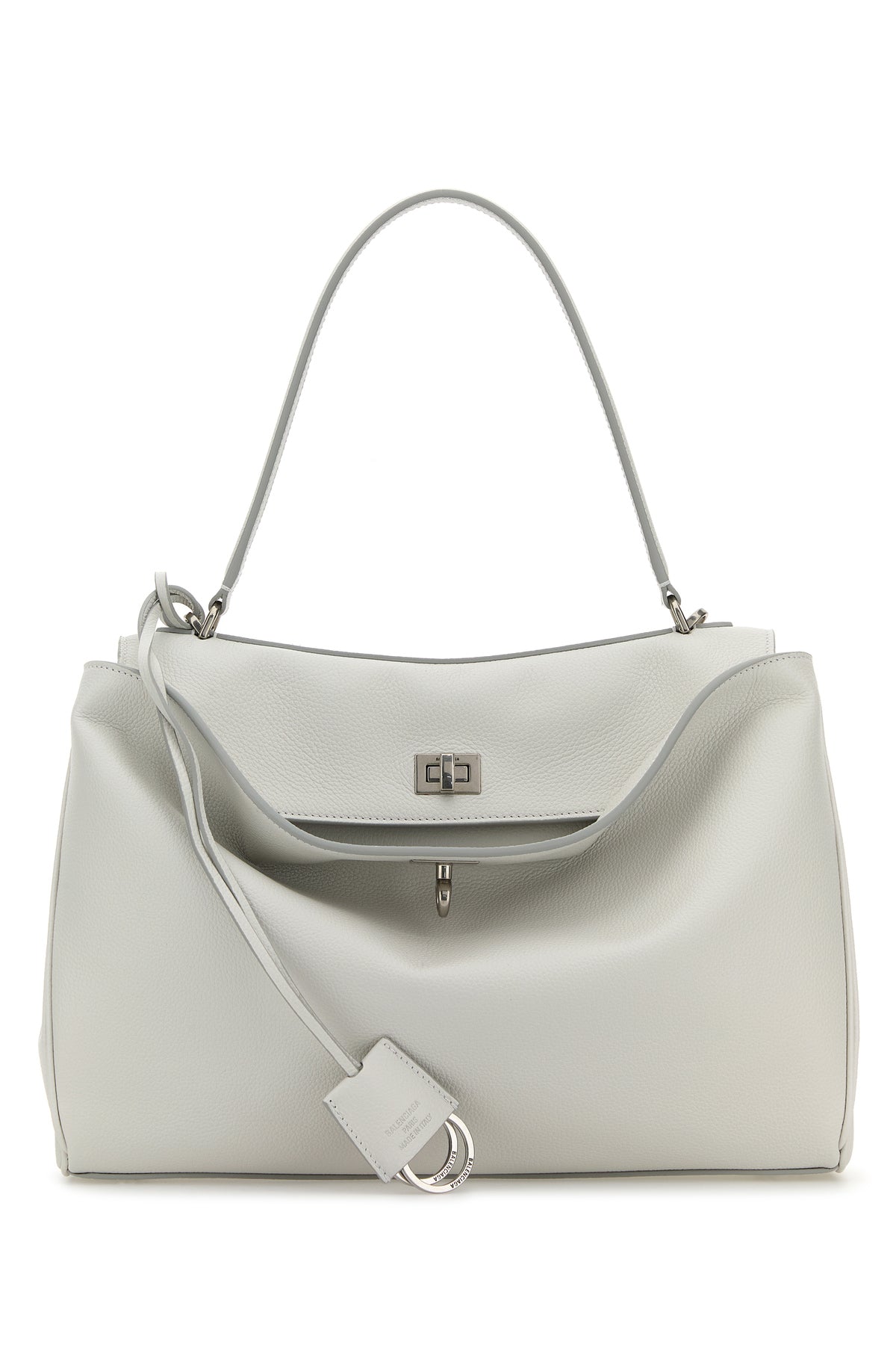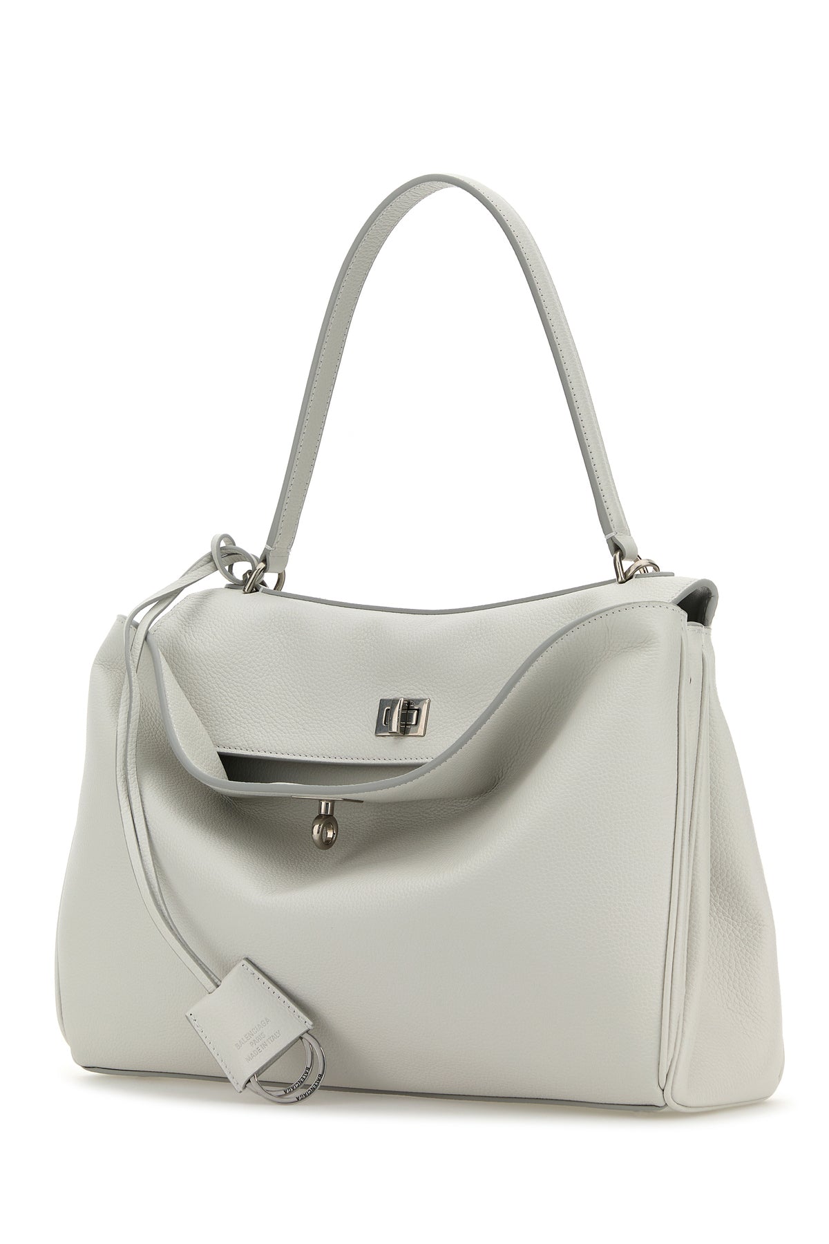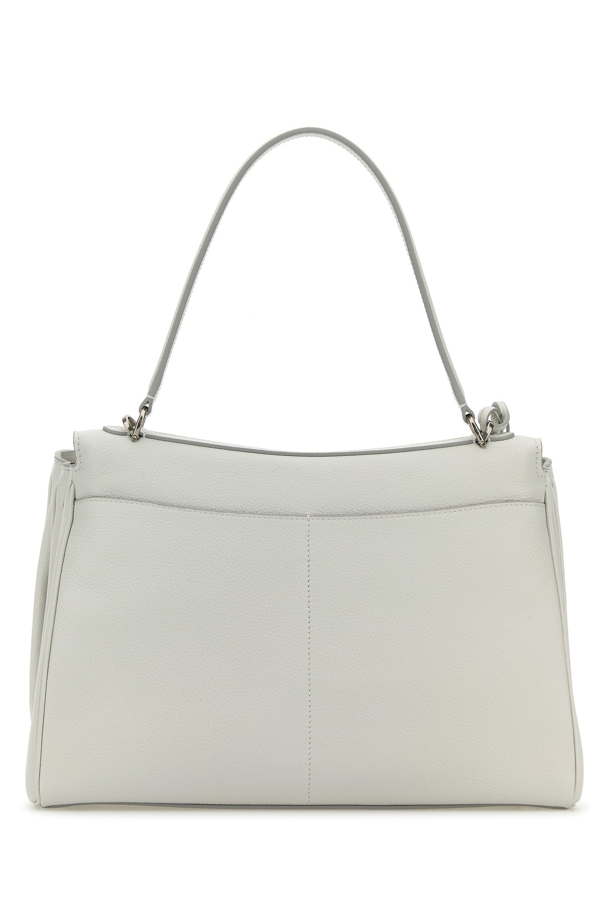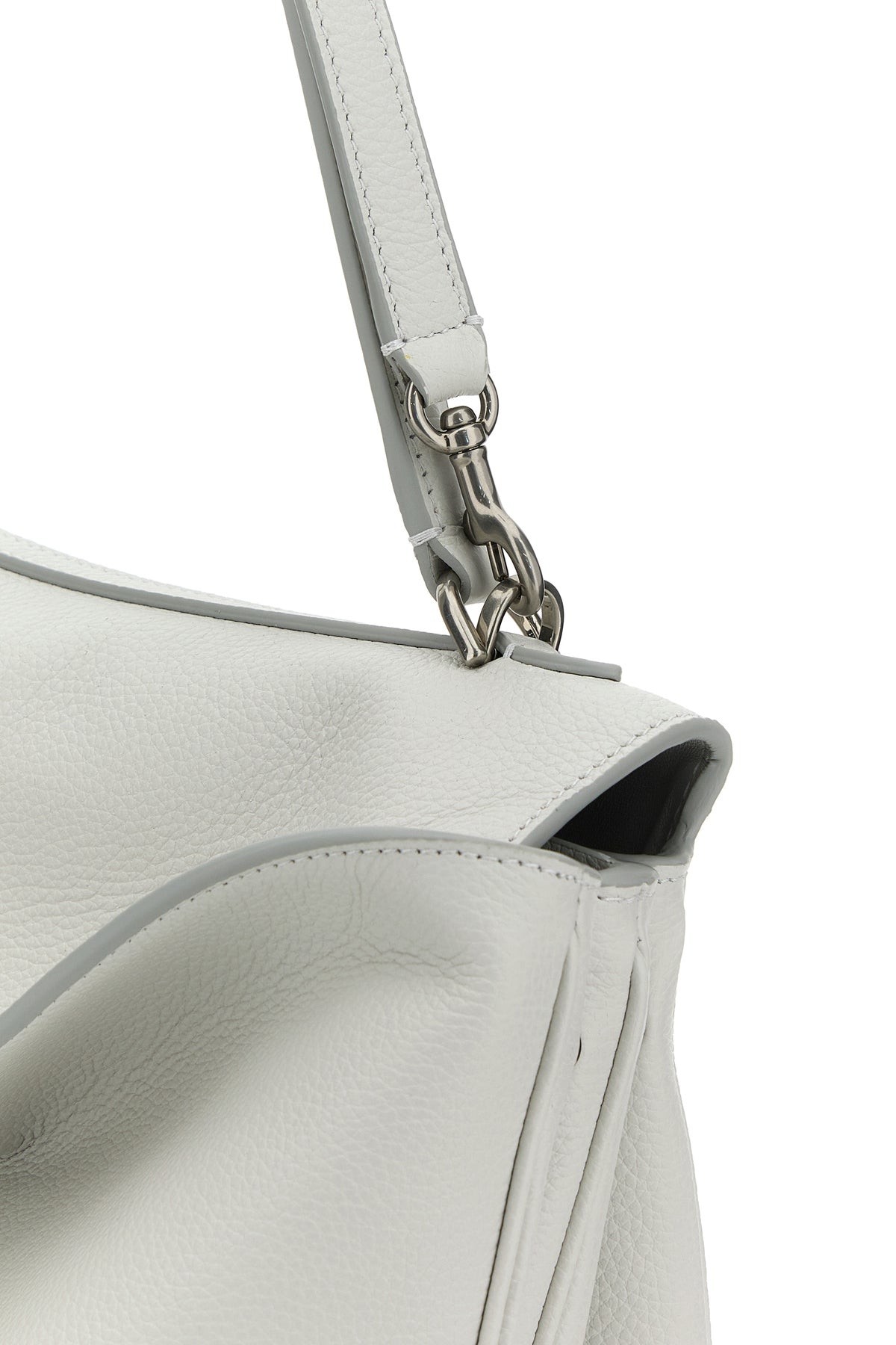 Borsa a mano realizzata in pelle di vitello martellata arricchita da accessorio amovibile in pelle tonale con anelli metallici.