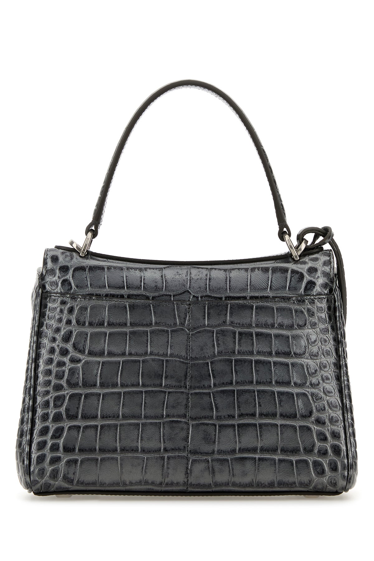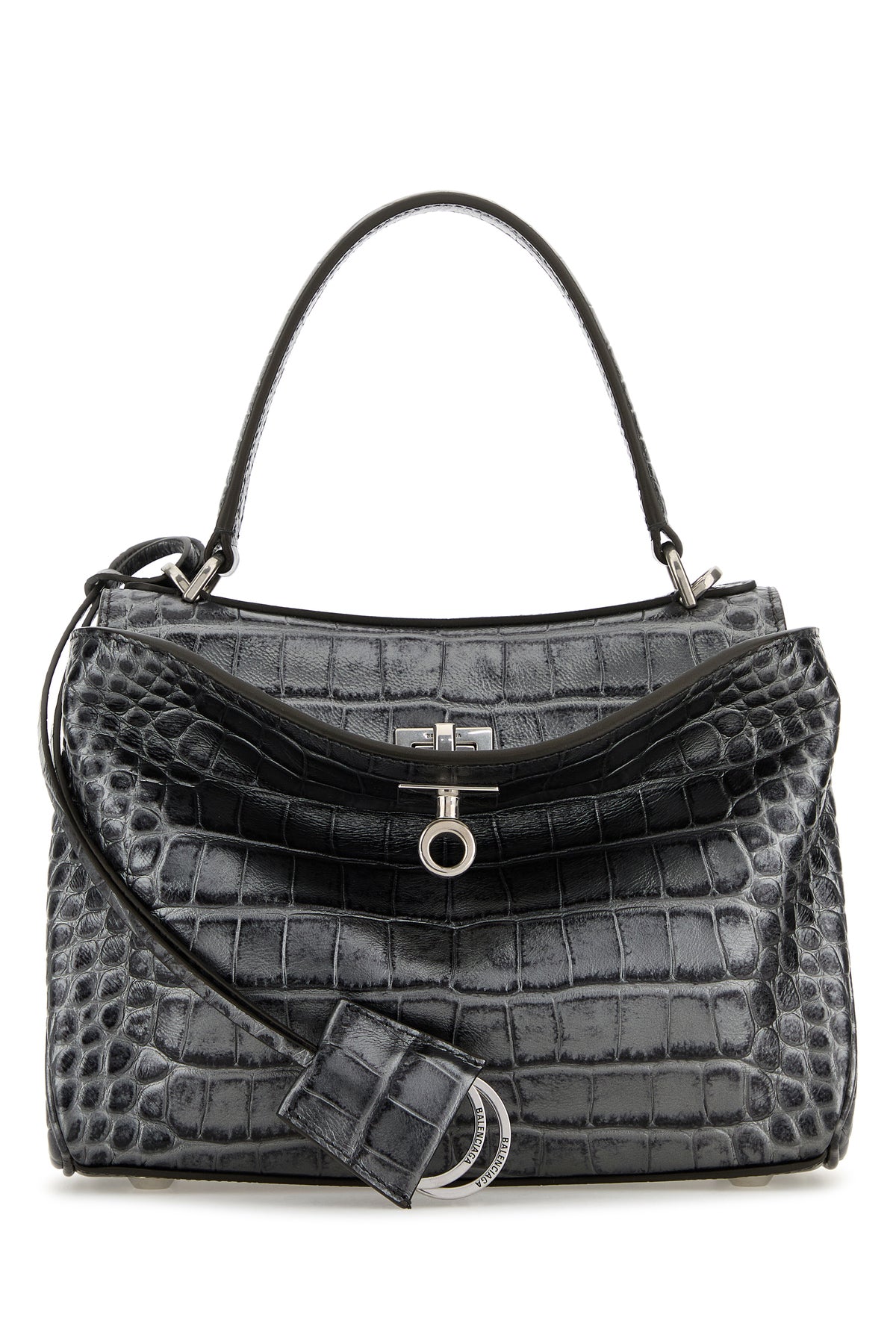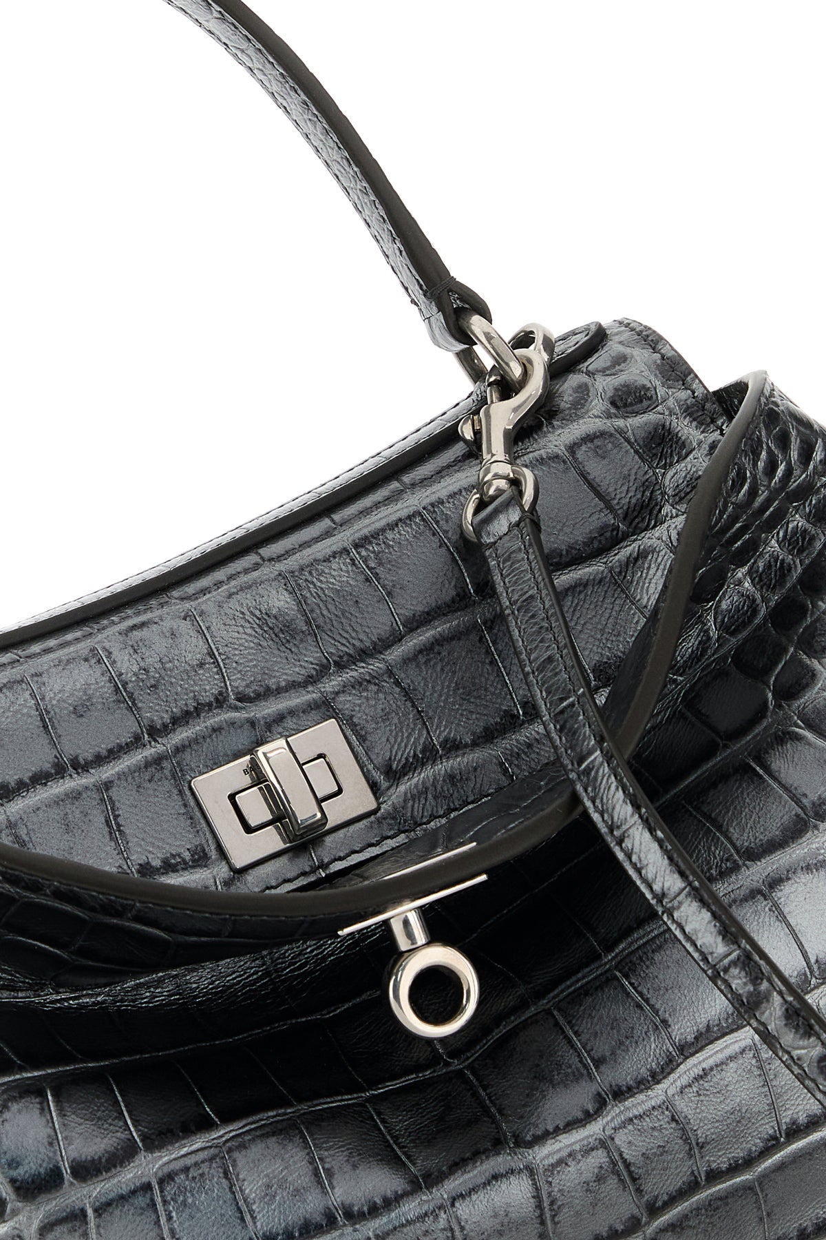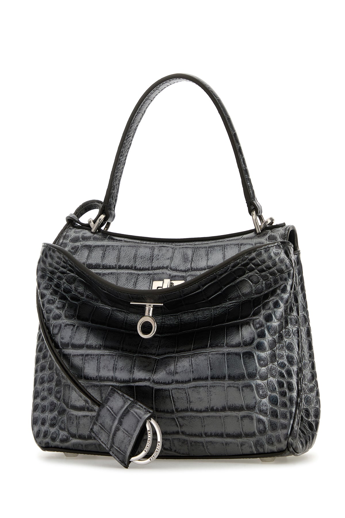 Borsa a mano realizzata in pelle di vitello laminata arricchita da accessorio portachiavi amovibile in pelle tonale e metallo.
