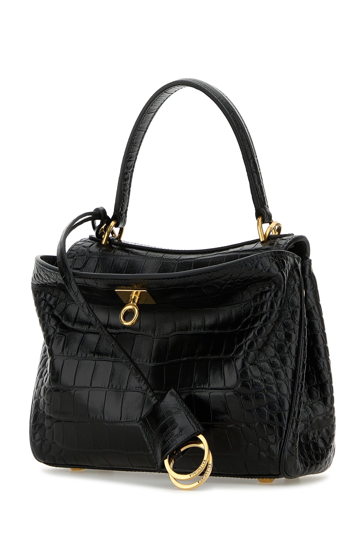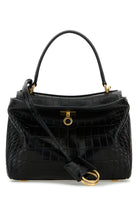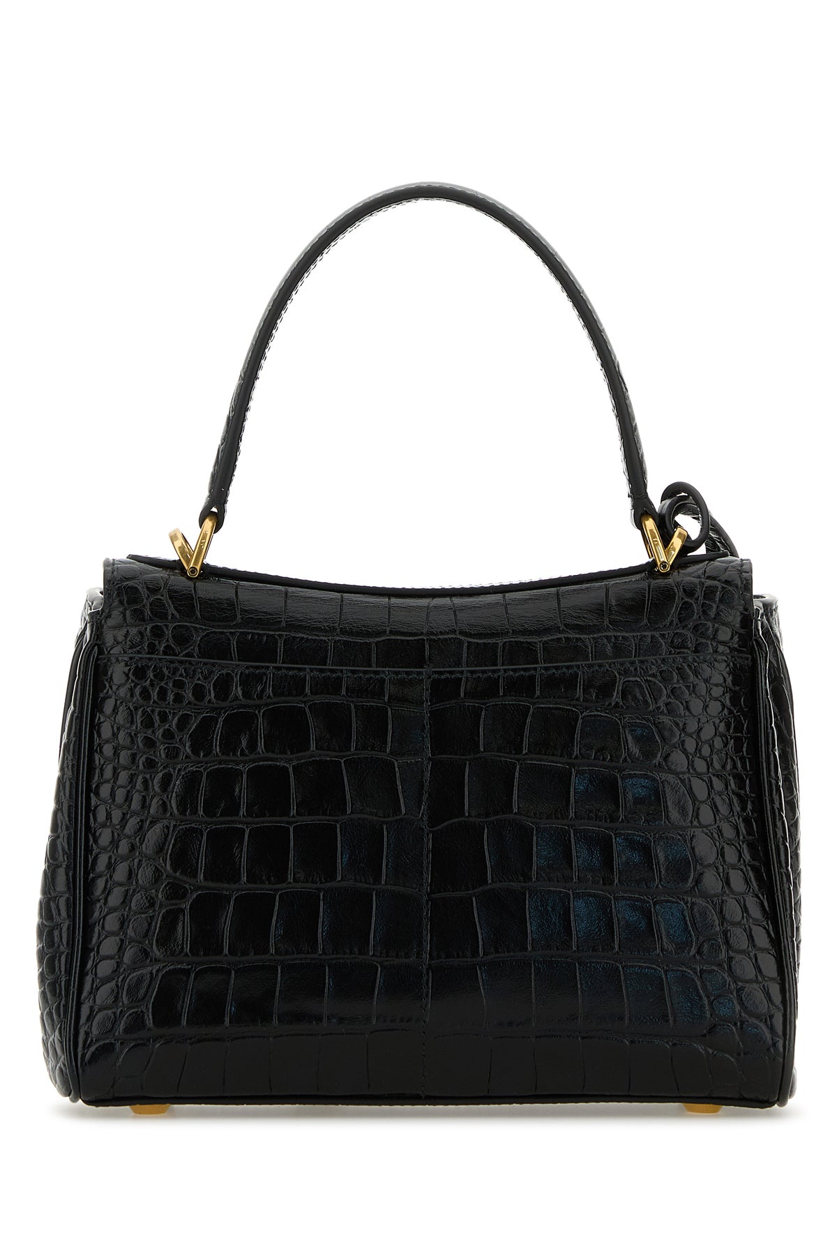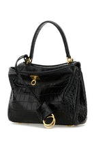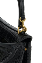 Borsa a mano realizzata in pelle di vitello impressa a motivo coccodrillo arricchita da accessorio portachiavi amovibile in pelle tonale e metallo.
