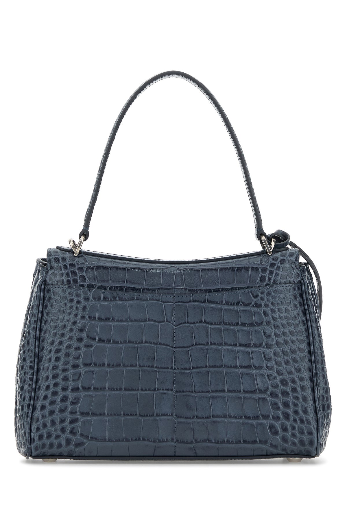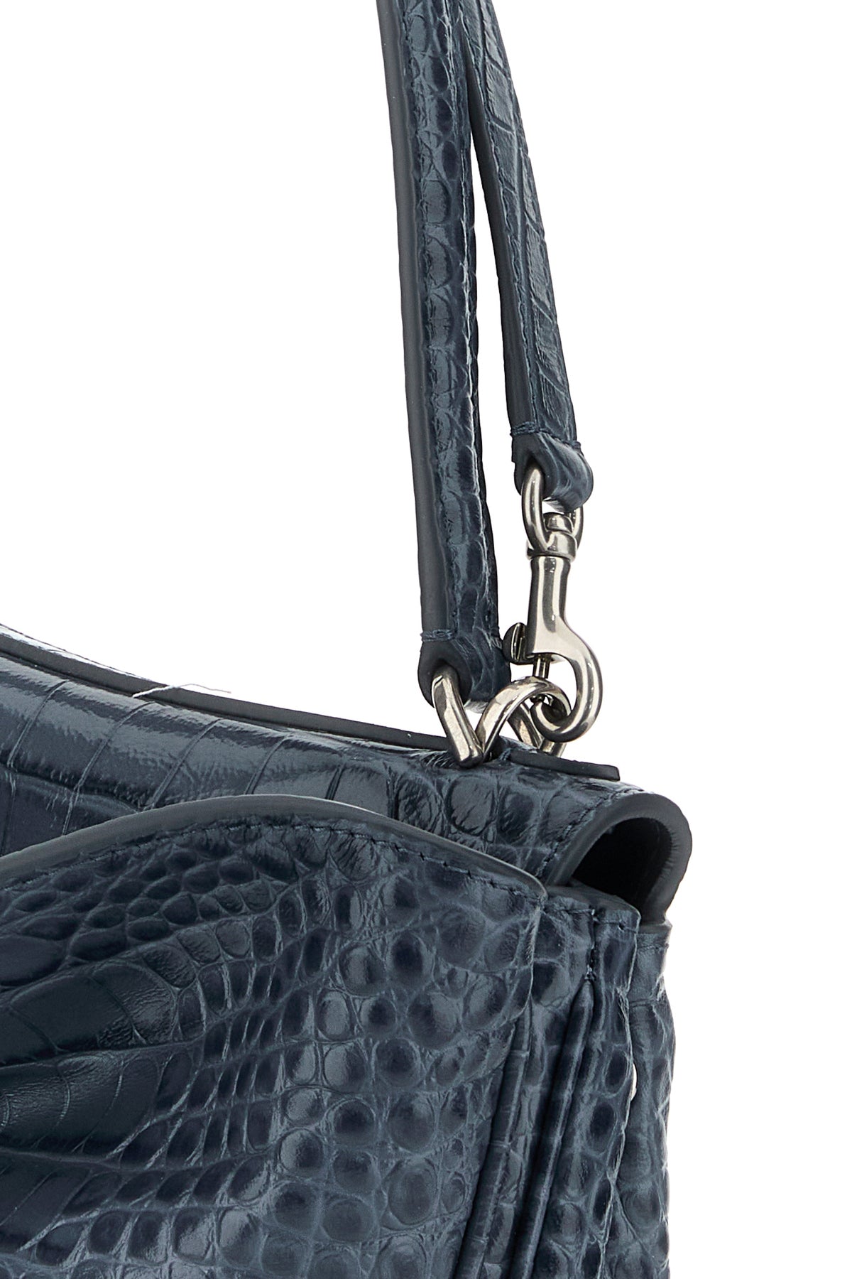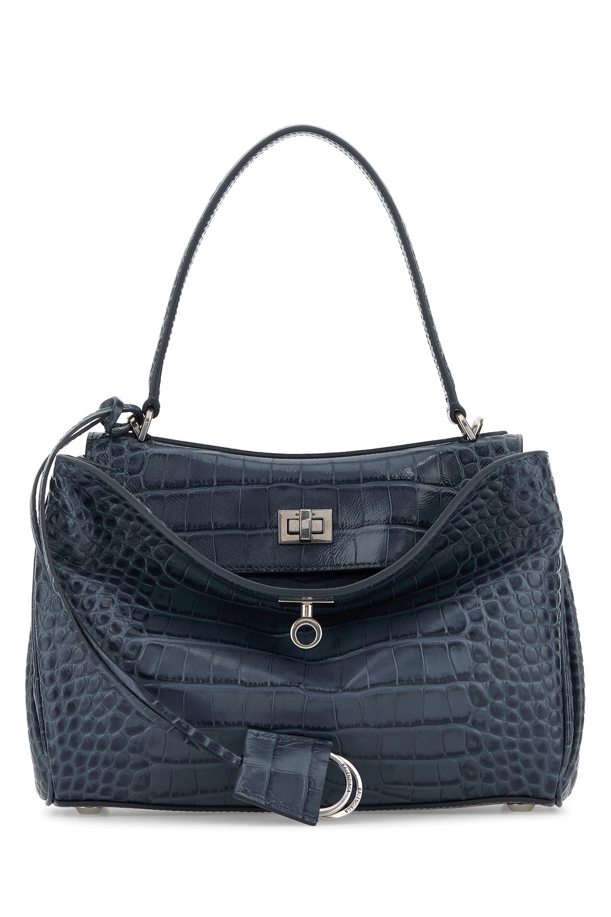 Borsa a mano realizzata in pelle di vitello impressa a motivo coccodrillo arricchita da accessorio amovibile in pelle tonale con anelli metallici.