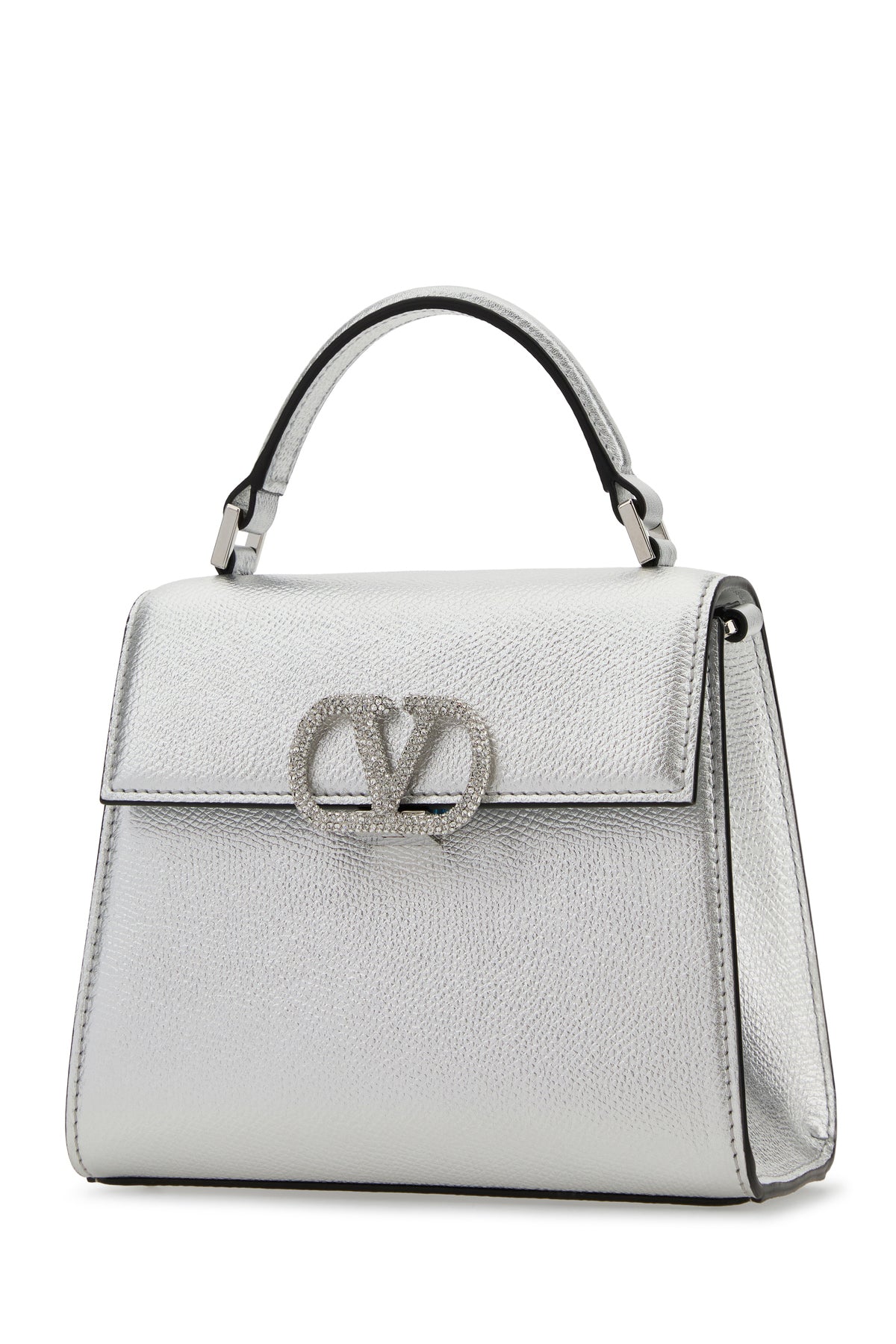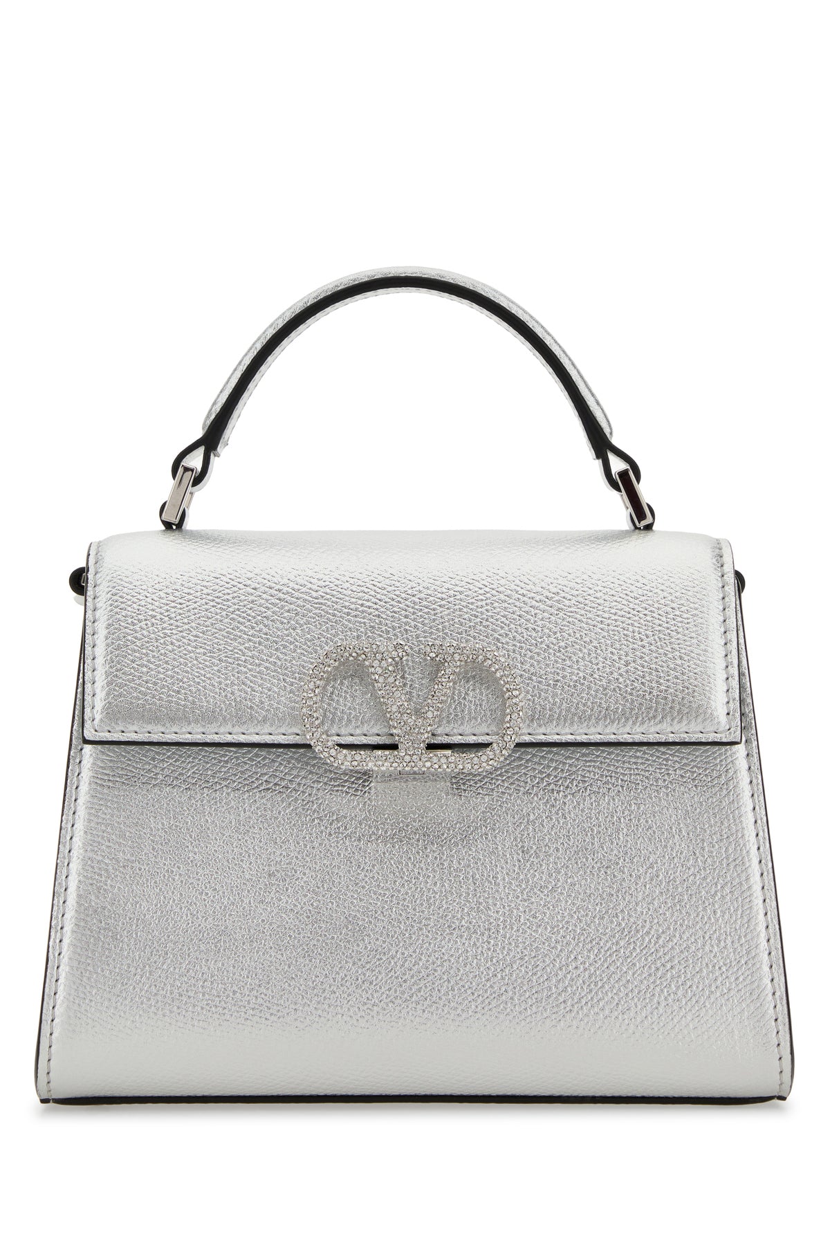 Borsa a mano realizzata in pelle zigrinata laminata arricchita da dettaglio metallico VLogo Signature con cristalli sulla parte frontale.