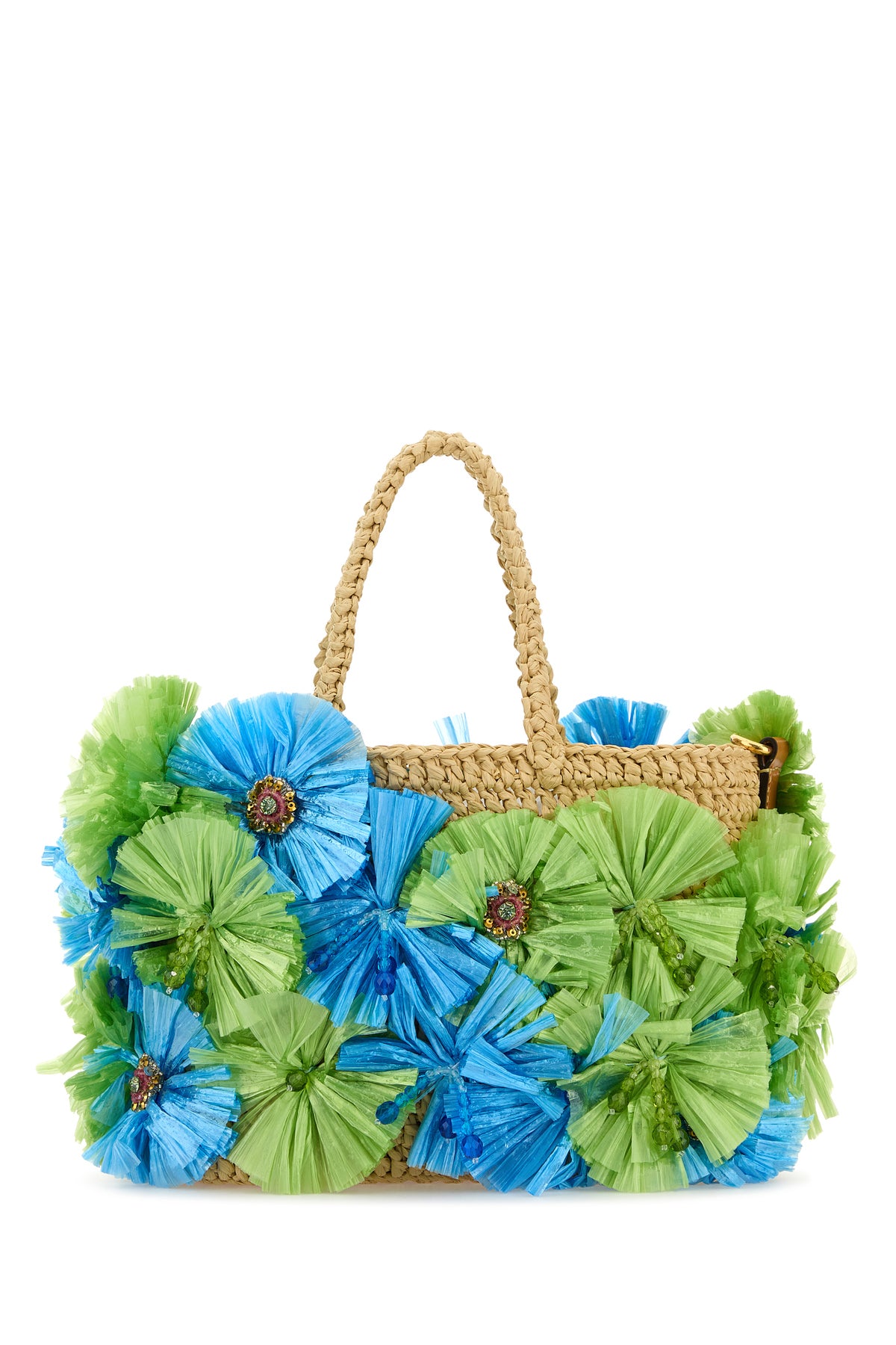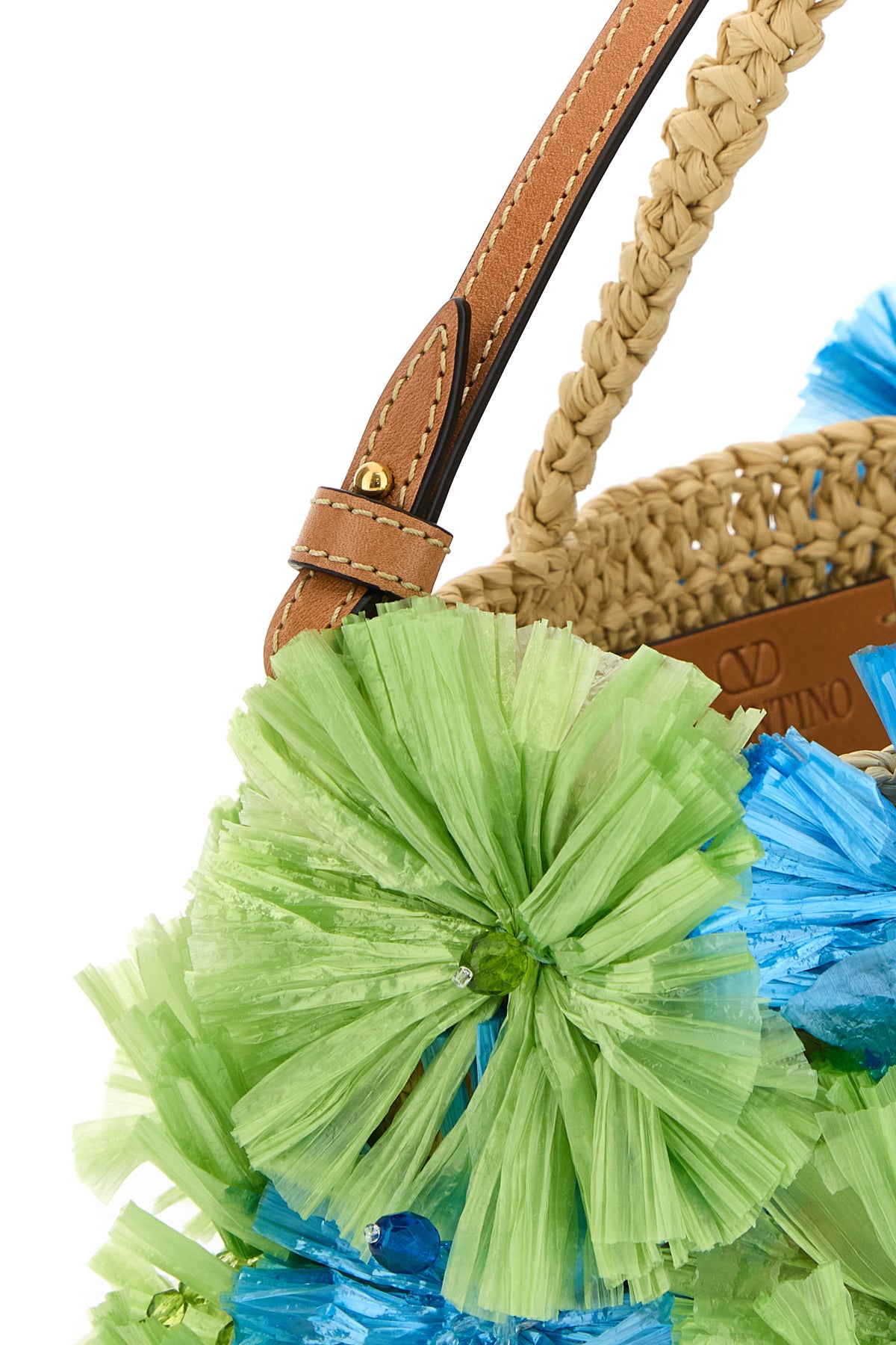Borsa a mano realizzata in rafia arricchita da applicazioni floreali su tutta la superficie e dettaglio metallico VLogo Signature sulla parte frontale.