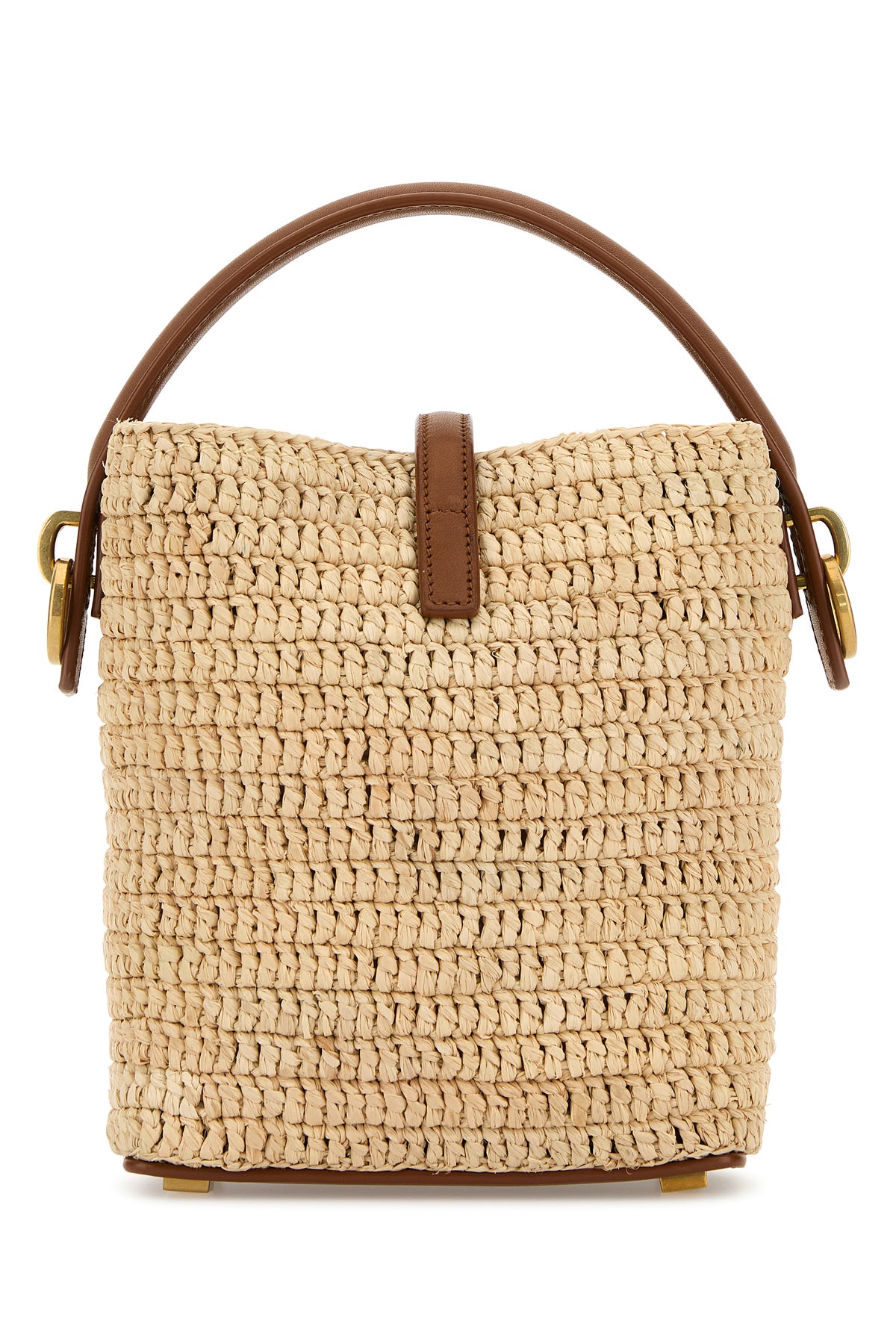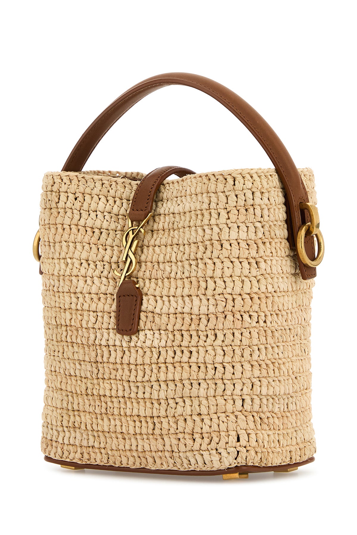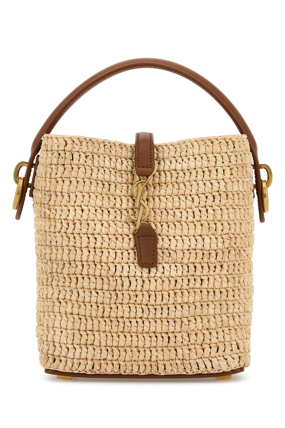 Borsa a secchiello realizzata in rafia arricchita da iconico dettaglio metallico Monogram sulla parte frontale.
