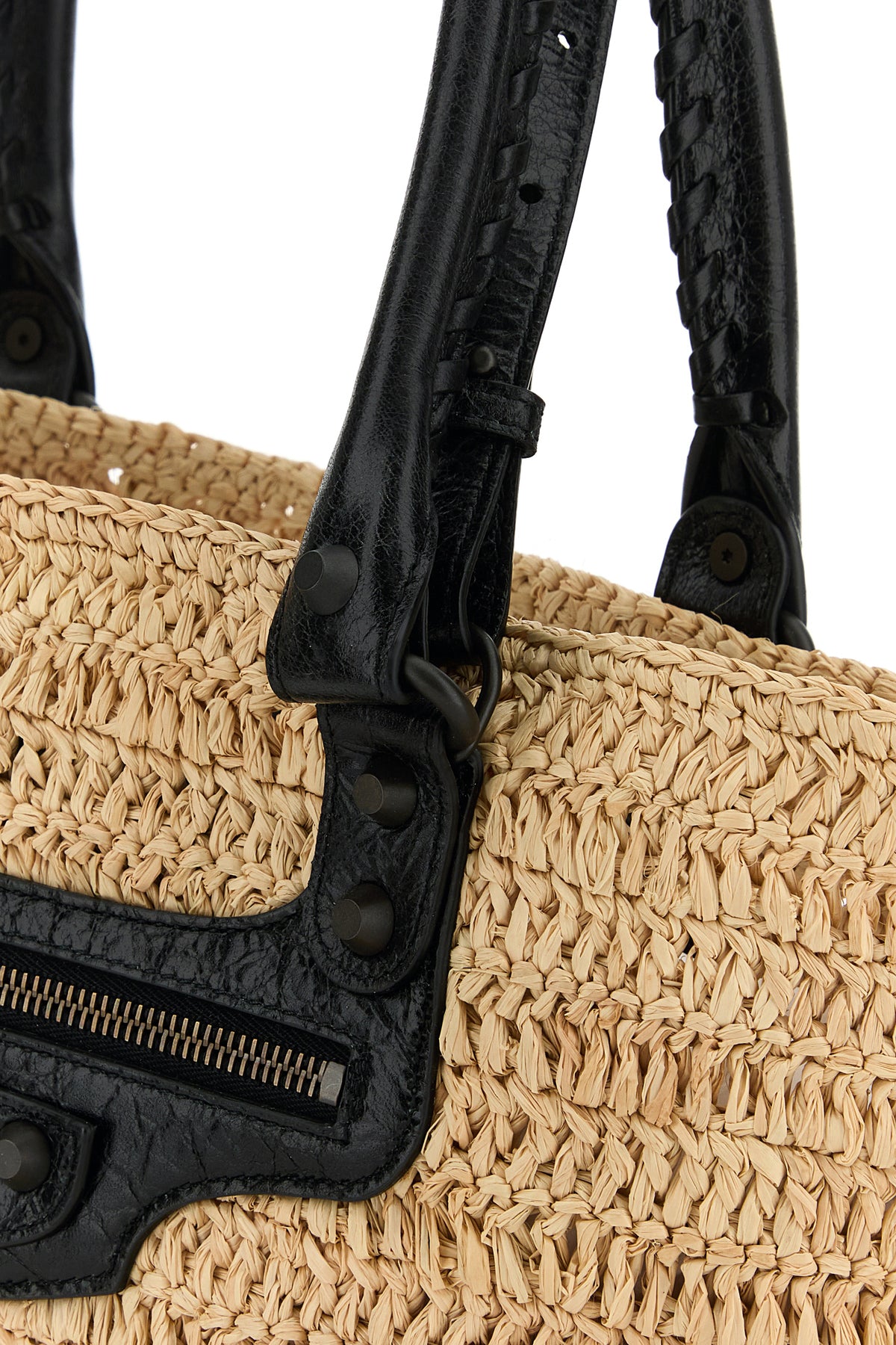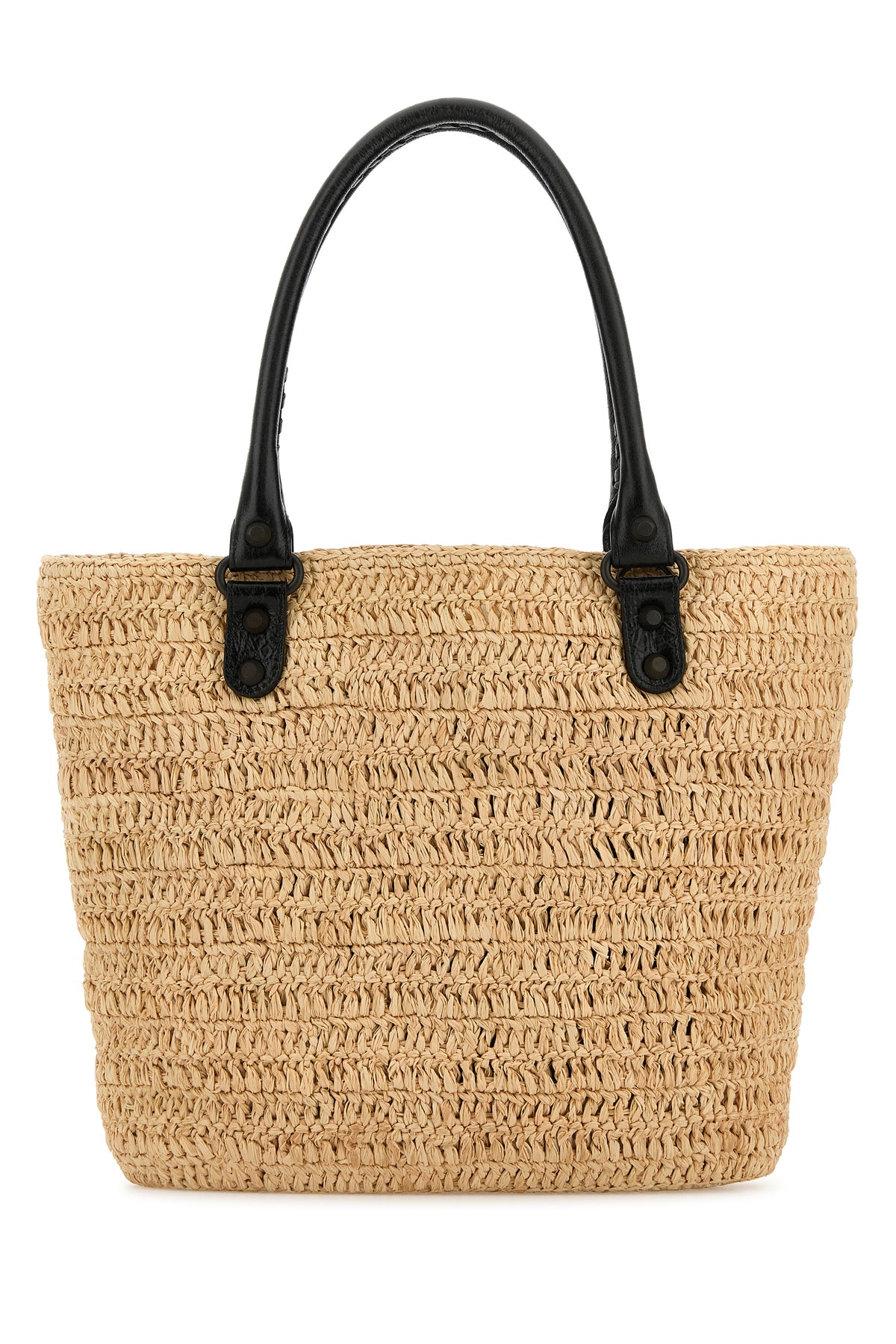 Borsa a secchiello realizzata in rafia arricchita da una tasca a decorativa sulla parte frontale.