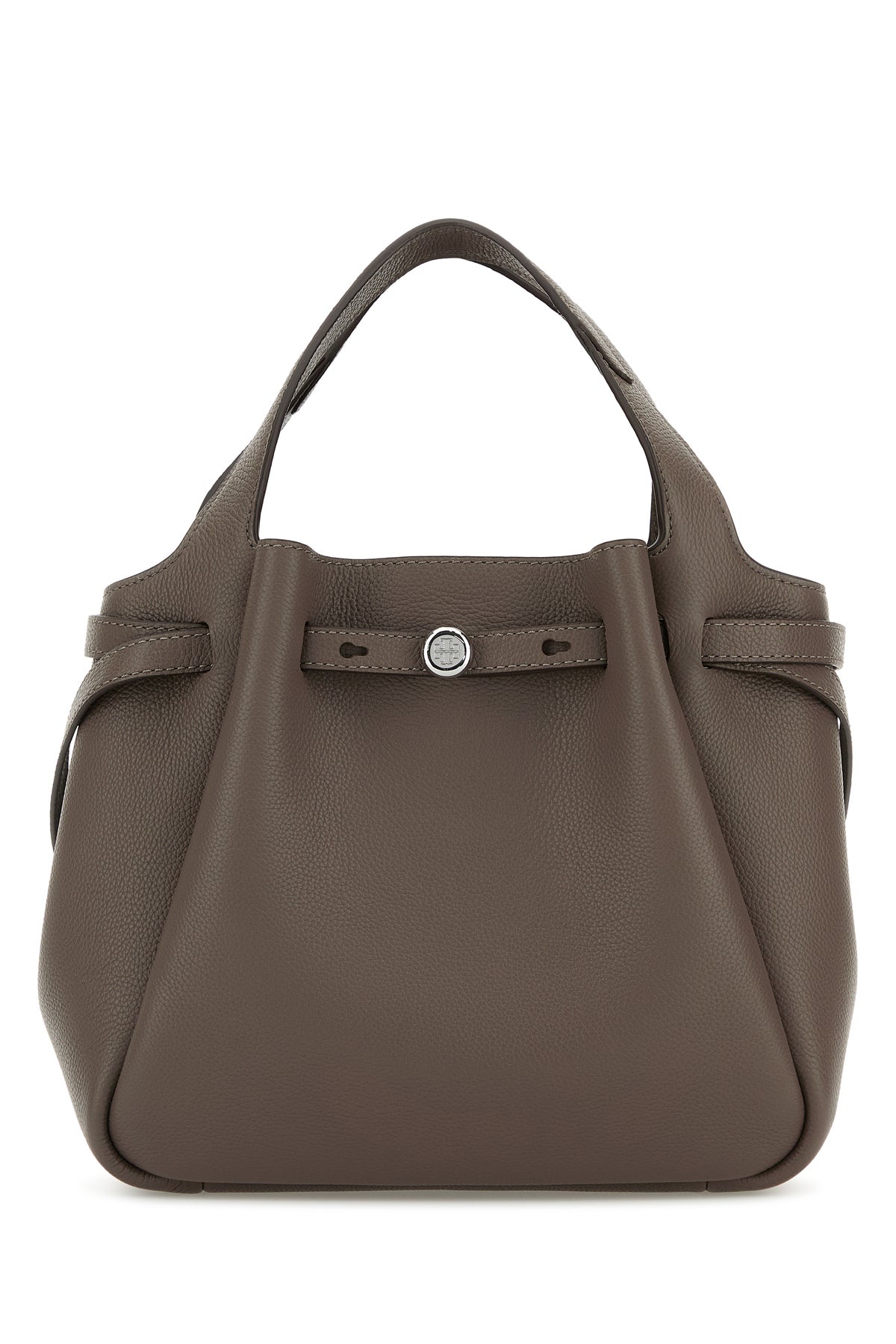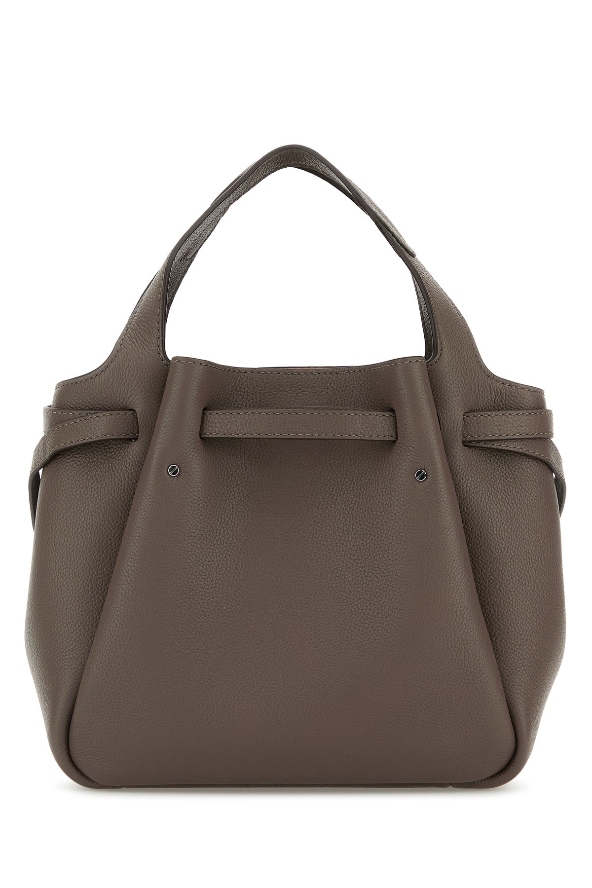 Borsa a secchiello realizzata in pelle martellata arricchita da cinturini di compressione laterali.