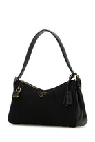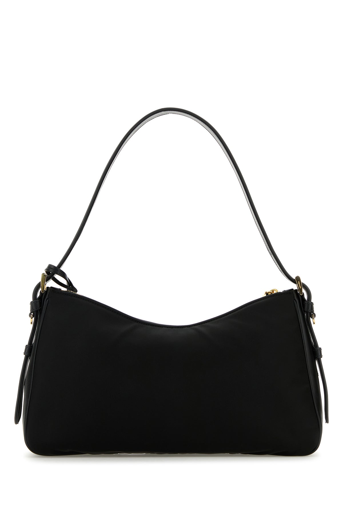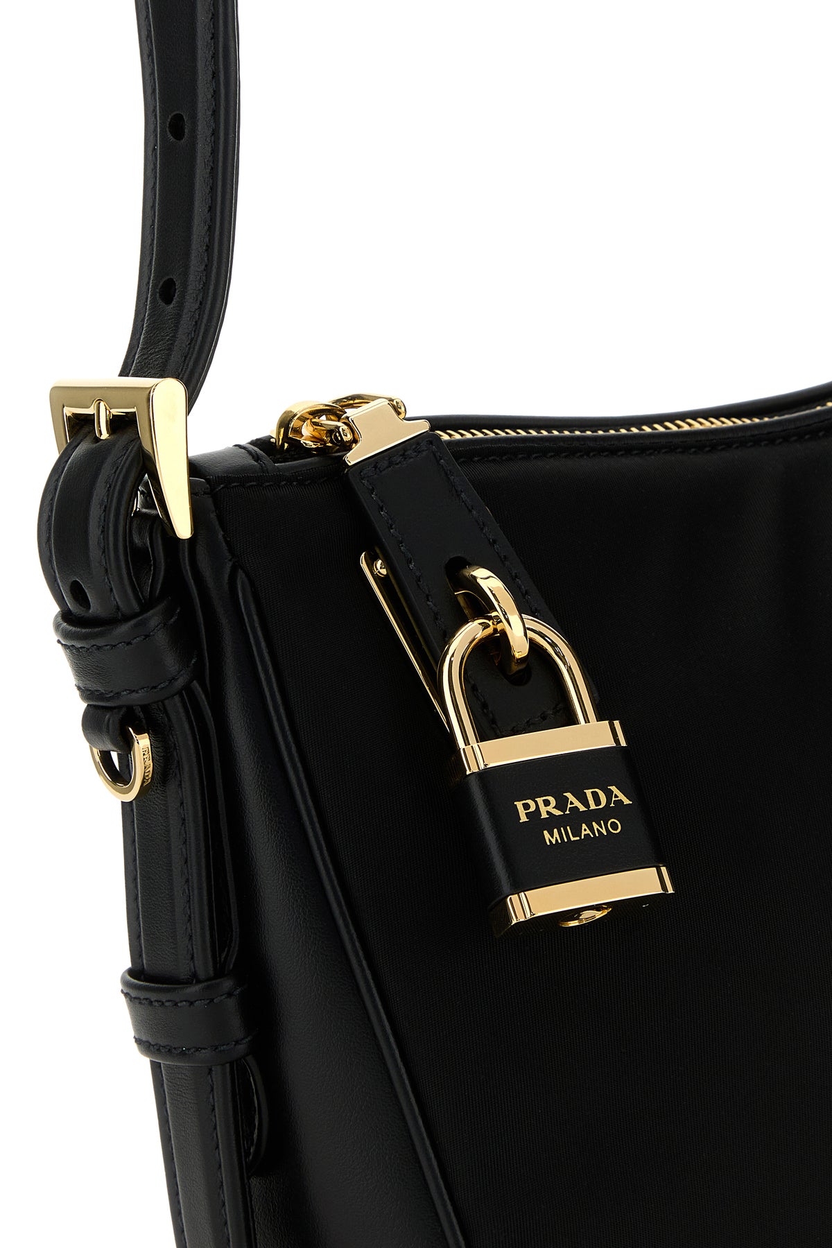 Borsa a spalla realizzata in nylon con inserti in pelle liscia tonale sui lati arricchita da iconico triangolo logato in metallo e lucchetto logato in metallo e pelle sulla parte frontale e accessorio portachiavi amovibile in pelle tonale sul lato.