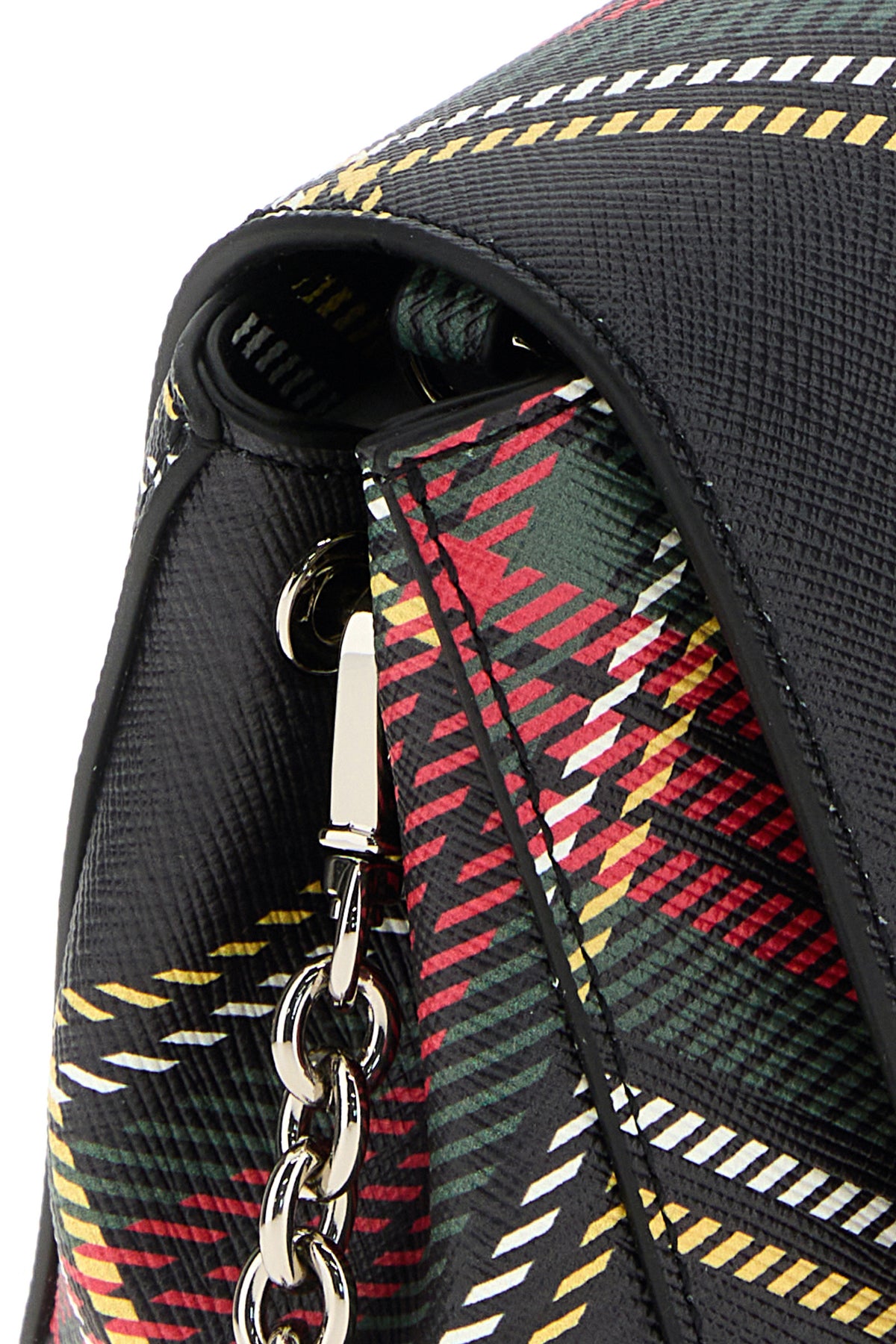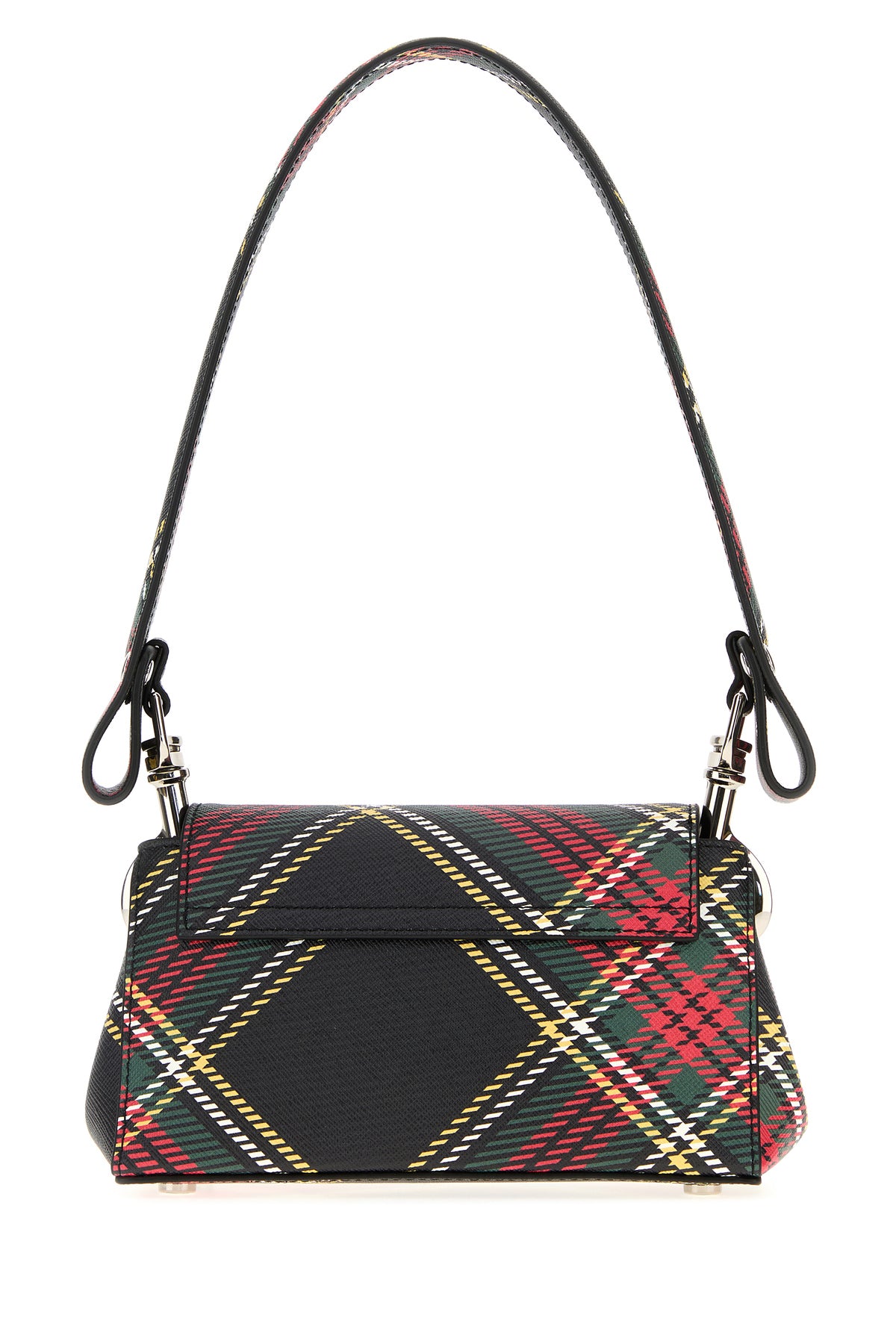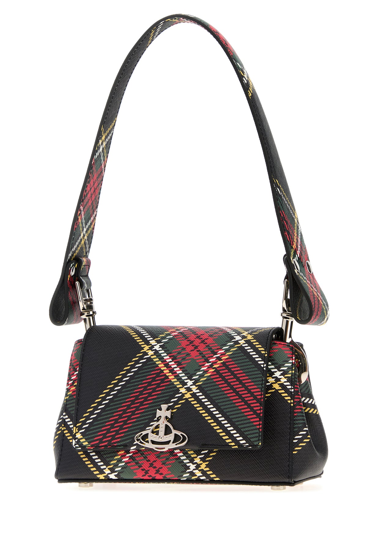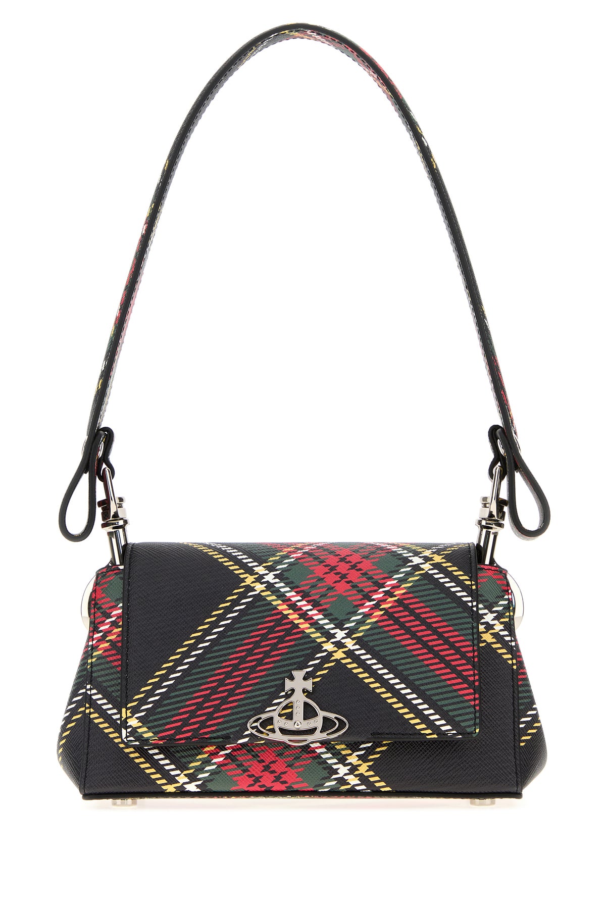 Borsa a spalla realizzata in pelle zigrinata stampata a motivo tartan arricchita da dettaglio metallico Orb sulla parte frontale.