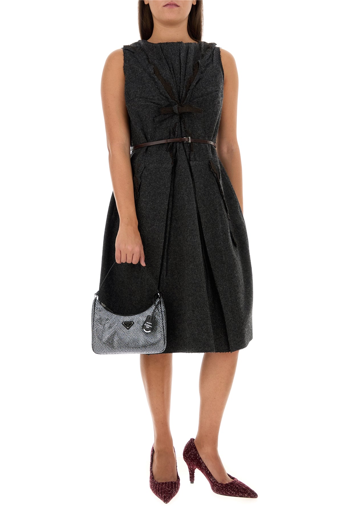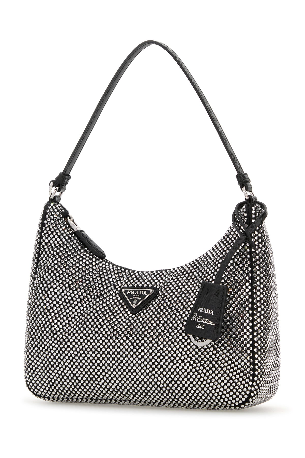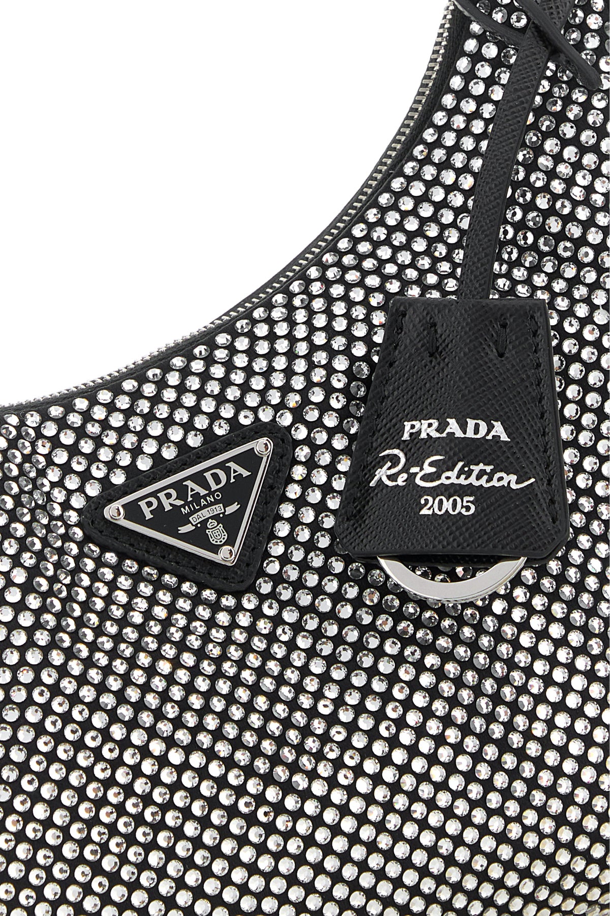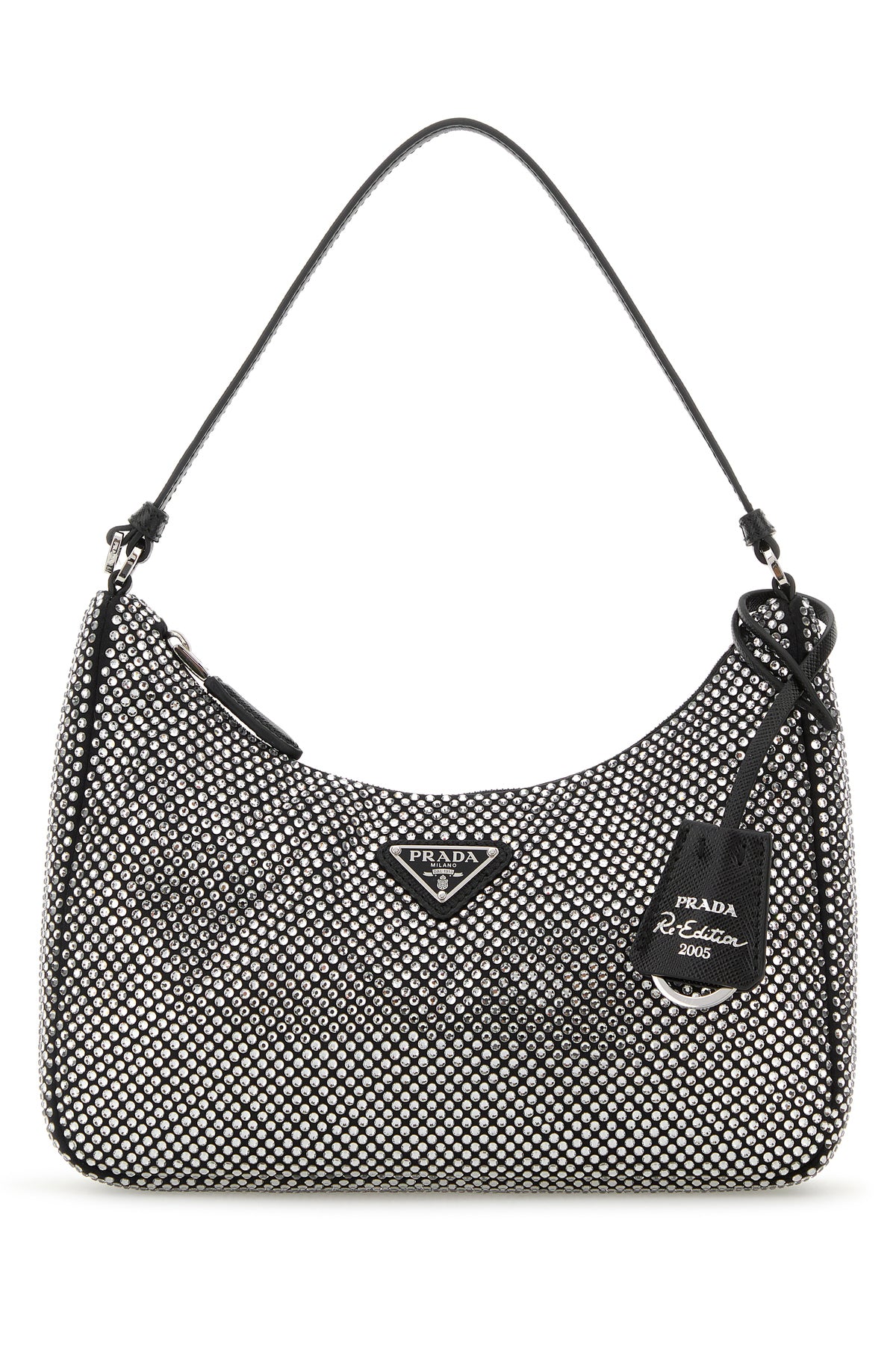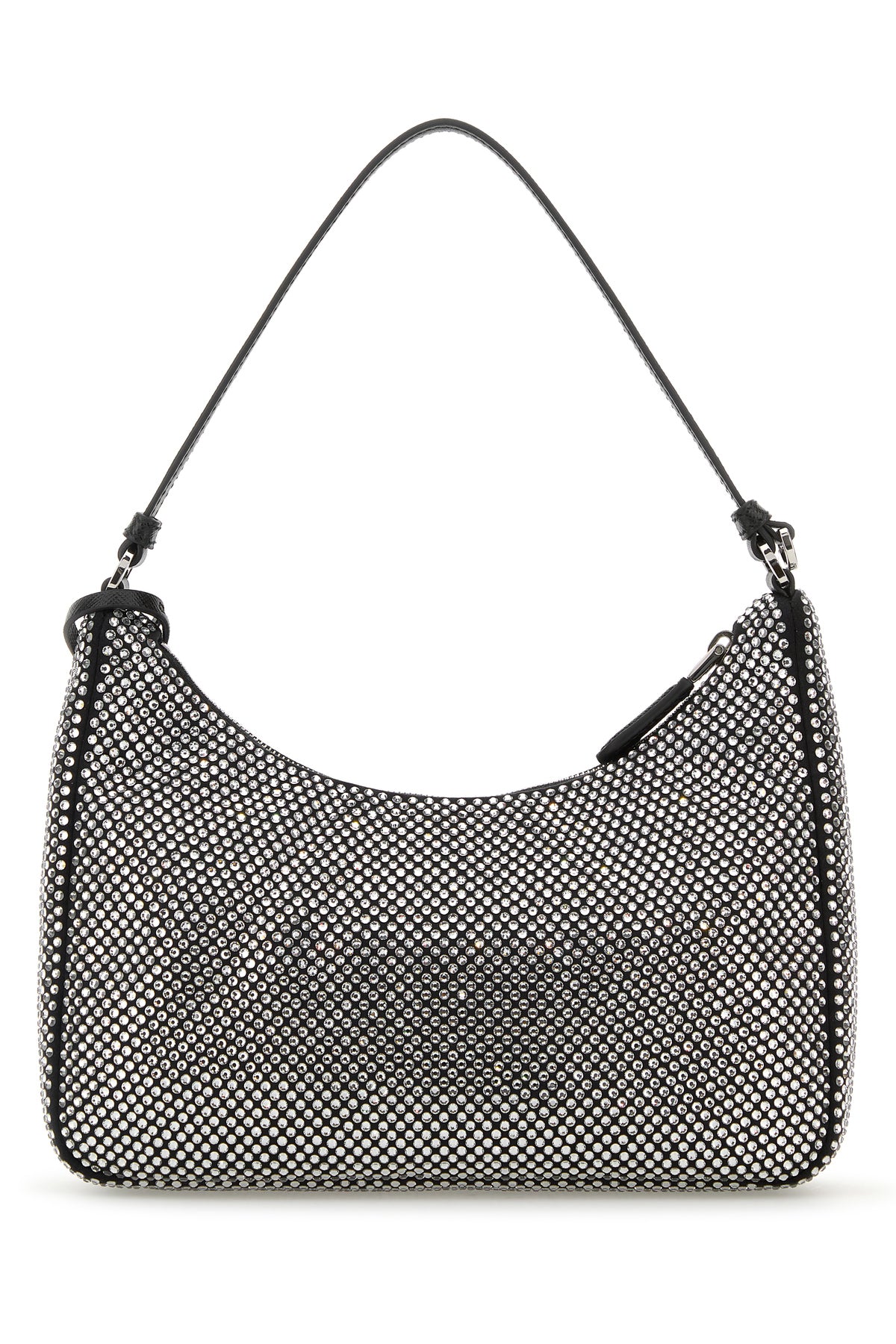 Borsa a spalla realizzata in raso interamente ricoperta di cristalli arricchita da iconico triangolo metallico logato sulla parte frontale.